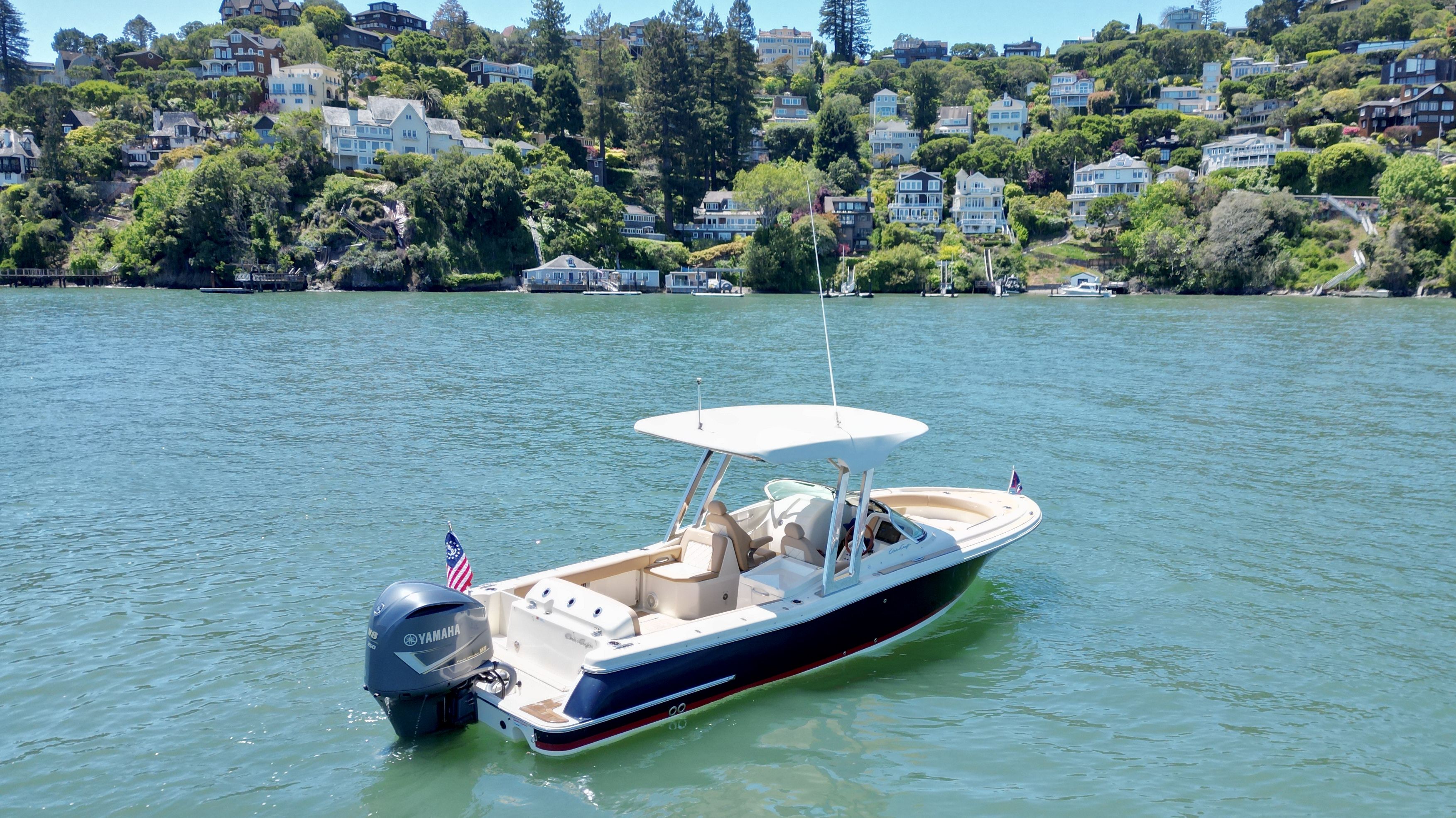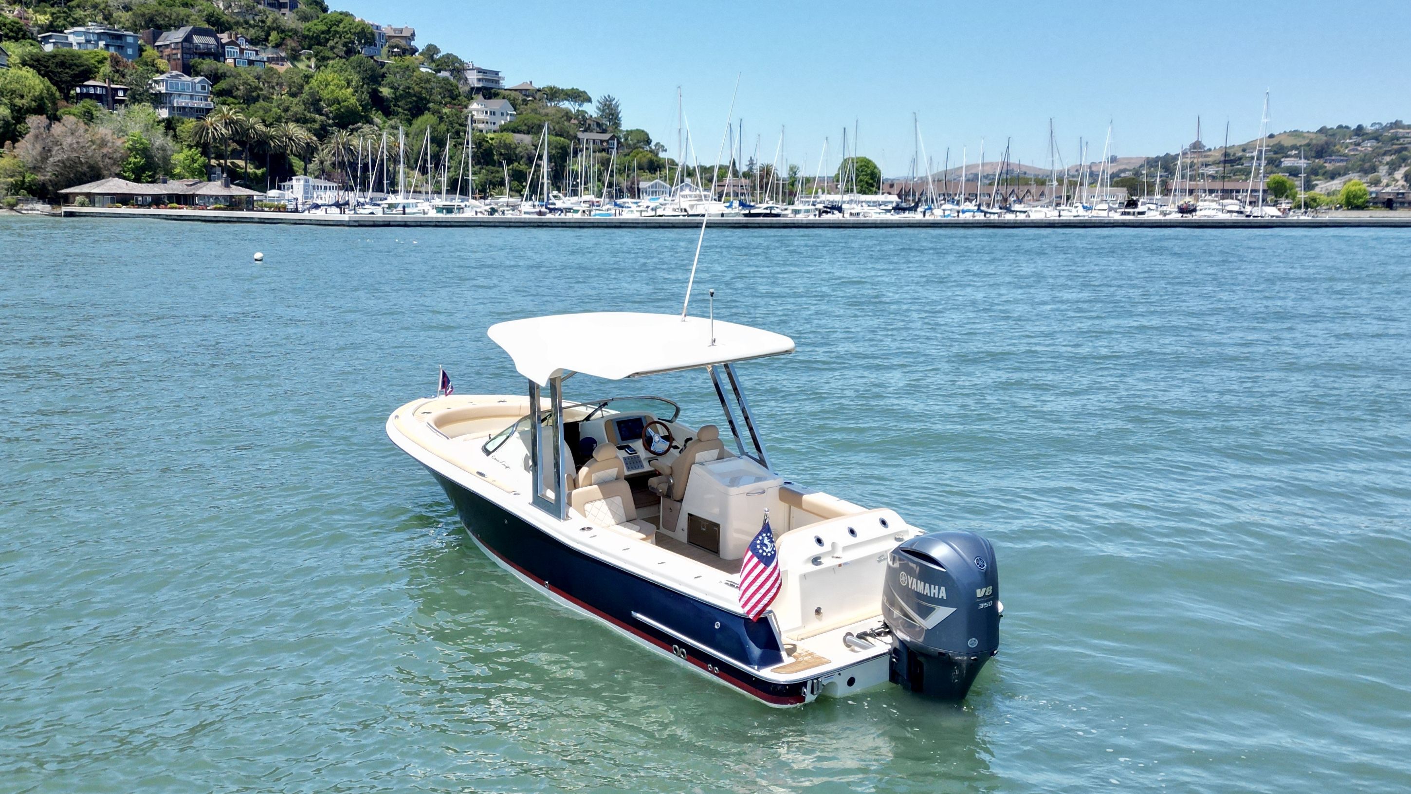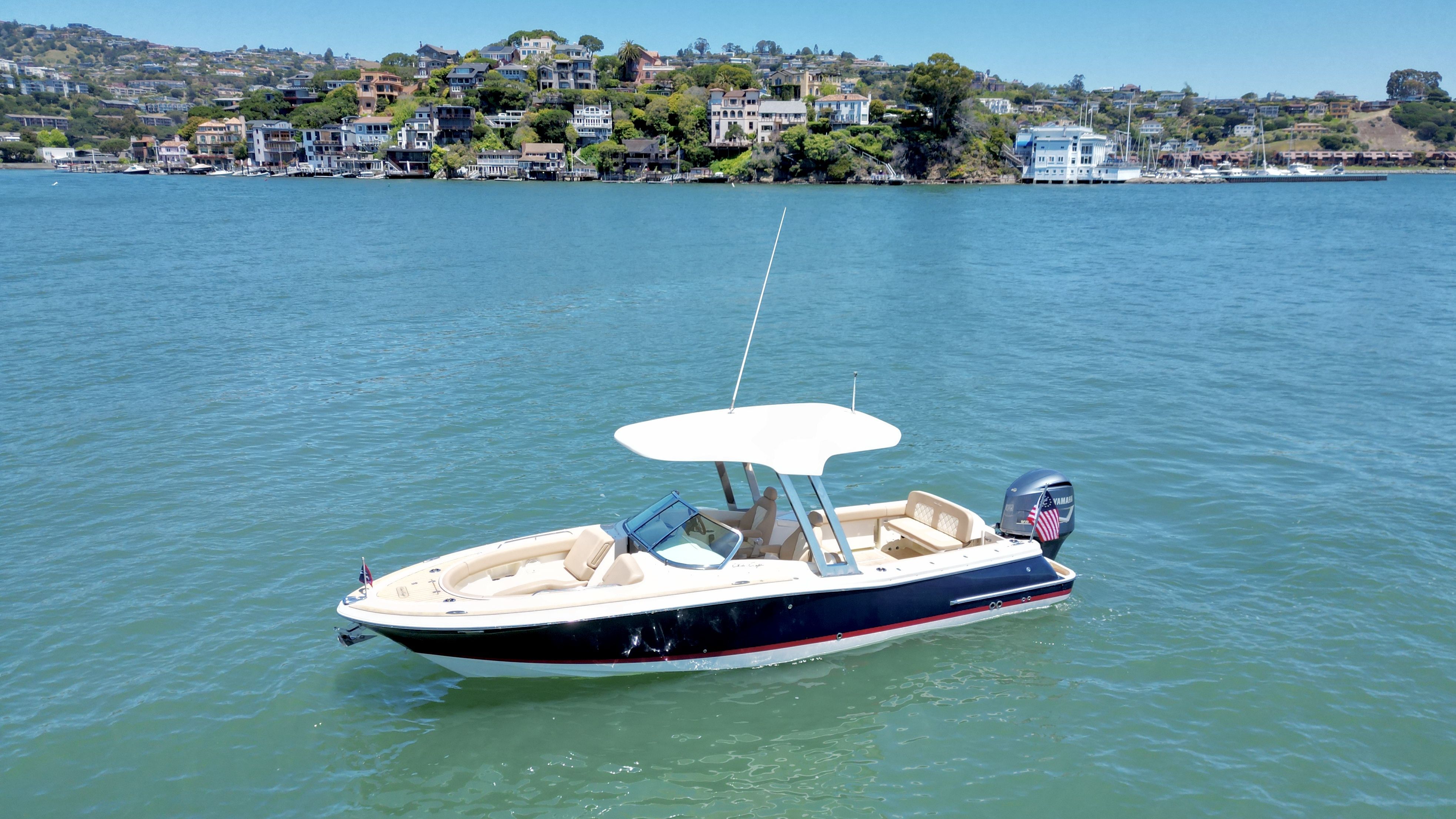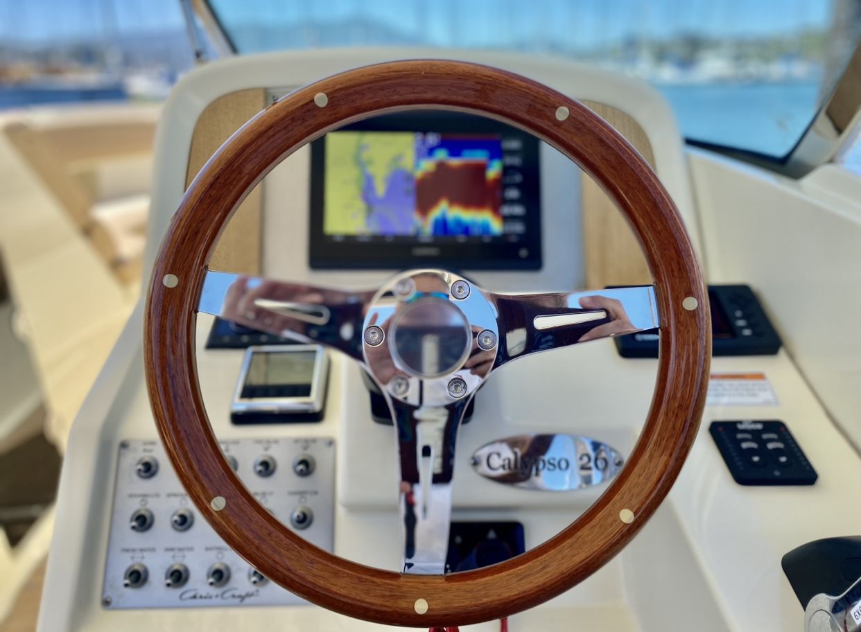 This beautiful red, white & blue Calypso 26 is stored out of the water and includes a custom