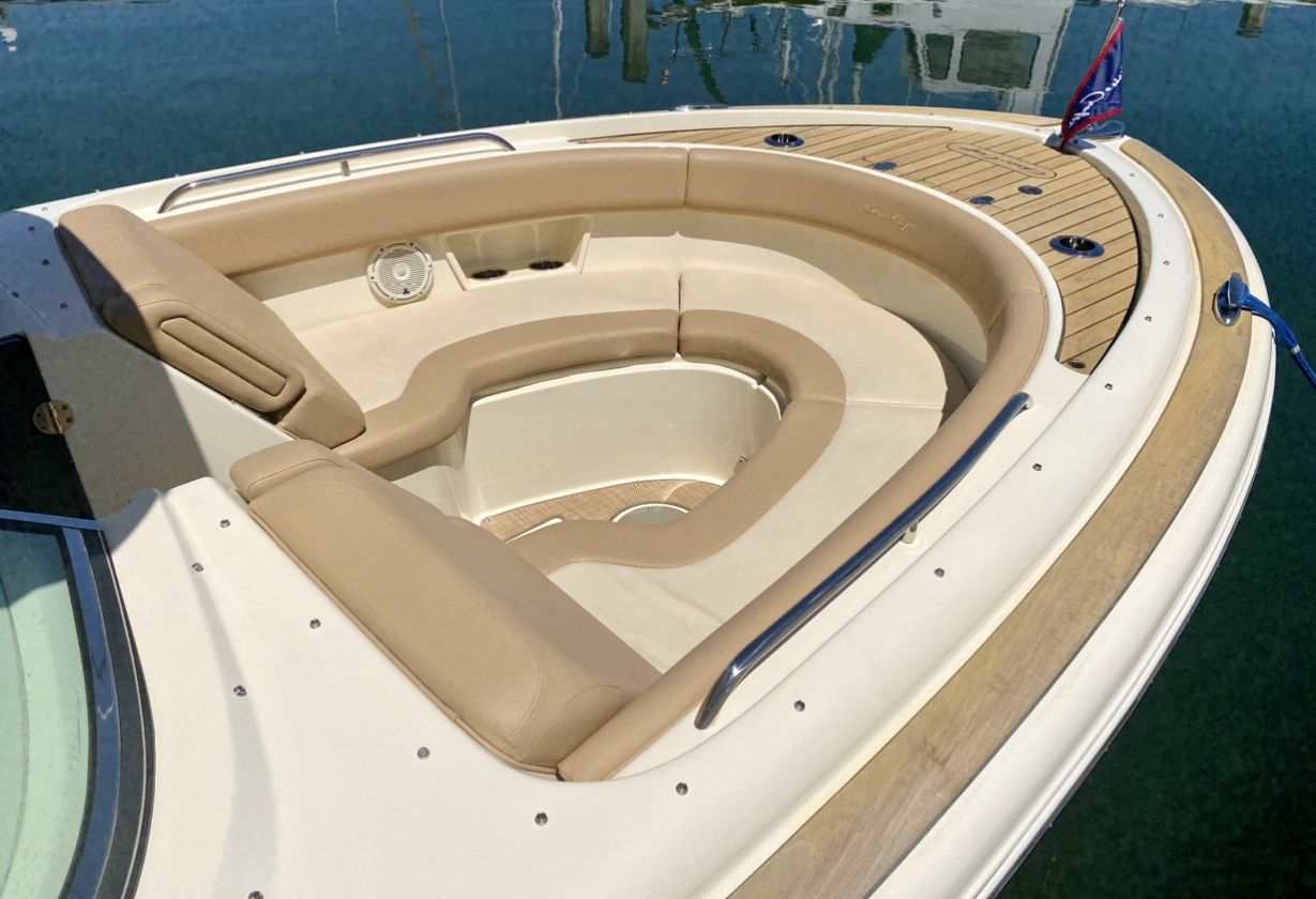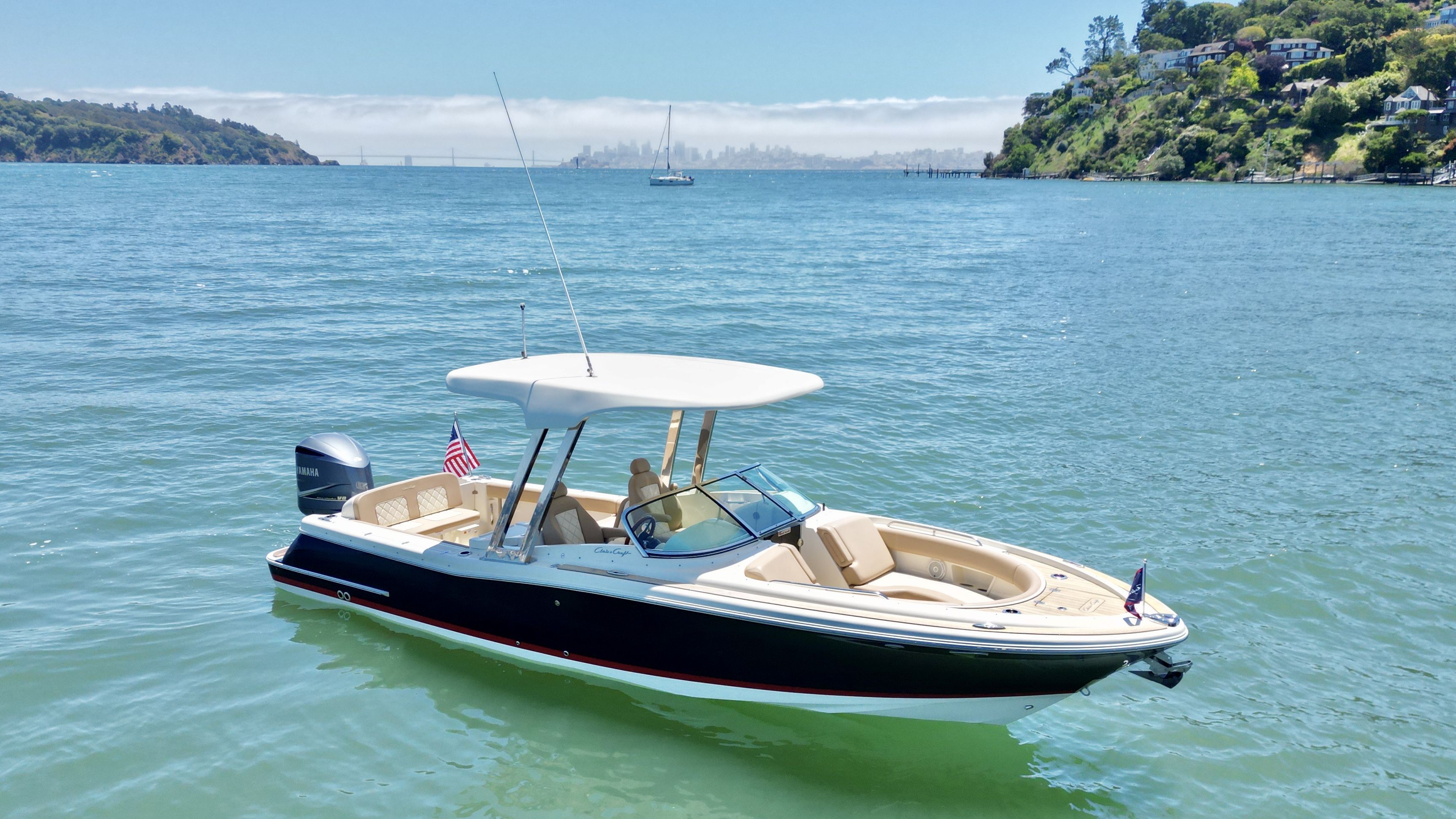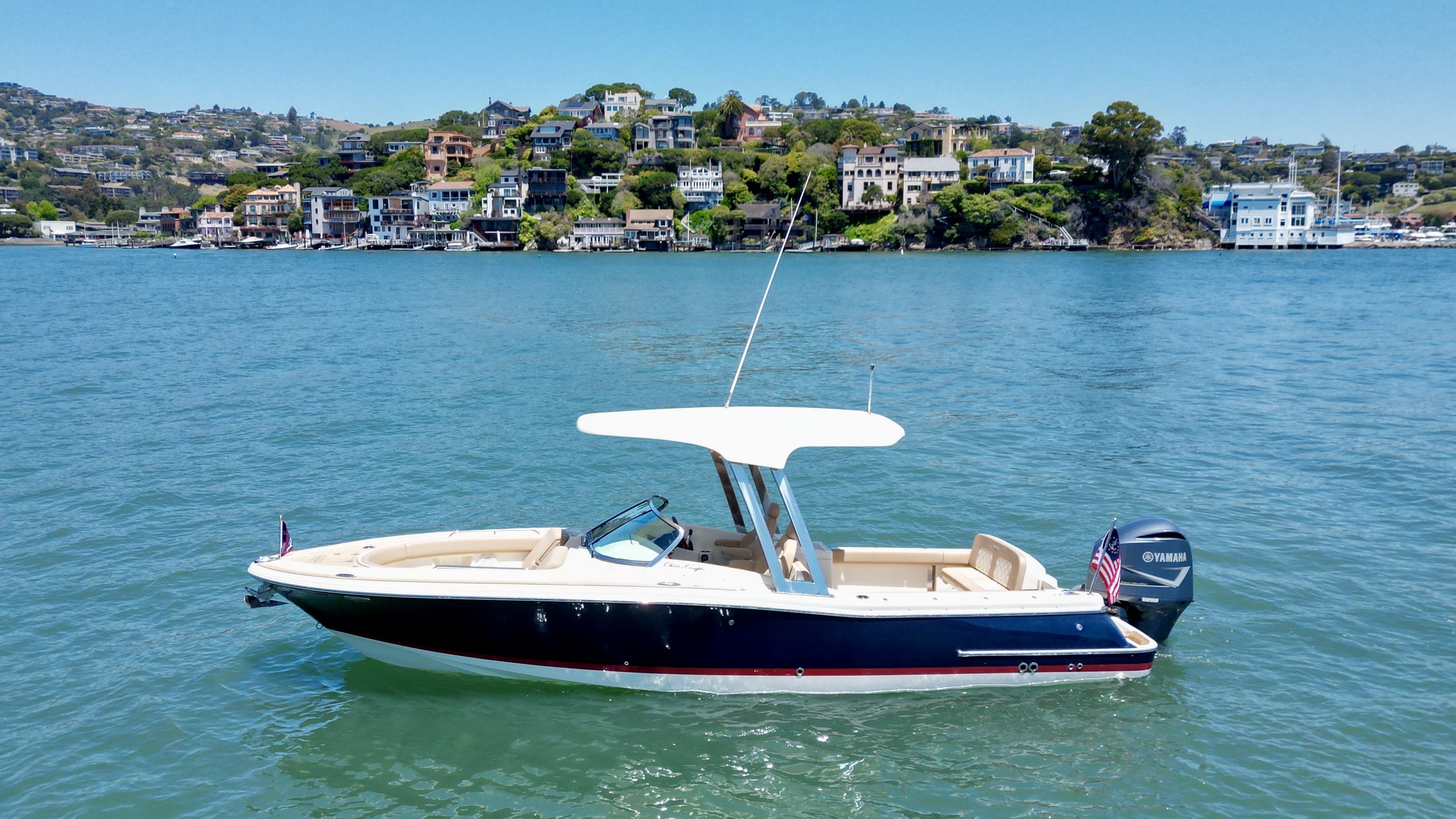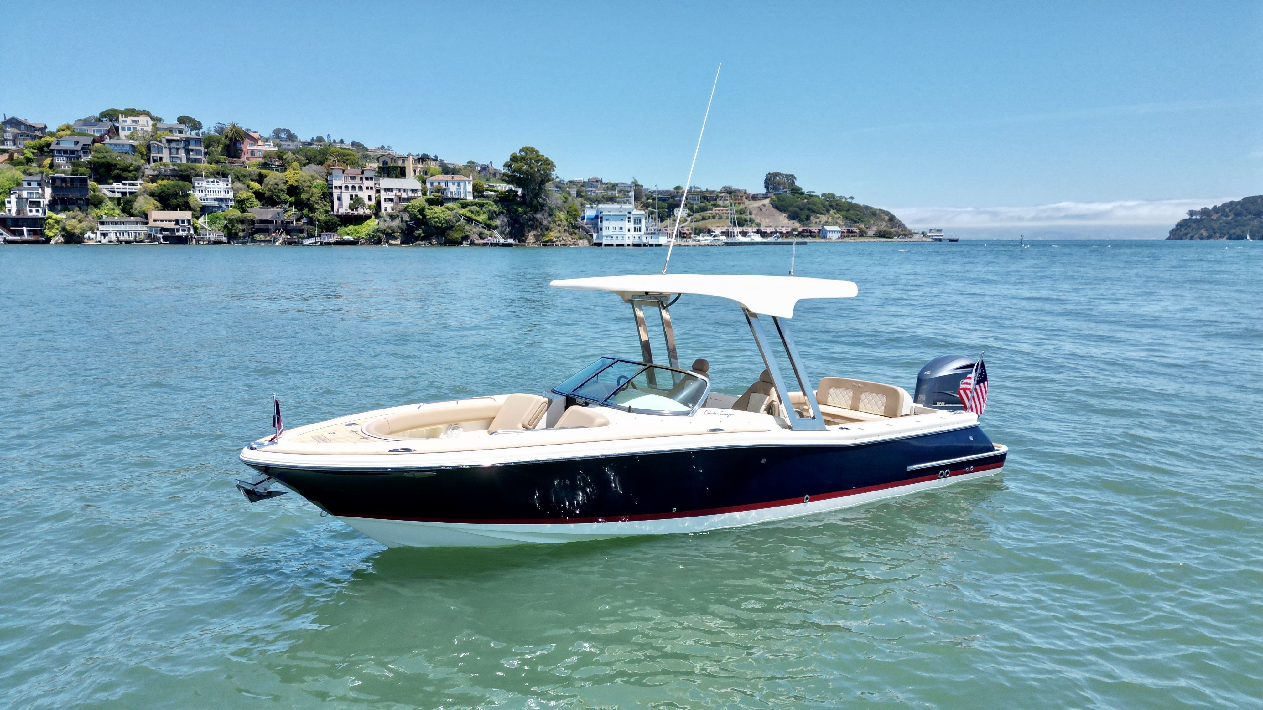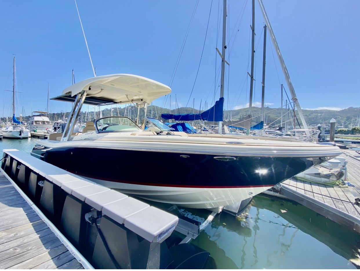 This beautiful red, white & blue Calypso 26 is stored out of the water and includes a custom