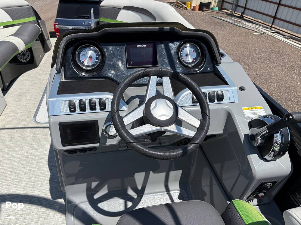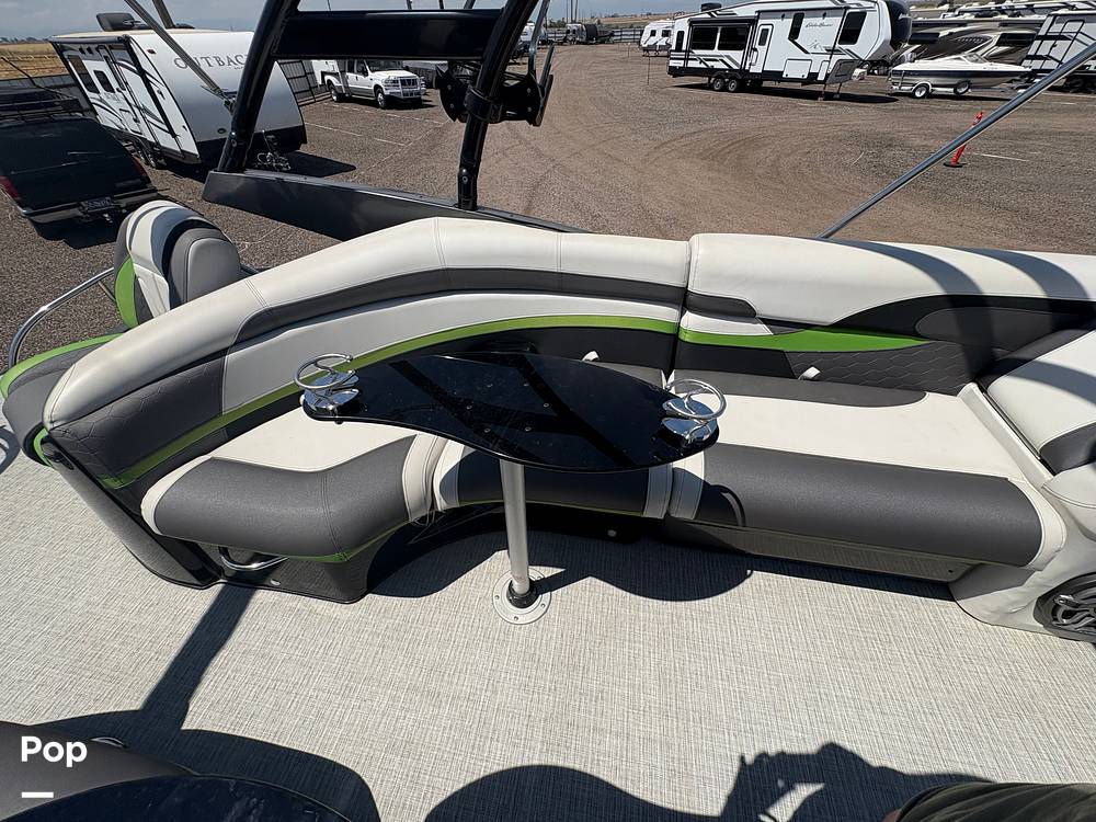 There is ample storage, including a central storage locker in the middle pontoon as well as storage under the seats. The sound system includes tower speakers, speakers that run the length of the boat and can be paired to your phone via Bluetooth.