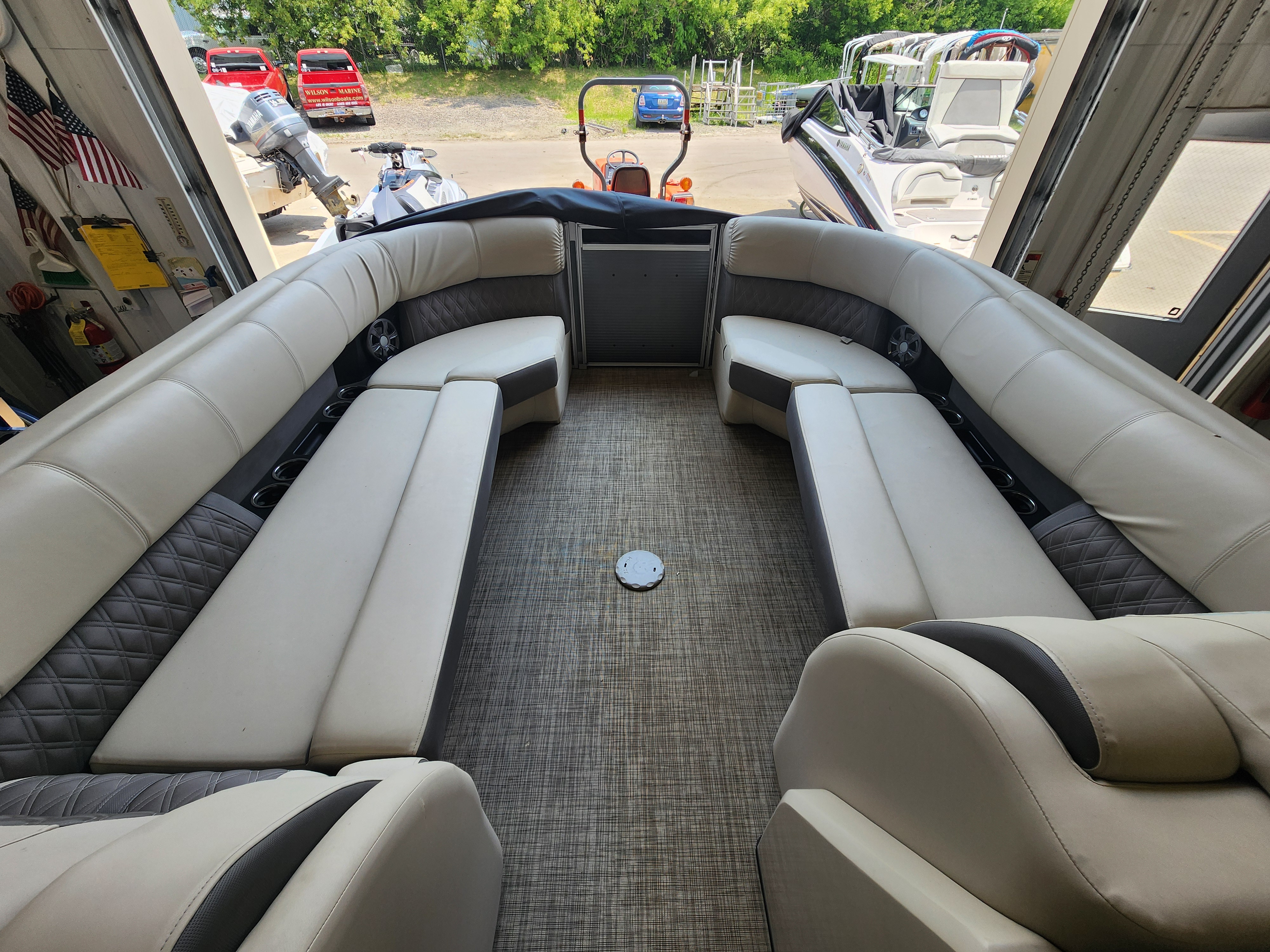 #1 SELLING SWINGBACK LAYOUT! Boat comes with full clip-on cover, bluetooth stereo with speakers, co-captains chairs, stainless steel rear railing, stainless steel ski tow bar, rear swim ladder, bimini top, docking lights, Lowrance fish finder in-dash, full seagrass vinyl flooring and much more!