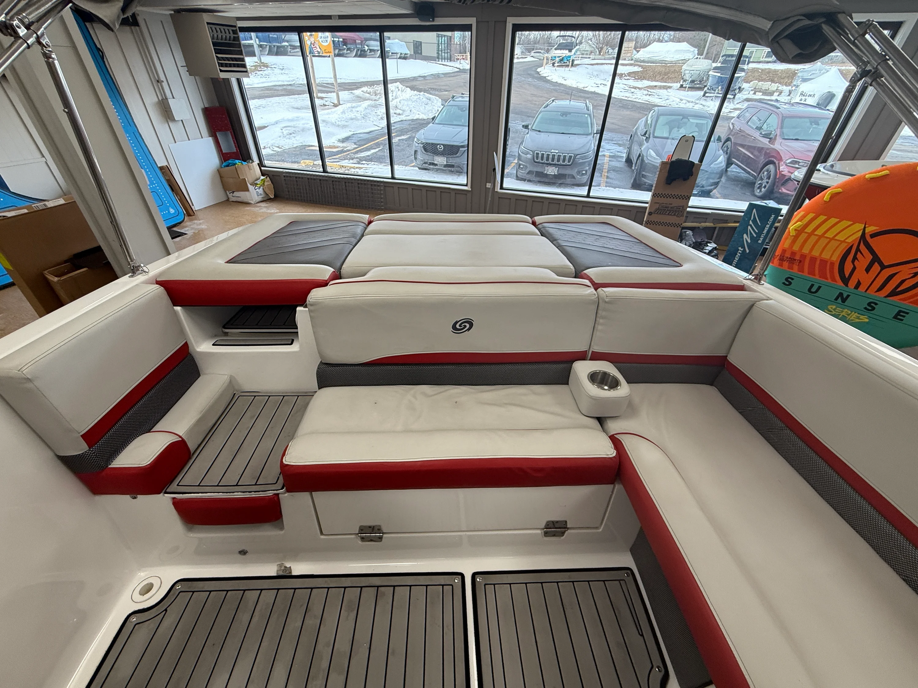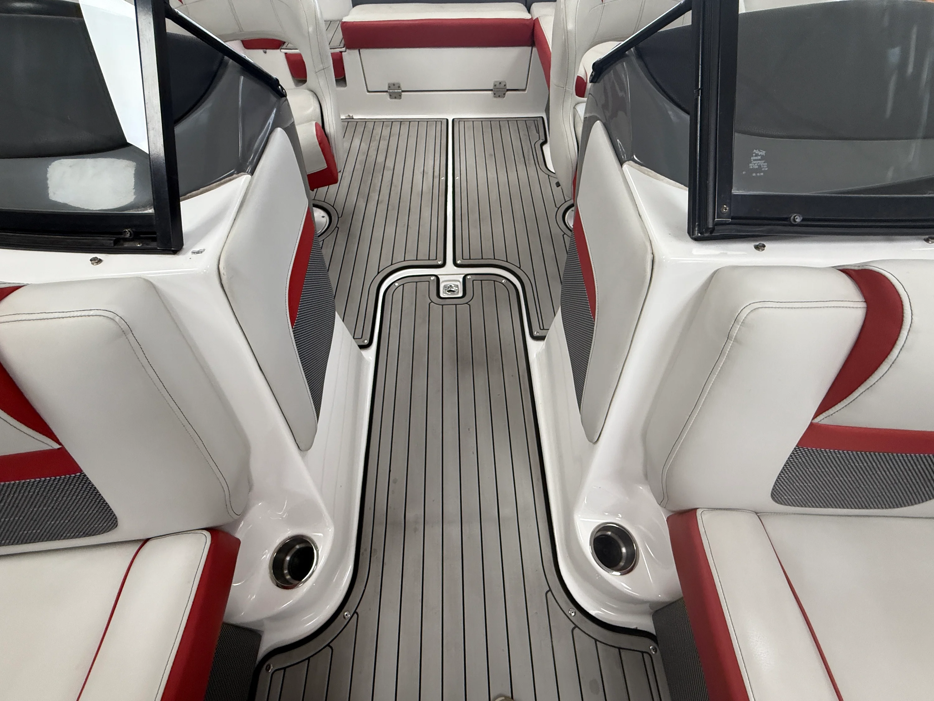 Cover, bimini, walk thru transom, fully enclosed windshield, Marine Mat flooring, bolster seats, stereo, fwd & rear swim ladders, Simrad & more!