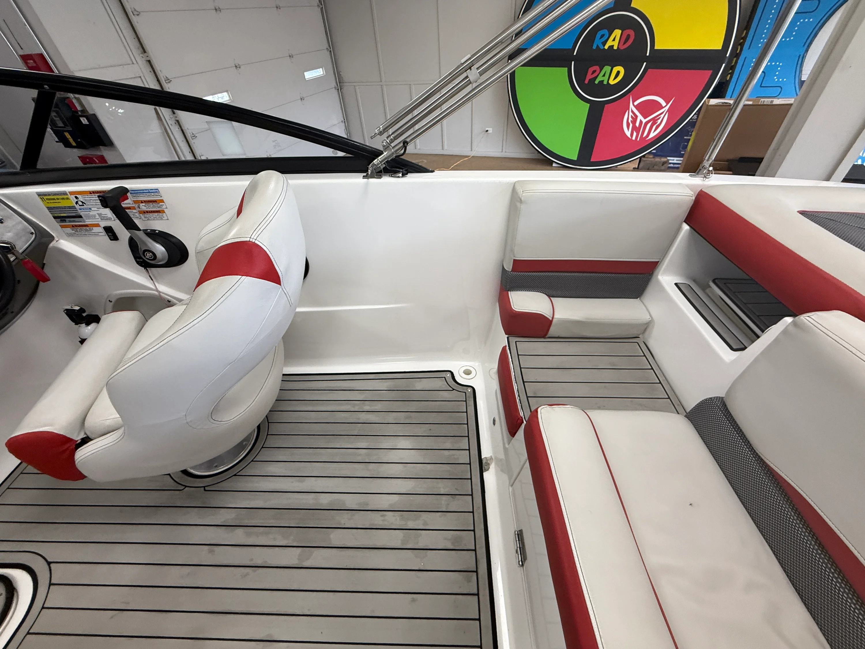 Cover, bimini, walk thru transom, fully enclosed windshield, Marine Mat flooring, bolster seats, stereo, fwd & rear swim ladders, Simrad & more!