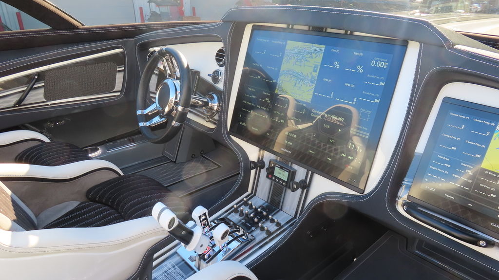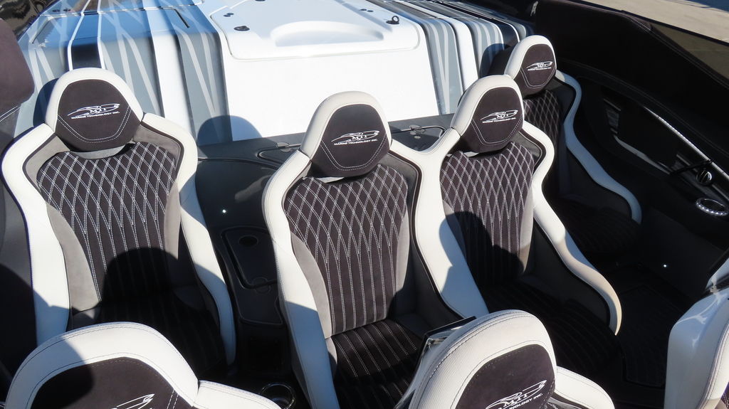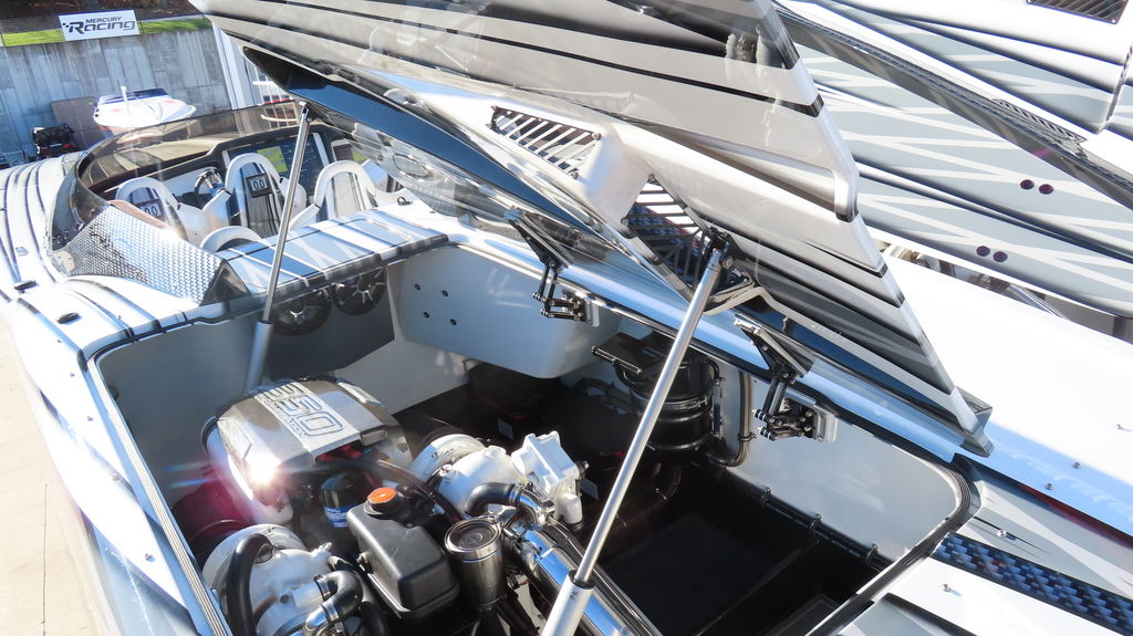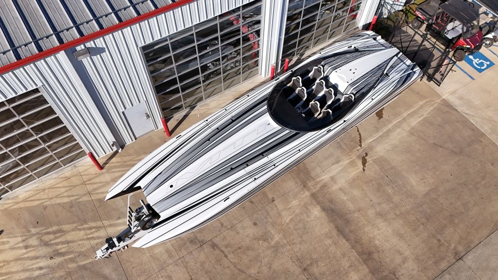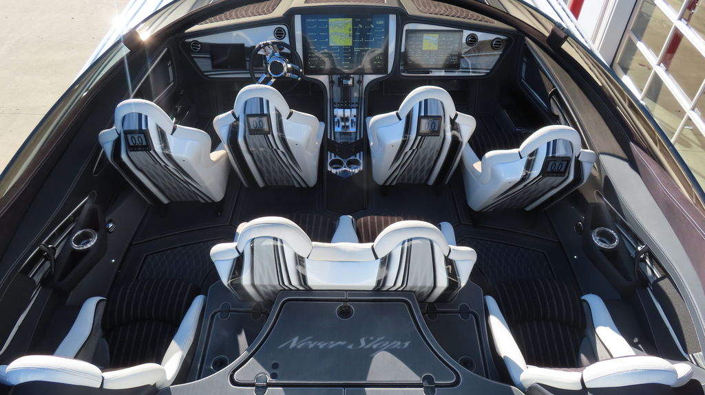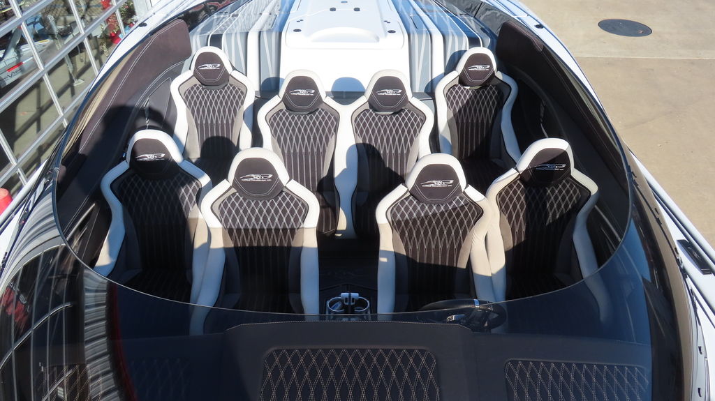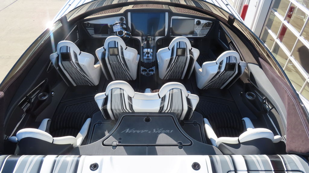Full Carbon Layup, Staggered Eight seater cockpit, Garmin centered in dash, Smartcraft Vesselview 903, Passenger 16' Garmin, (4) Garmin GPS in seatbacks for rear passengers, Fusion Stereo w/ Automatic pop-up speaker pods, power adjustable helm seats, Black out hardware package, flip-up bolsters for all seats, Sea Deck flooring, cockpit blowers with inverter A/C, Cockpit Sunshade, Alcantera Seat Accents, cockpit cover, Marine Concepts Dock Cover, and Flat Myco trailer included.