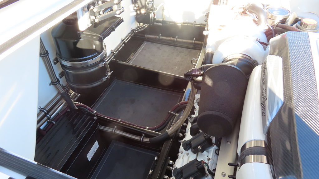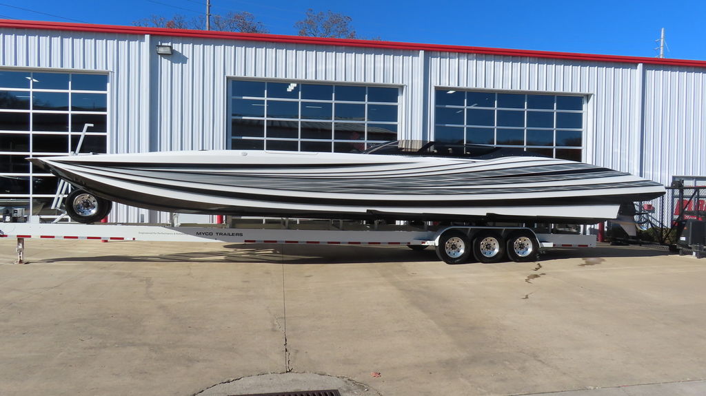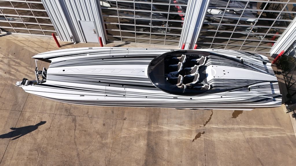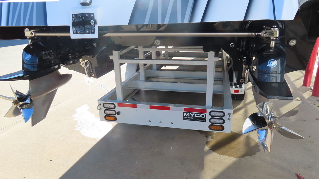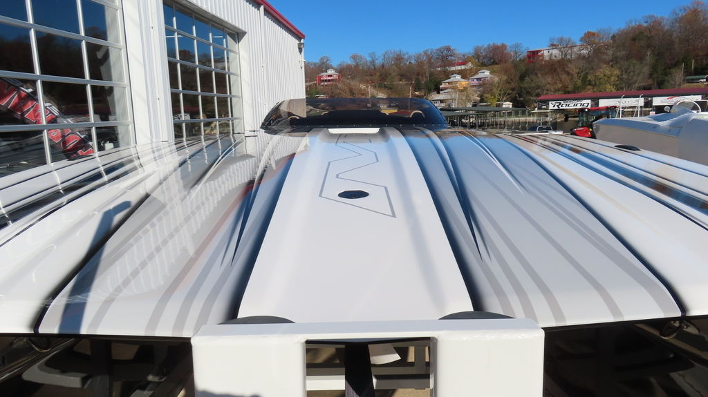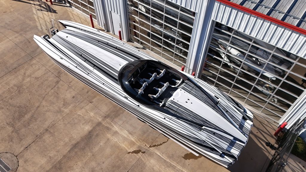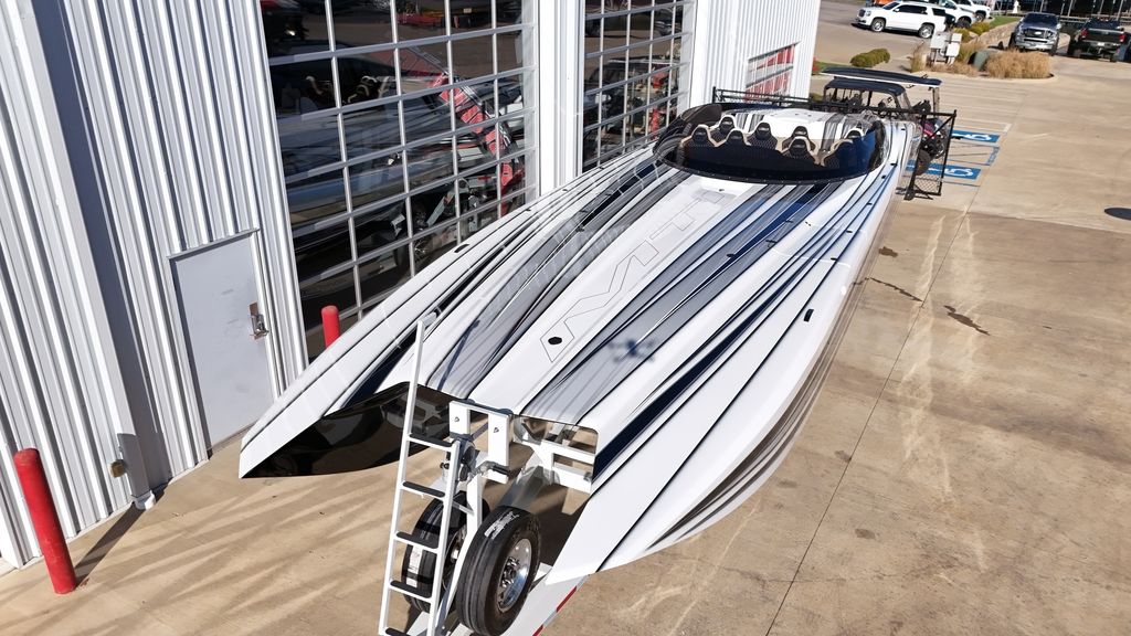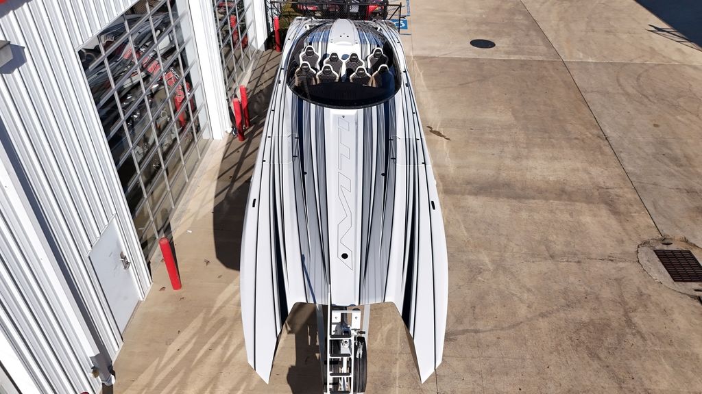 Full Carbon Layup, Staggered Eight seater cockpit, Garmin centered in dash, Smartcraft Vesselview 903, Passenger 16' Garmin, (4) Garmin GPS in seatbacks for rear passengers, Fusion Stereo w/ Automatic pop-up speaker pods, power adjustable helm seats, Black out hardware package, flip-up bolsters for all seats, Sea Deck flooring, cockpit blowers with inverter A/C, Cockpit Sunshade, Alcantera Seat Accents, cockpit cover, Marine Concepts Dock Cover, and Flat Myco trailer included.