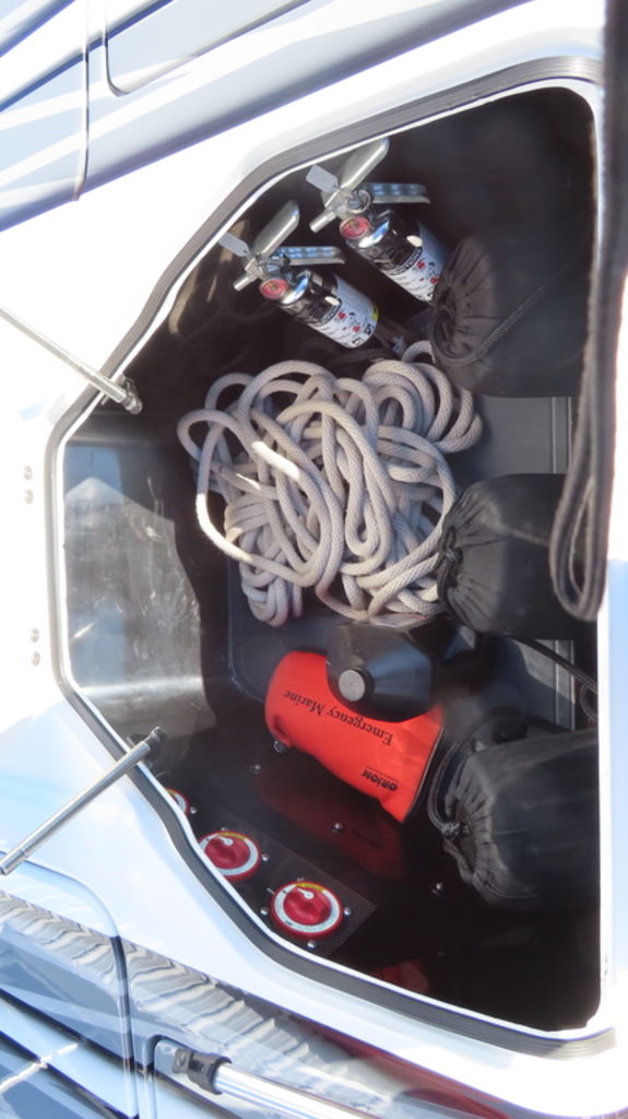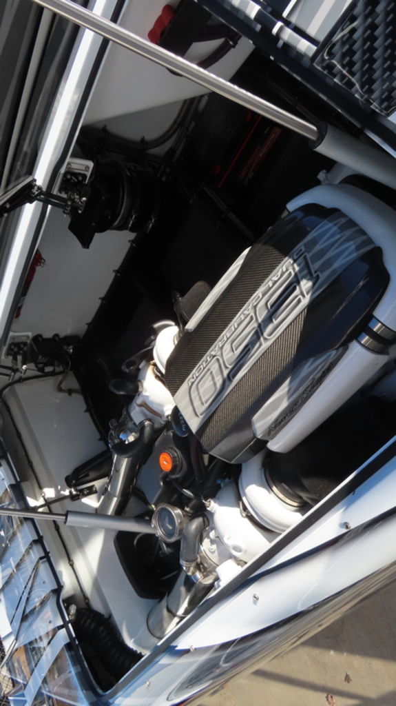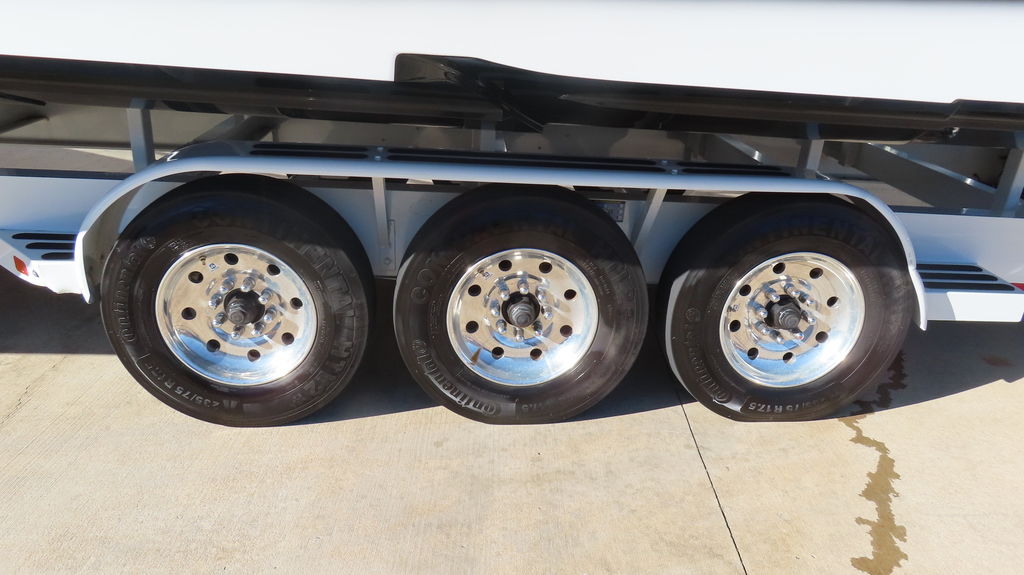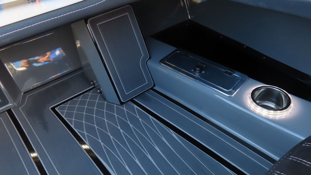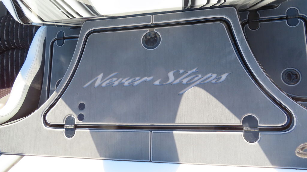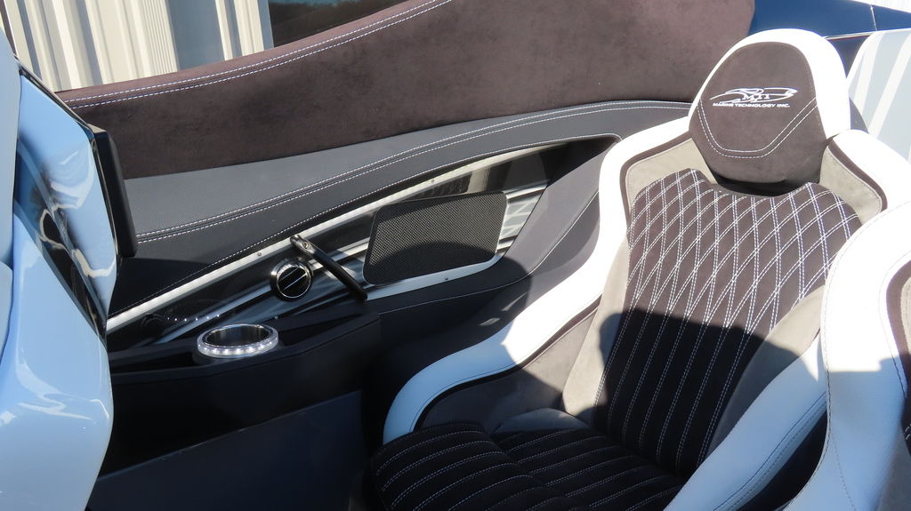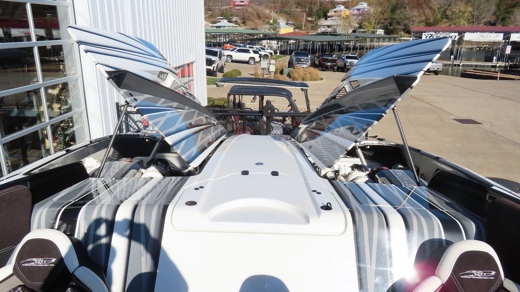 Full Carbon Layup, Staggered Eight seater cockpit, Garmin centered in dash, Smartcraft Vesselview 903, Passenger 16' Garmin, (4) Garmin GPS in seatbacks for rear passengers, Fusion Stereo w/ Automatic pop-up speaker pods, power adjustable helm seats, Black out hardware package, flip-up bolsters for all seats, Sea Deck flooring, cockpit blowers with inverter A/C, Cockpit Sunshade, Alcantera Seat Accents, cockpit cover, Marine Concepts Dock Cover, and Flat Myco trailer included.