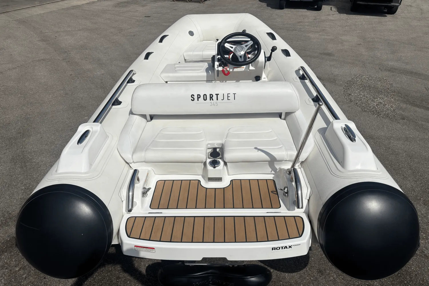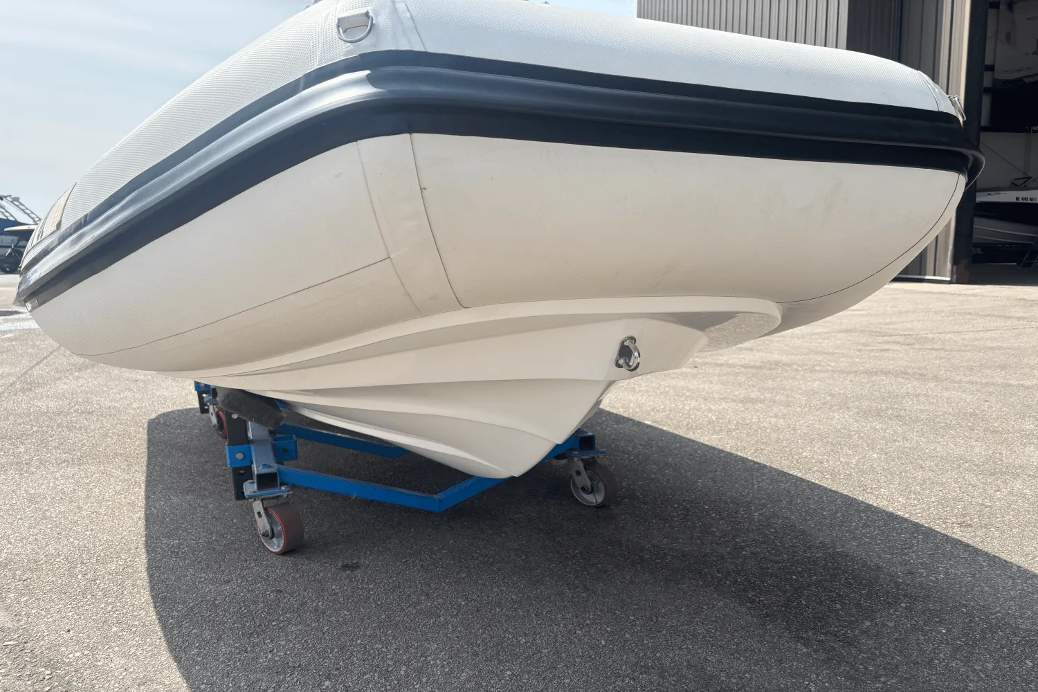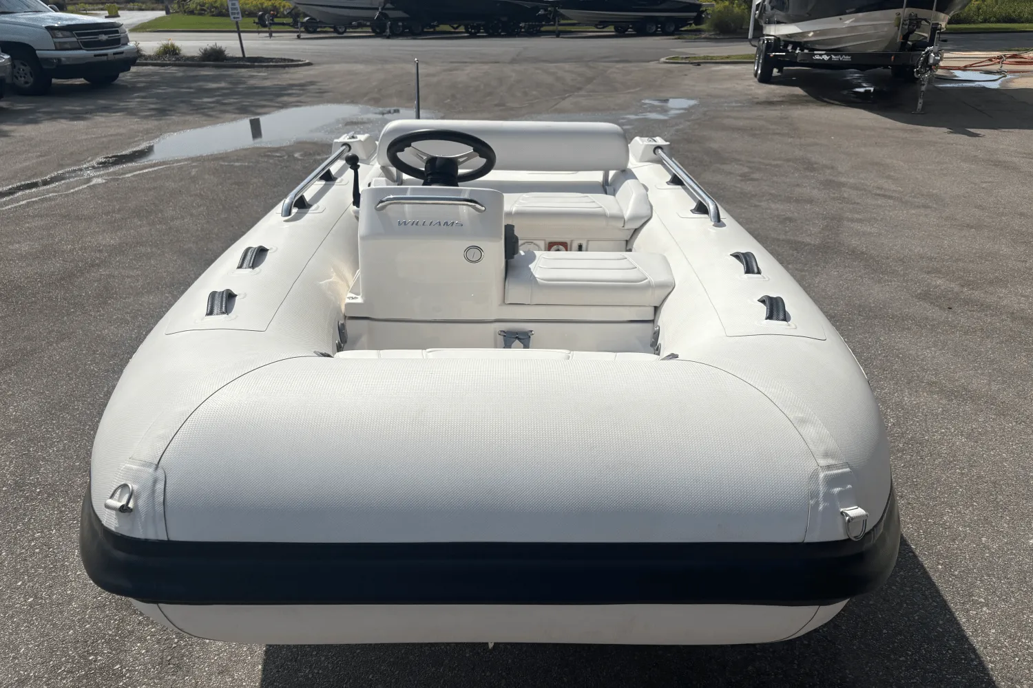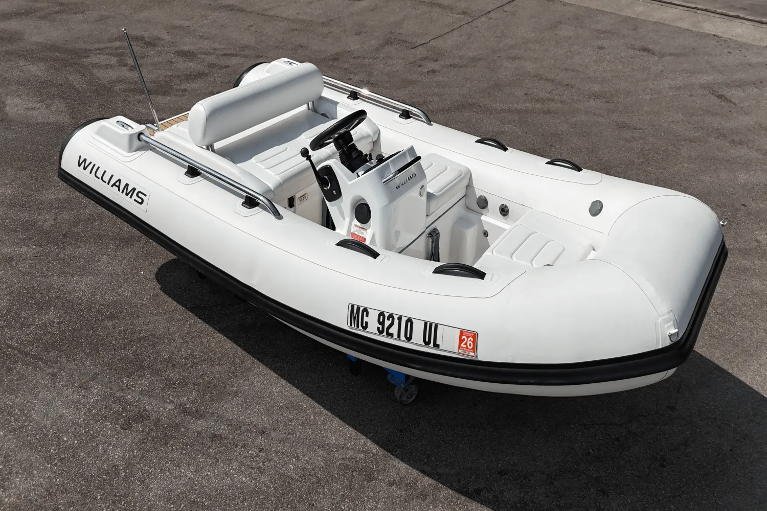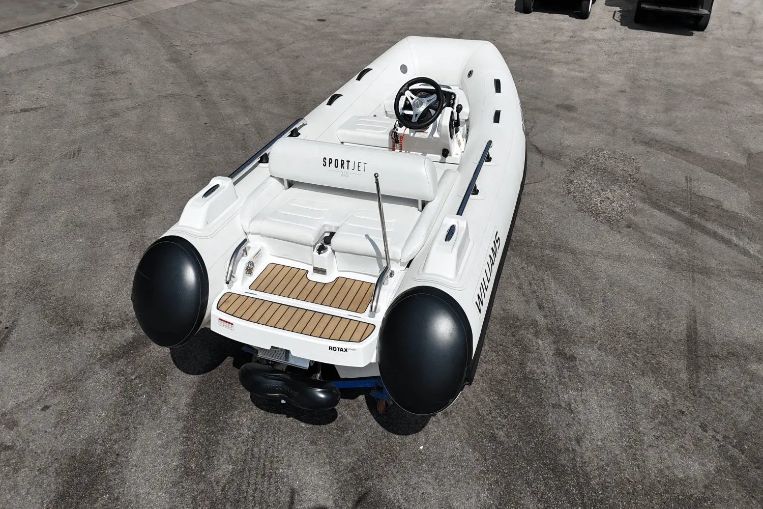 Finished in Carbon White tubes with white vinyl upholstery and teak decking, it’s as stylish as it is fast—top speed: 46 mph. Features include: Teak decking Carbon White tubes White vinyl upholstery Premium audio system LED deck lights Depth sounder Two factory covers Factory tie-down kit A rare opportunity to own a like-new, high-spec Williams 395 ready for immediate delivery.