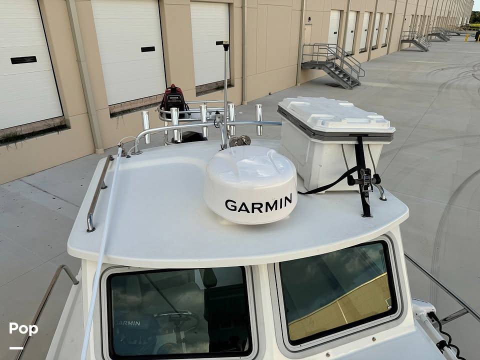 Up top, the boat is fitted with rod holders and a mounted Honda generator for offshore power, included in the sale. The generator can run the cabin AC, making hot days on the water more comfortable. A large Igloo cooler is mounted on the roof rack, ideal for keeping drinks cold or icing down your catch. The owner also installed lighting in all the right places, including inside the custom livewell.