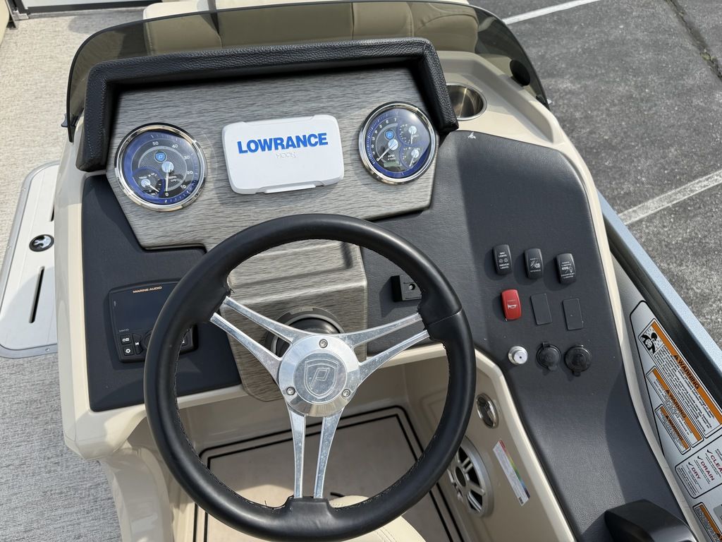Features Include: Full Mooring Cover, Self Retracting Swim Ladder, Lowarance Fish/Depth Finder, Cockpit Table, Removable BBQ Grill, RGB LED Interior Lighting, Extended Rear Swim Platform, Ski-Tow Bar, Raised Driver's Helm, Driver Seat Flip-Up Bolster, Marine Audio Bluetooth Stereo, Vinyl Weave Flooring, On/Off Battery Switch, In-Floor Ski Locker, LED Docking Lights and Stainless Steel Prop.