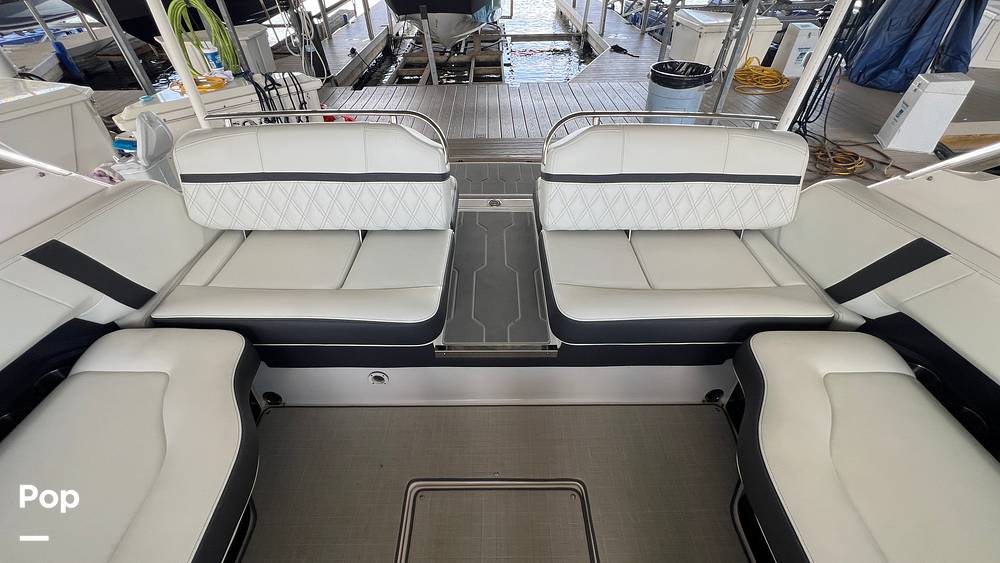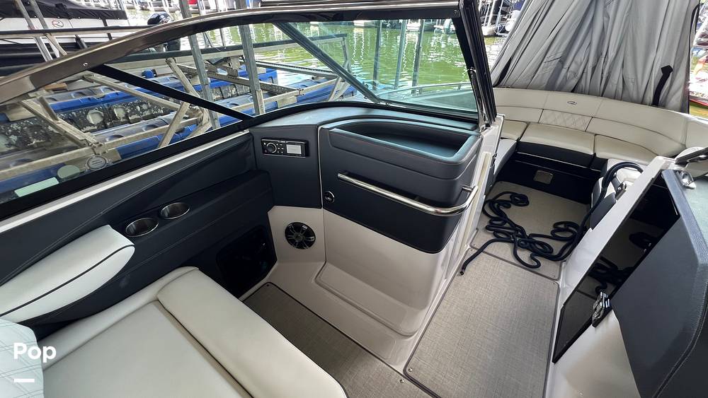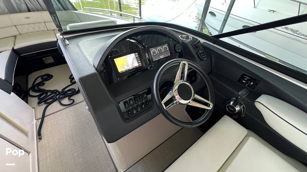 The open bow area, complete with filler cushions, is a perfect spot for sunbathing or relaxing, while the cockpit is designed for entertaining. There are beverage holders throughout the boat and a Furion sound system.