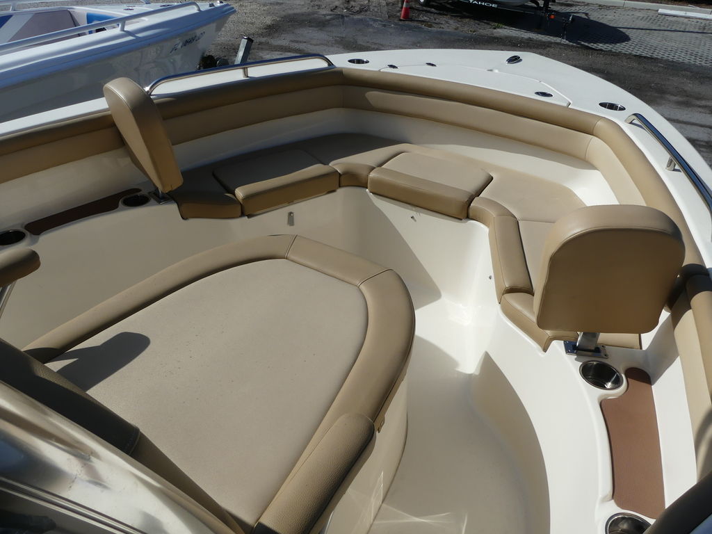 The 215 XSF is built on Scout’s revolutionary fuel saving NuV3 hull design, while the deck offers ample standard amenities for everything from serious fishing to comfort cruising. Built with 100% hand-laid fiberglass, the boat boasts a wide comfortable beam of 8’ 6” with an overall length of 21’ 6”. A notable standard feature onboard the 215 includes not only the forward seating in the bow, but also a forward sun lounge/coffin box complete with a cushion.