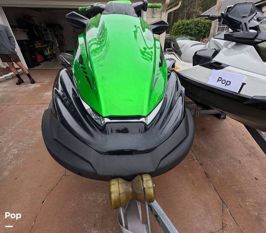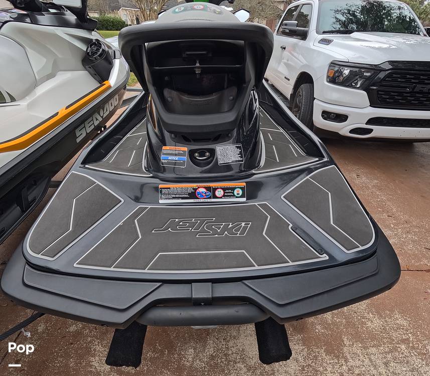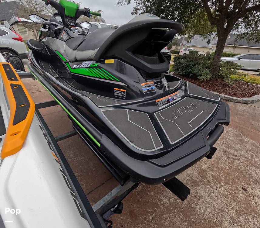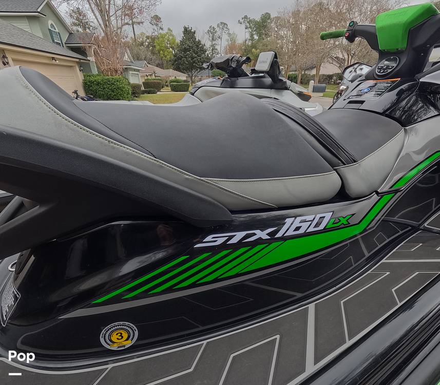 The 2020 Kawasaki Jet Ski STX 160 LX is a three-person, non-supercharged personal watercraft with a 1498 CC, four-cylinder engine that produces about 160 horsepower. The Kawasaki has an agile, entry-level ride, it boasts a 20.6-gallon fuel tank, 35 gallons of storage, and a length of just over 10-feet.