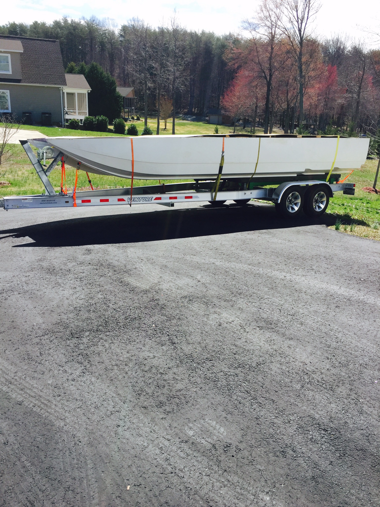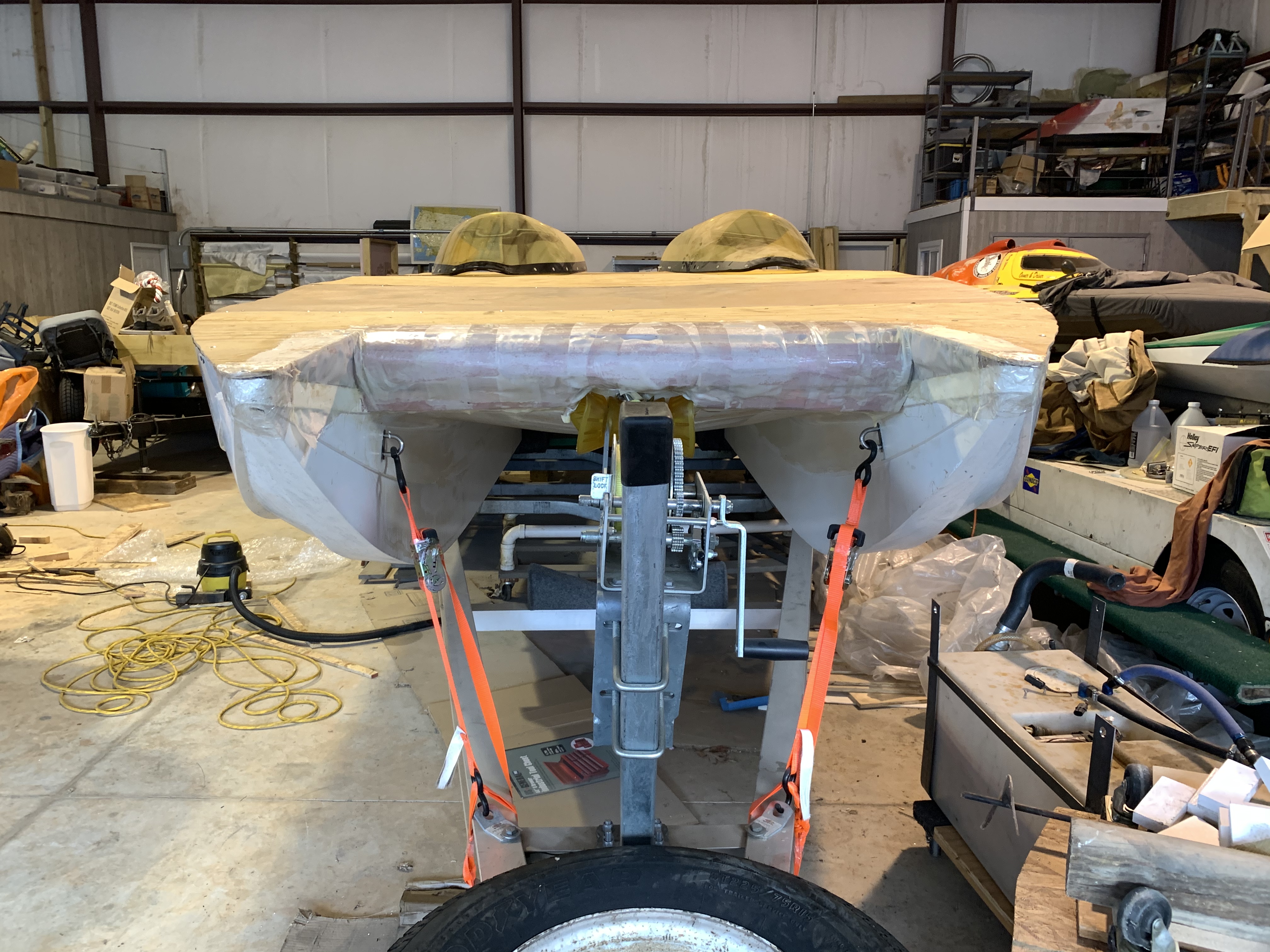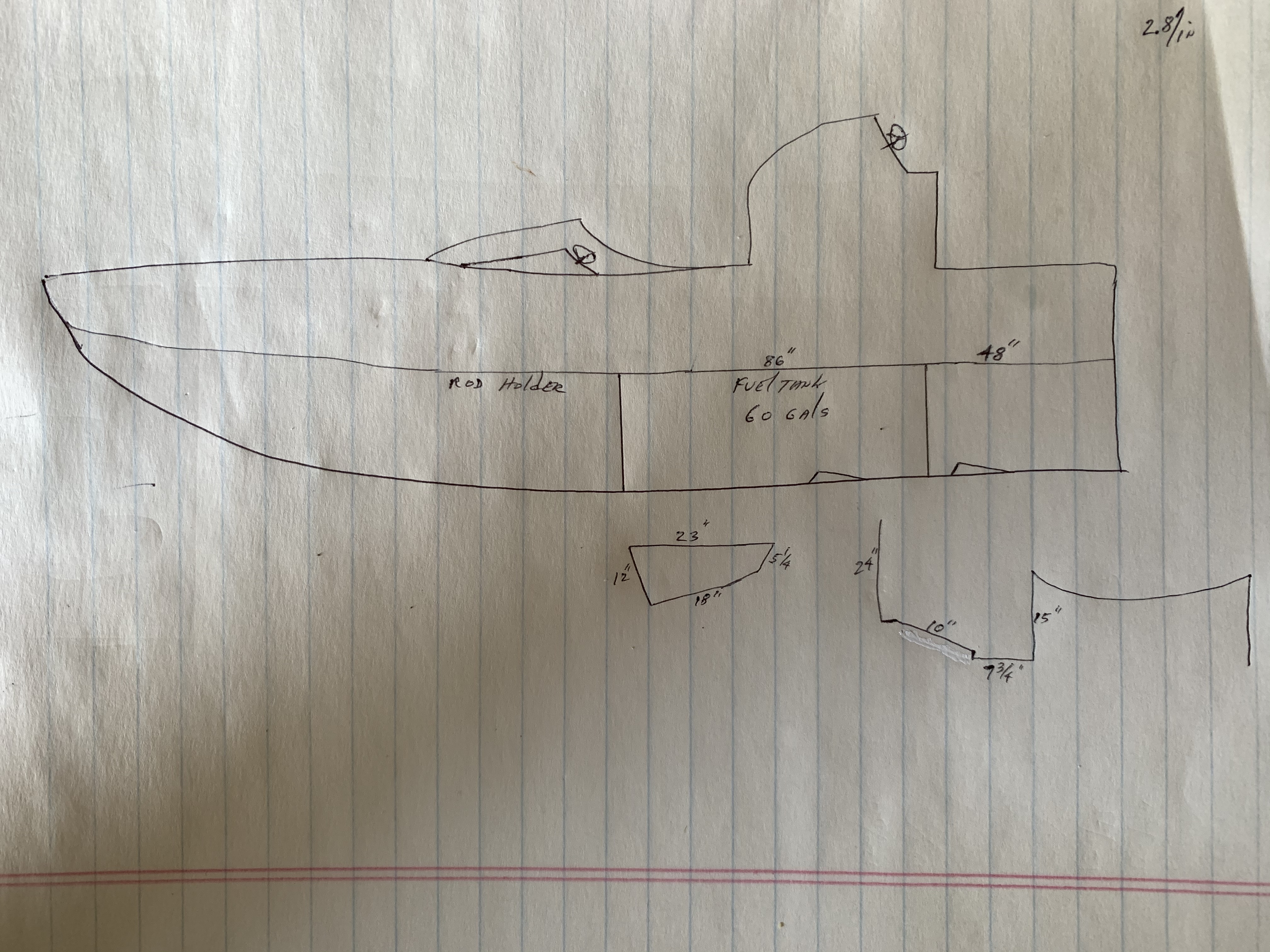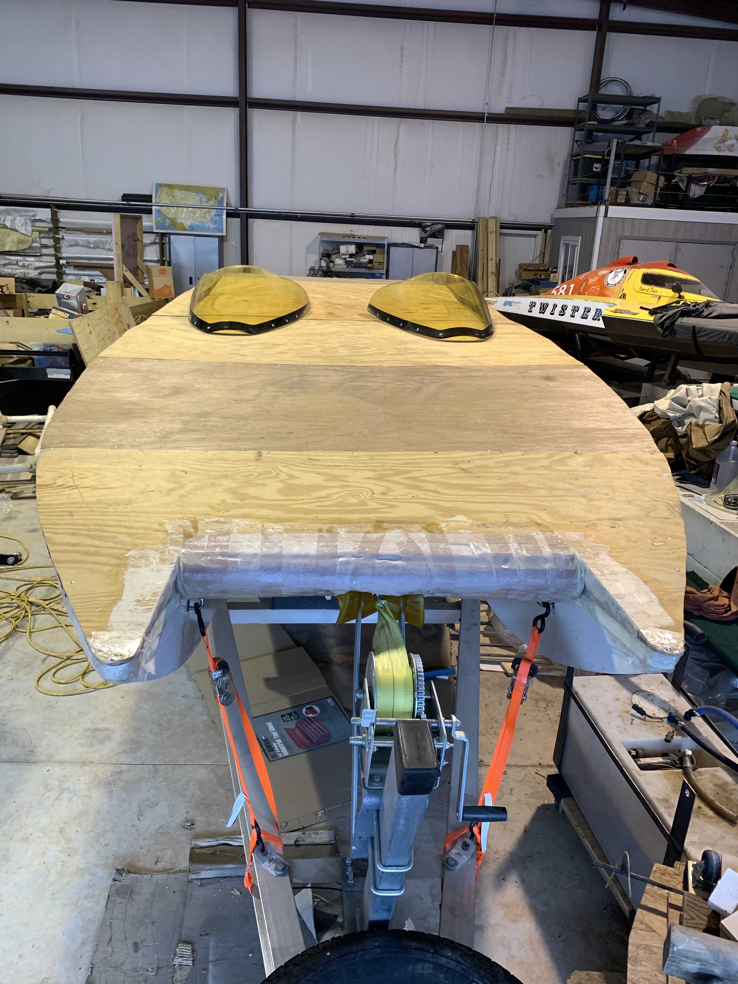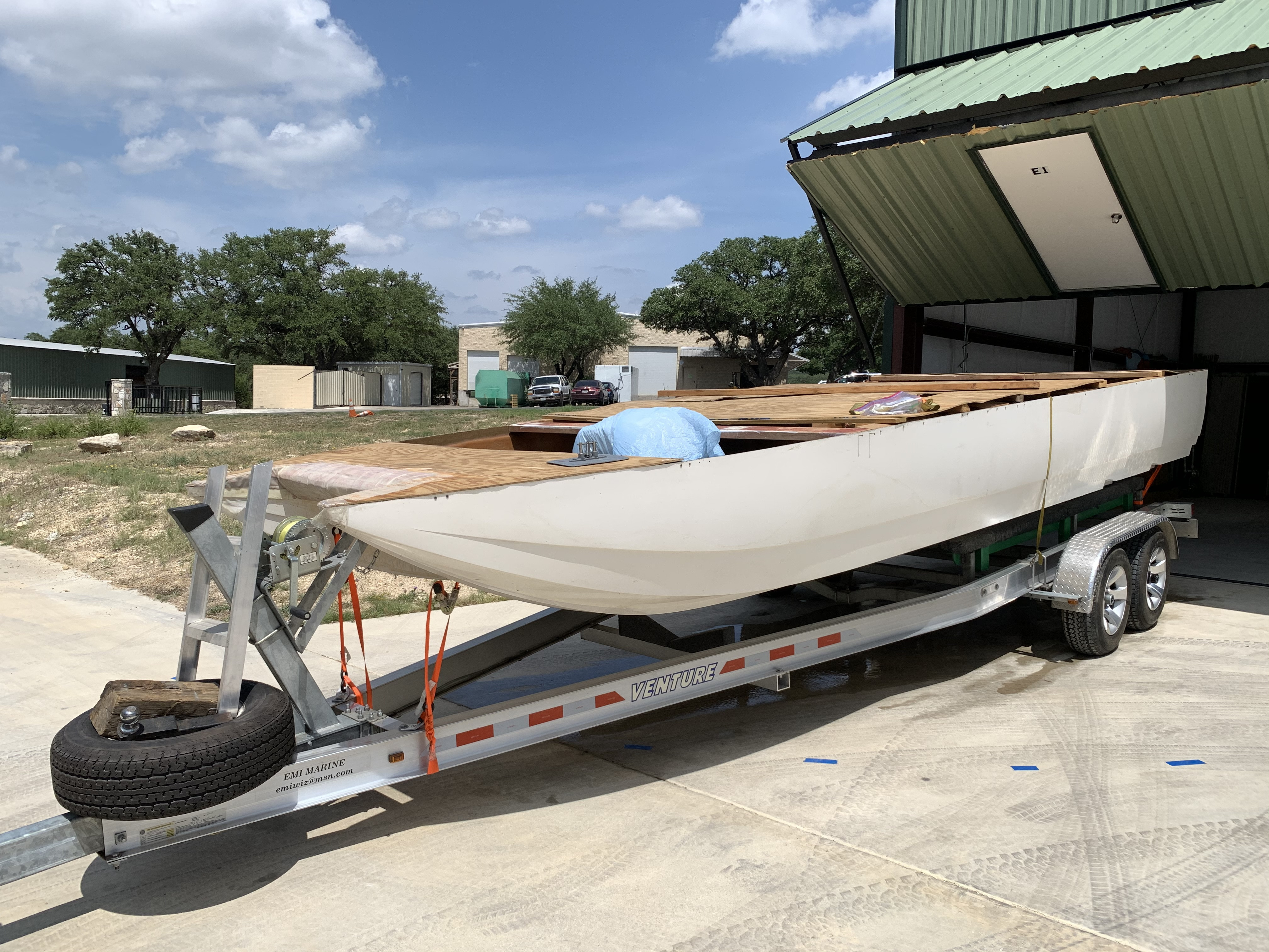 This is special project to be undertaken by someone wanting a go fast pleasure catamaran or center console fish boat. True F-16 Quarter Canopies with two 60 gal aluminum fuel tanks. Twin outboards or a big block would work great with this boat and would run over 85 mph.