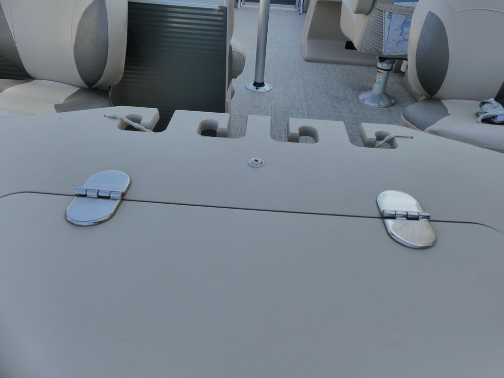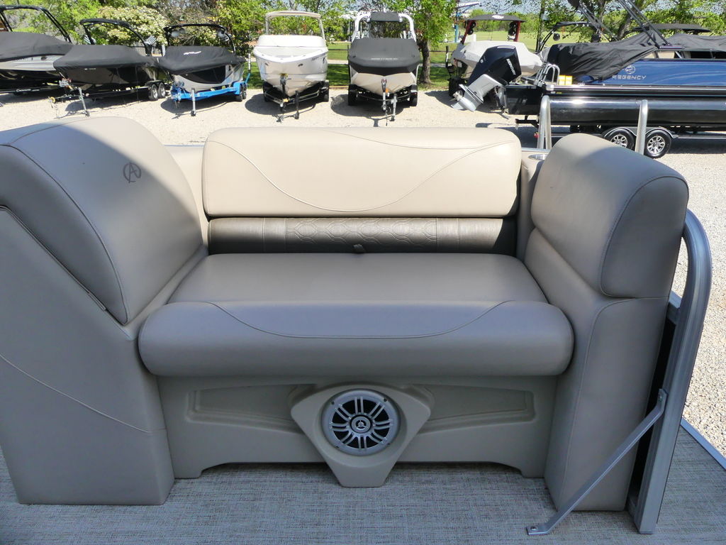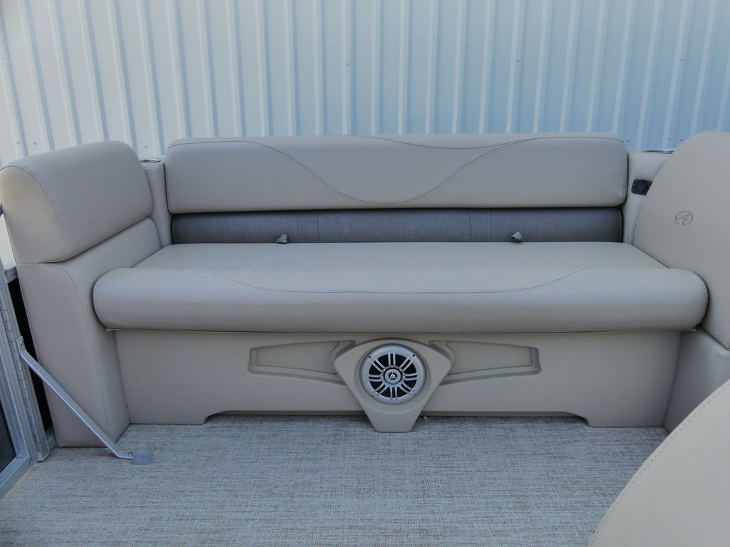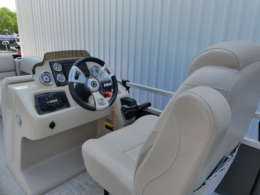 The interior features premium marine-grade vinyl seating with aluminum seat frames and integrated storage, along with plush lounge seating and a functional table for added convenience. A well-equipped helm includes a comfortable captain’s chair, full instrumentation, and a quality sound system with multiple speakers for an enhanced on-water experience.