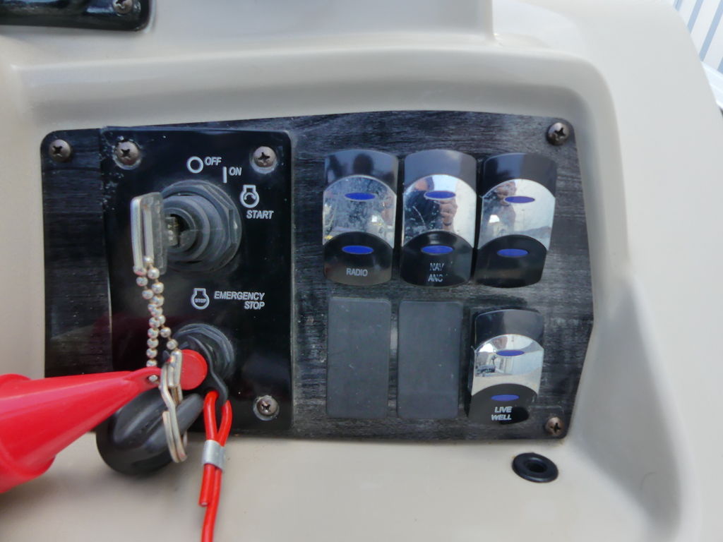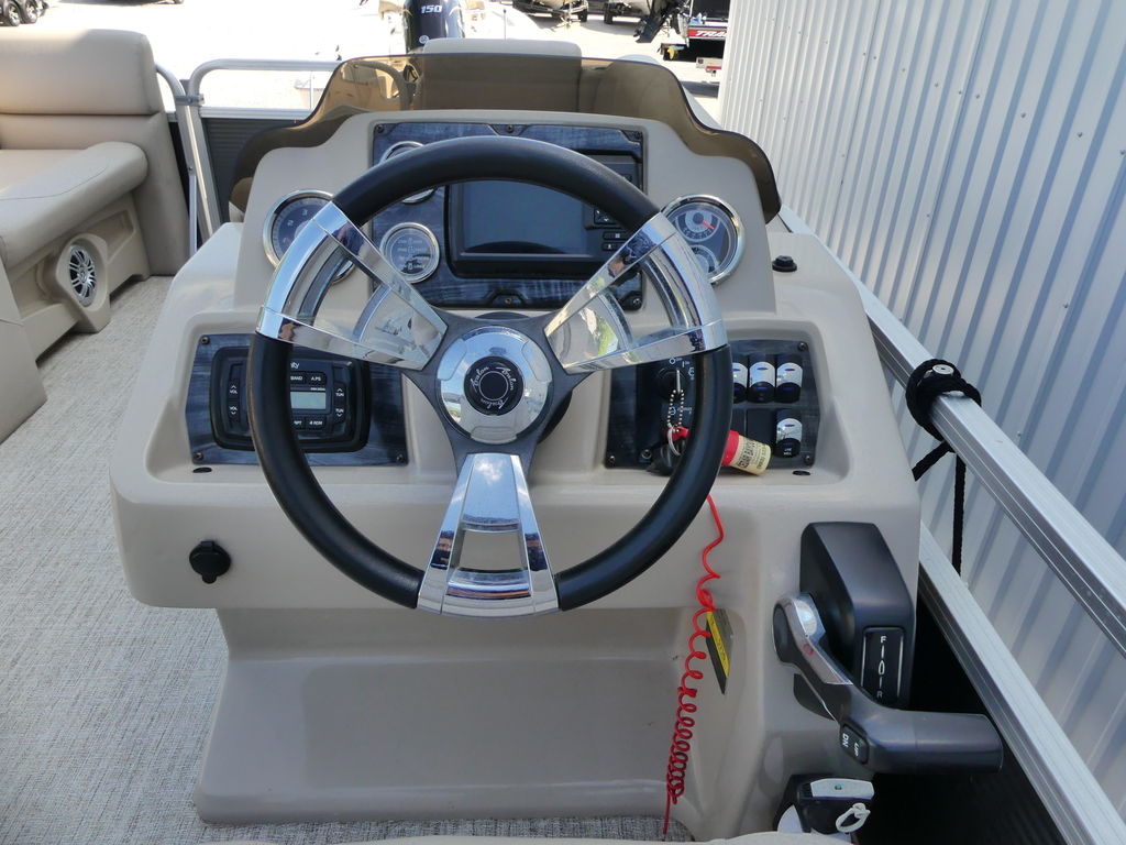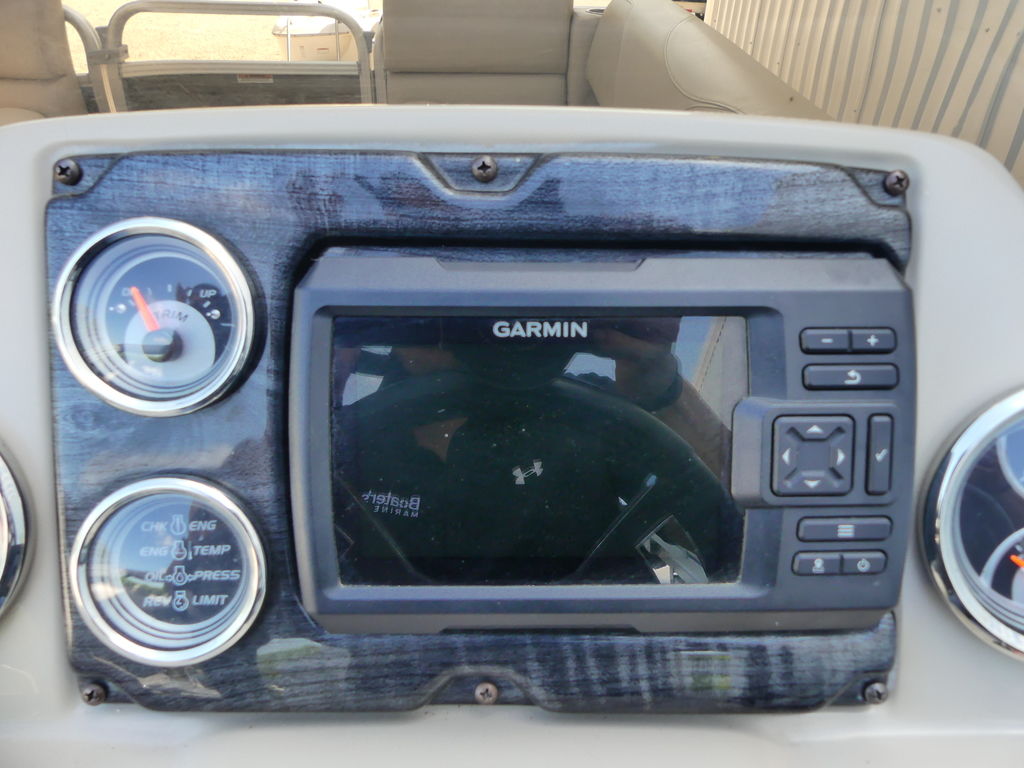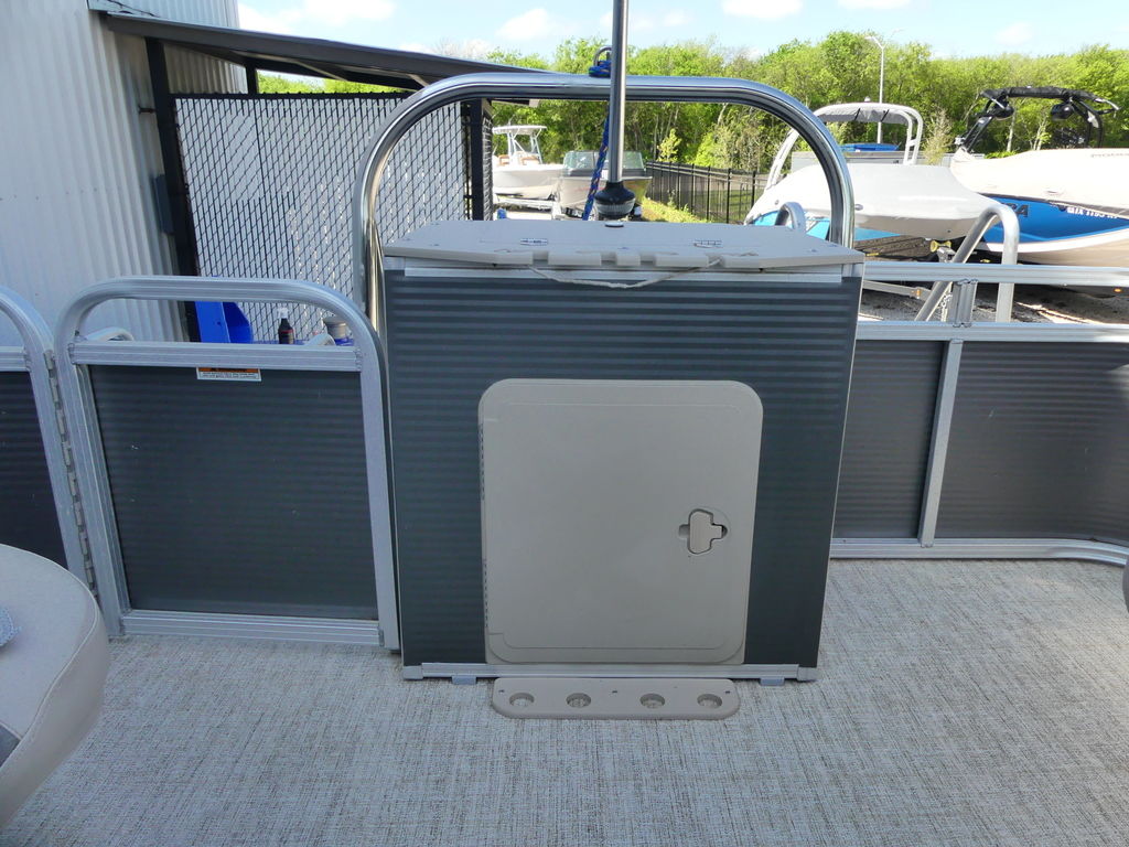 The interior features premium marine-grade vinyl seating with aluminum seat frames and integrated storage, along with plush lounge seating and a functional table for added convenience. A well-equipped helm includes a comfortable captain’s chair, full instrumentation, and a quality sound system with multiple speakers for an enhanced on-water experience.