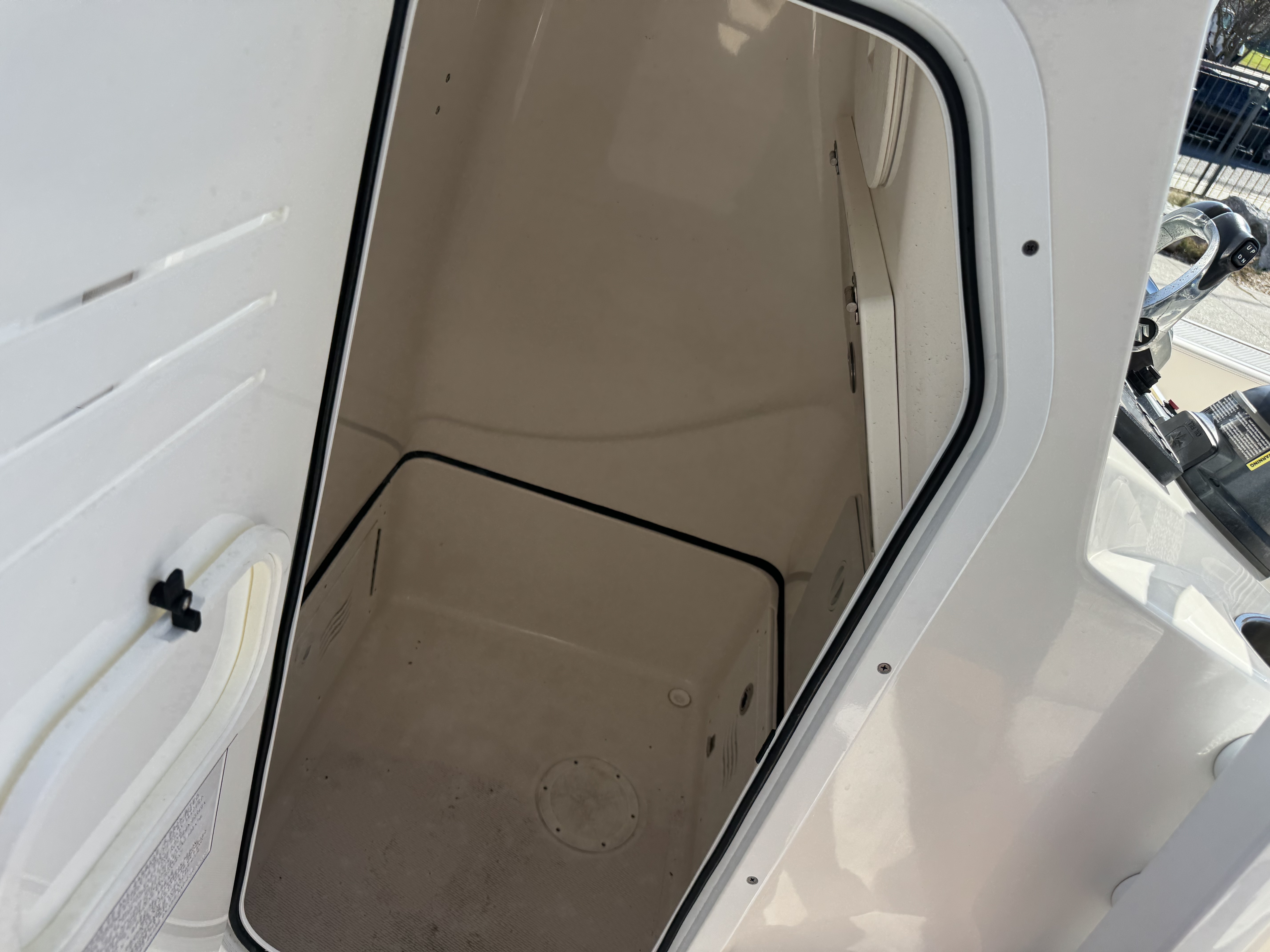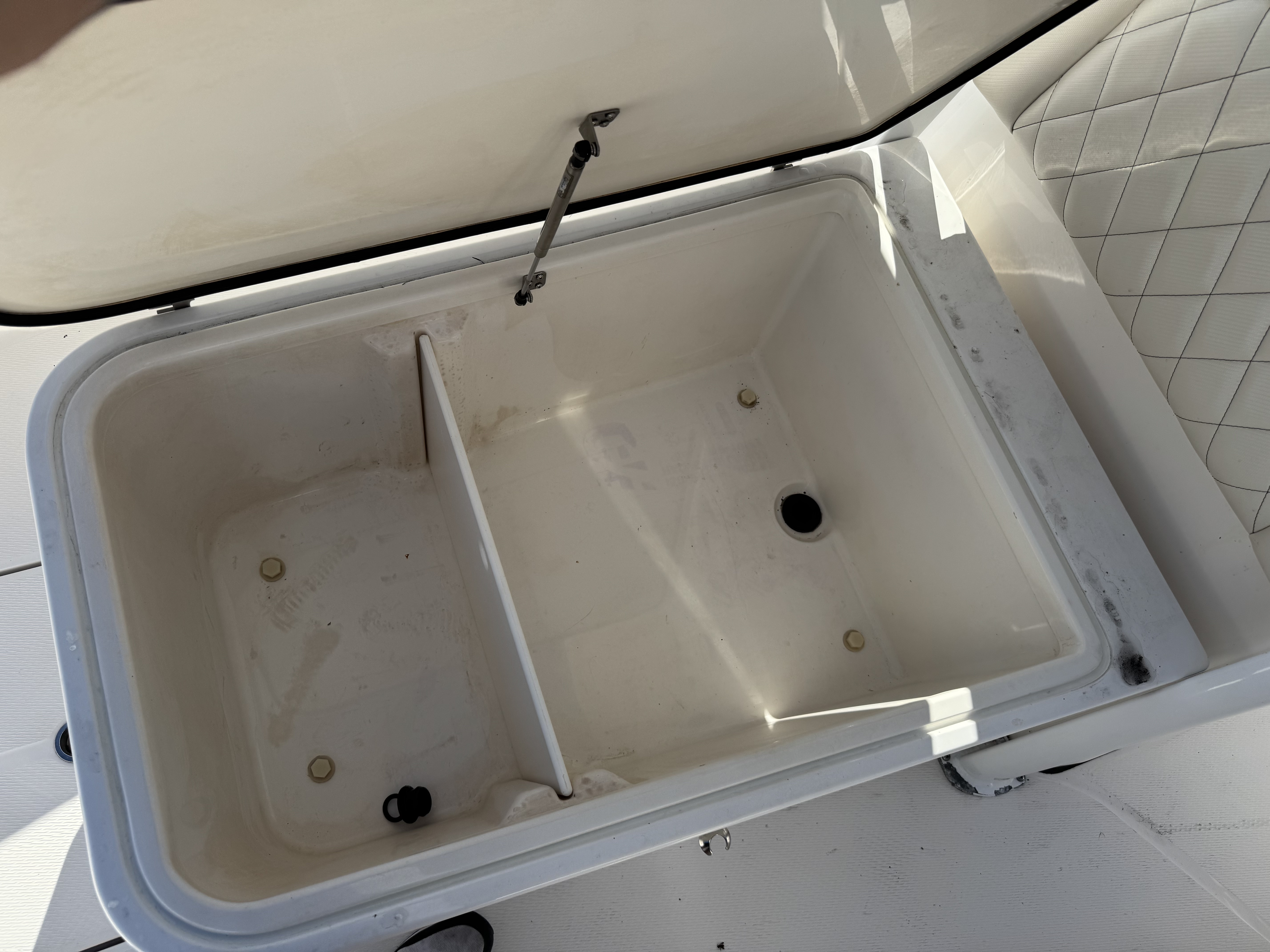 This boat is loaded with premium features throughout. At the helm, you’ll find a spacious console with dual Garmin multifunction displays, digital Suzuki controls, and Lenco trim tabs for easy handling and optimal performance. The fiberglass hardtop offers plenty of shade and comes equipped with integrated lighting, rod holders, and a radio box. The layout is both angler-friendly and family-comfortable, with massive insulated fish boxes, livewells, tackle storage, and fold-away transom seating for extra space when fishing.