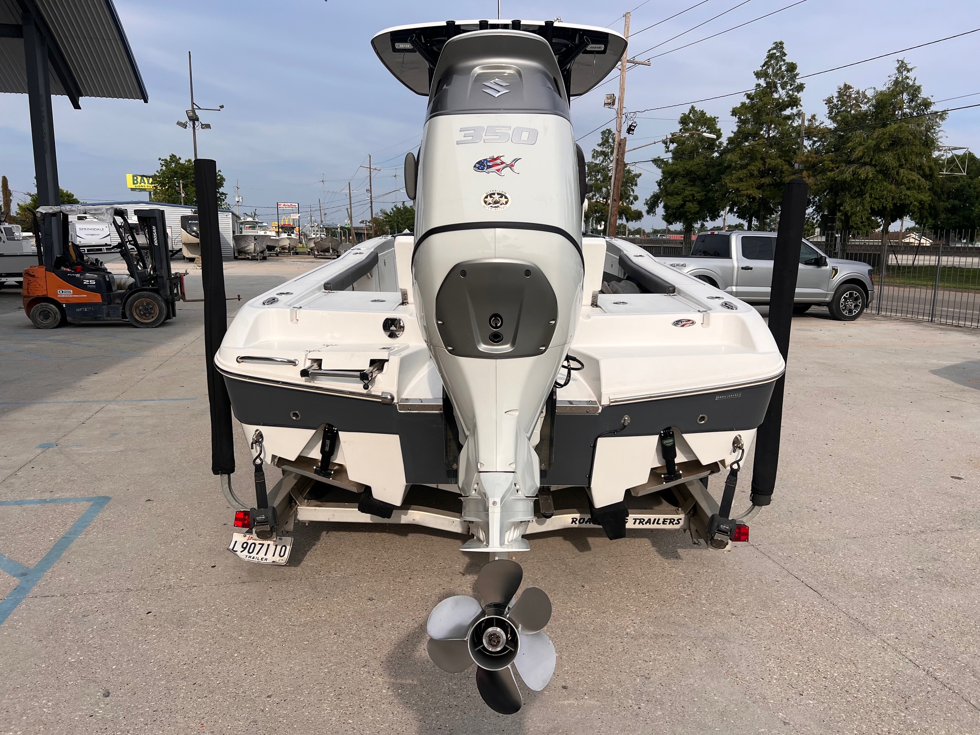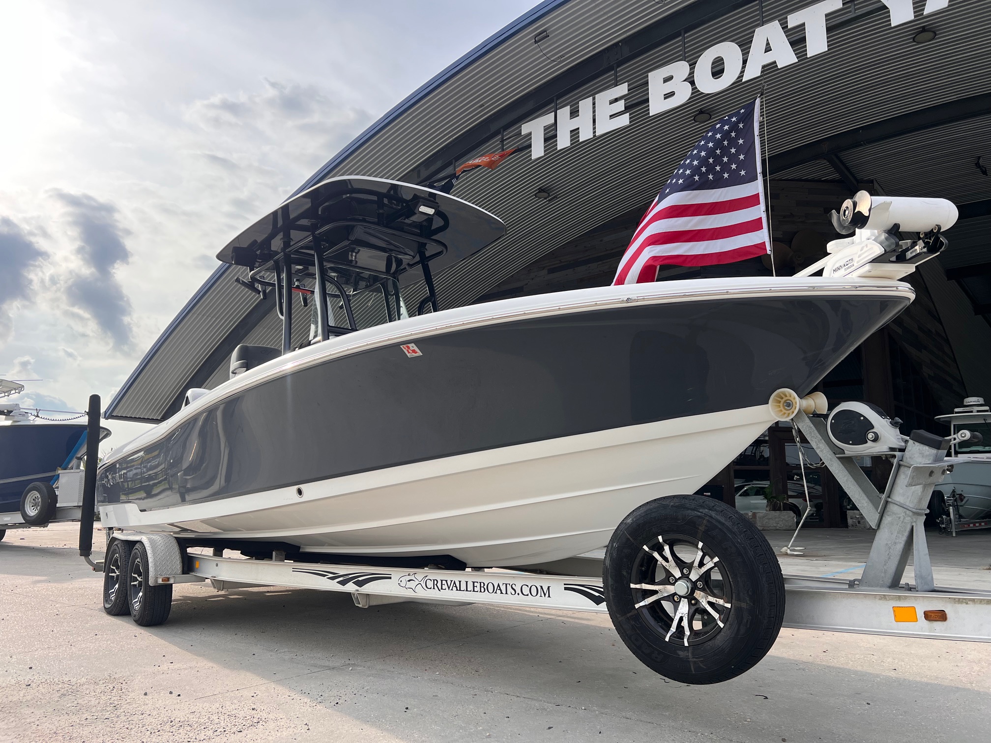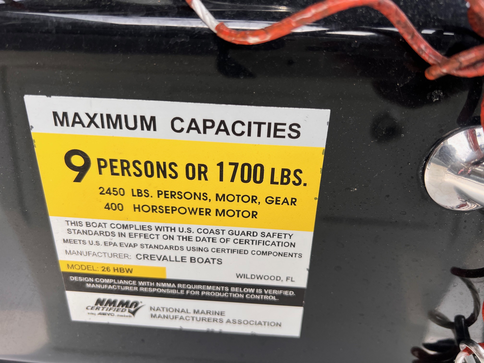 The 2021 Crevalle 26 HBW is a 25.5-foot center console boat with a beam of 8.5 feet. It's powered by a 350 horsepower engine, and features a 16-degree deadrise hull. The boat has a draft of 12-14 inches and a fuel capacity of approximately 90 gallons.