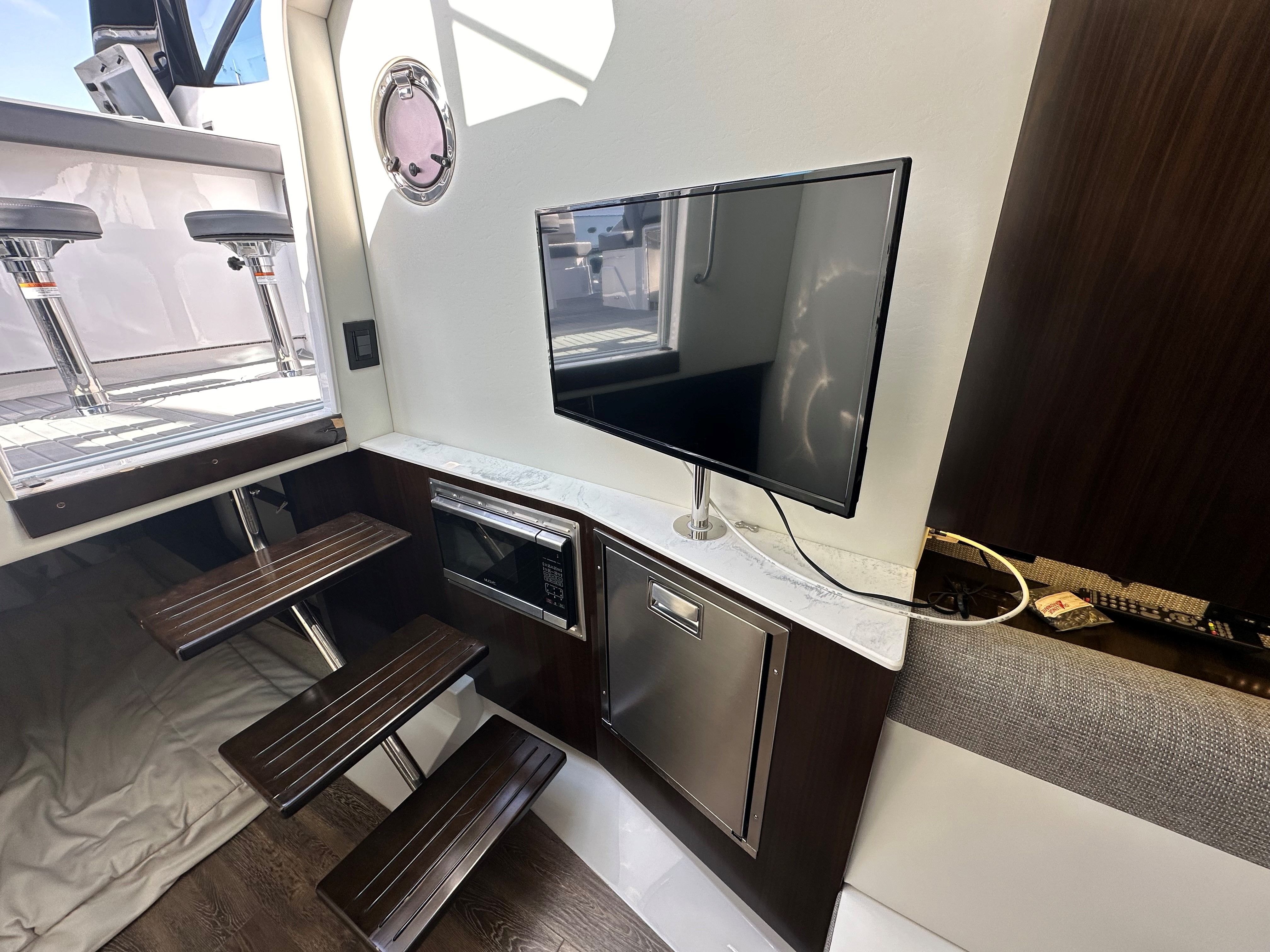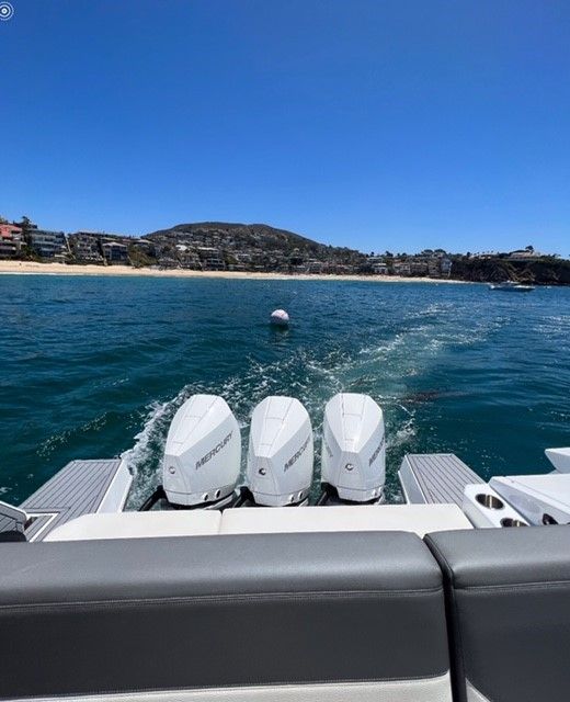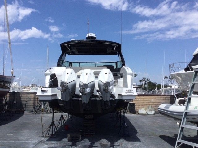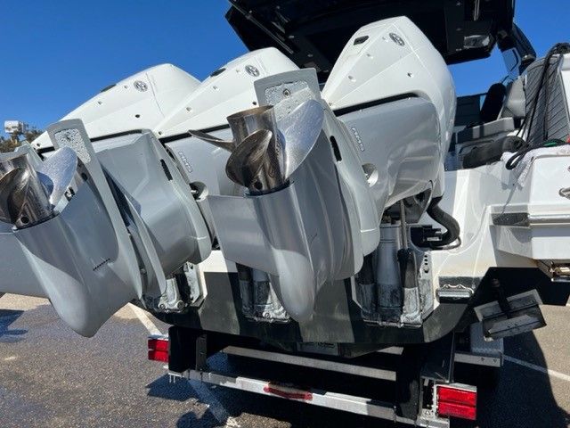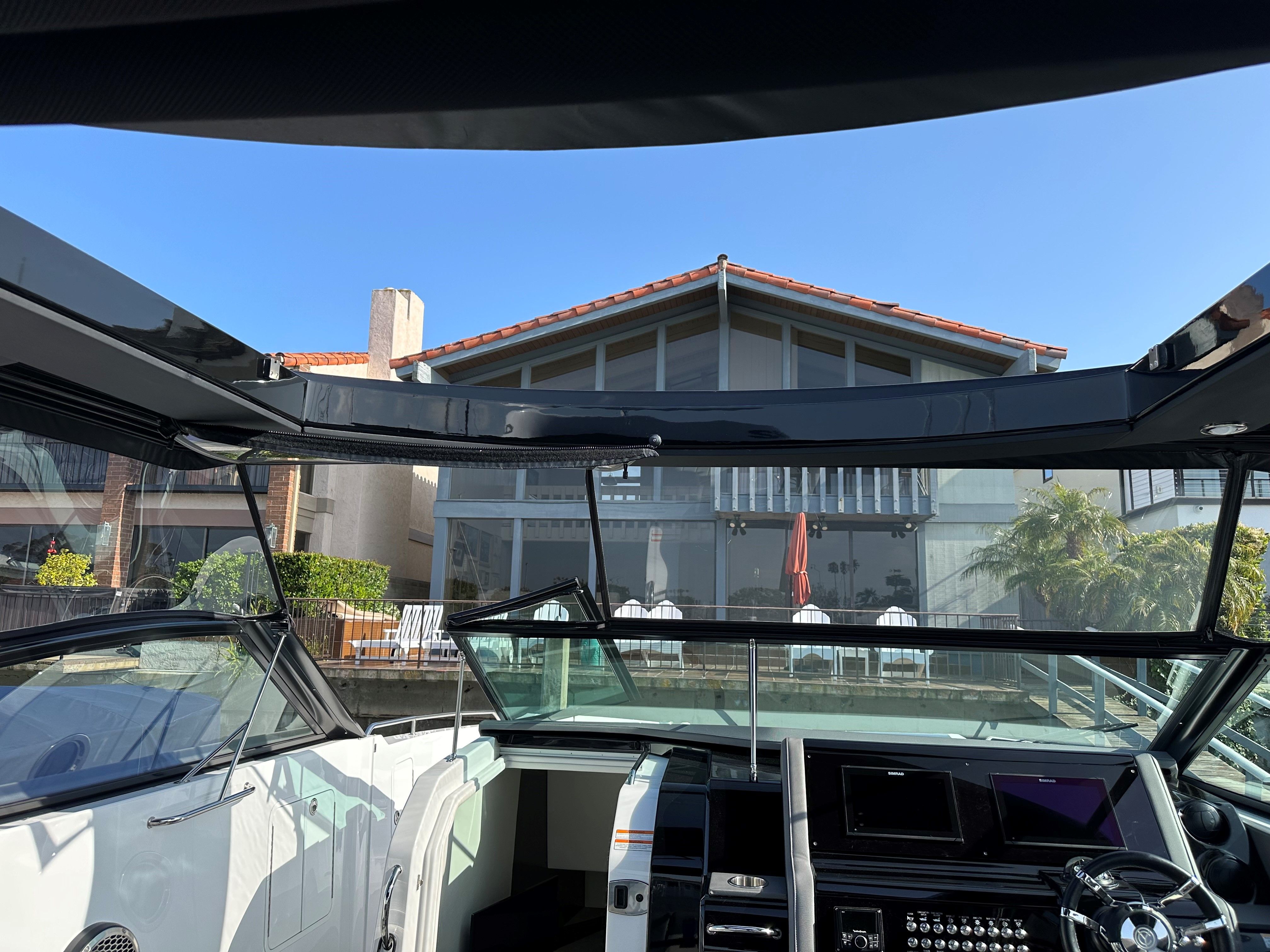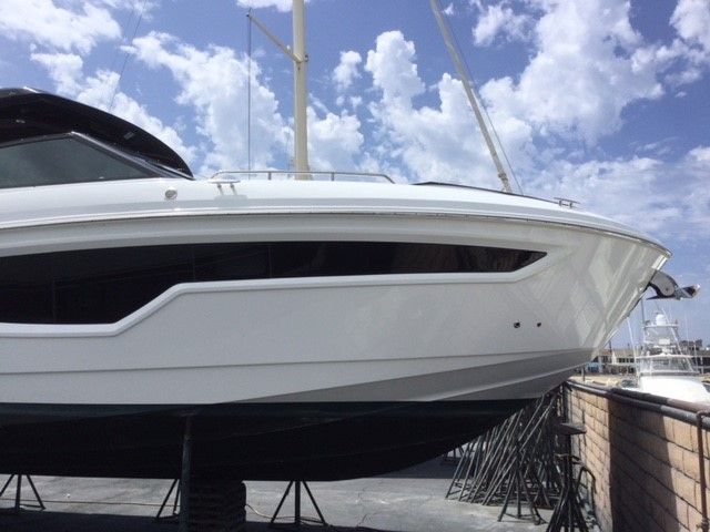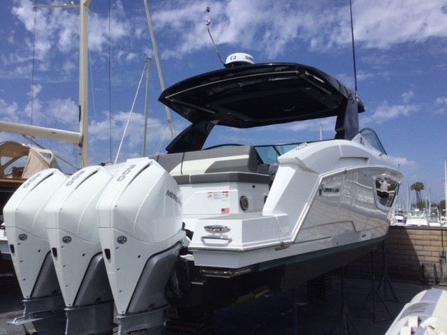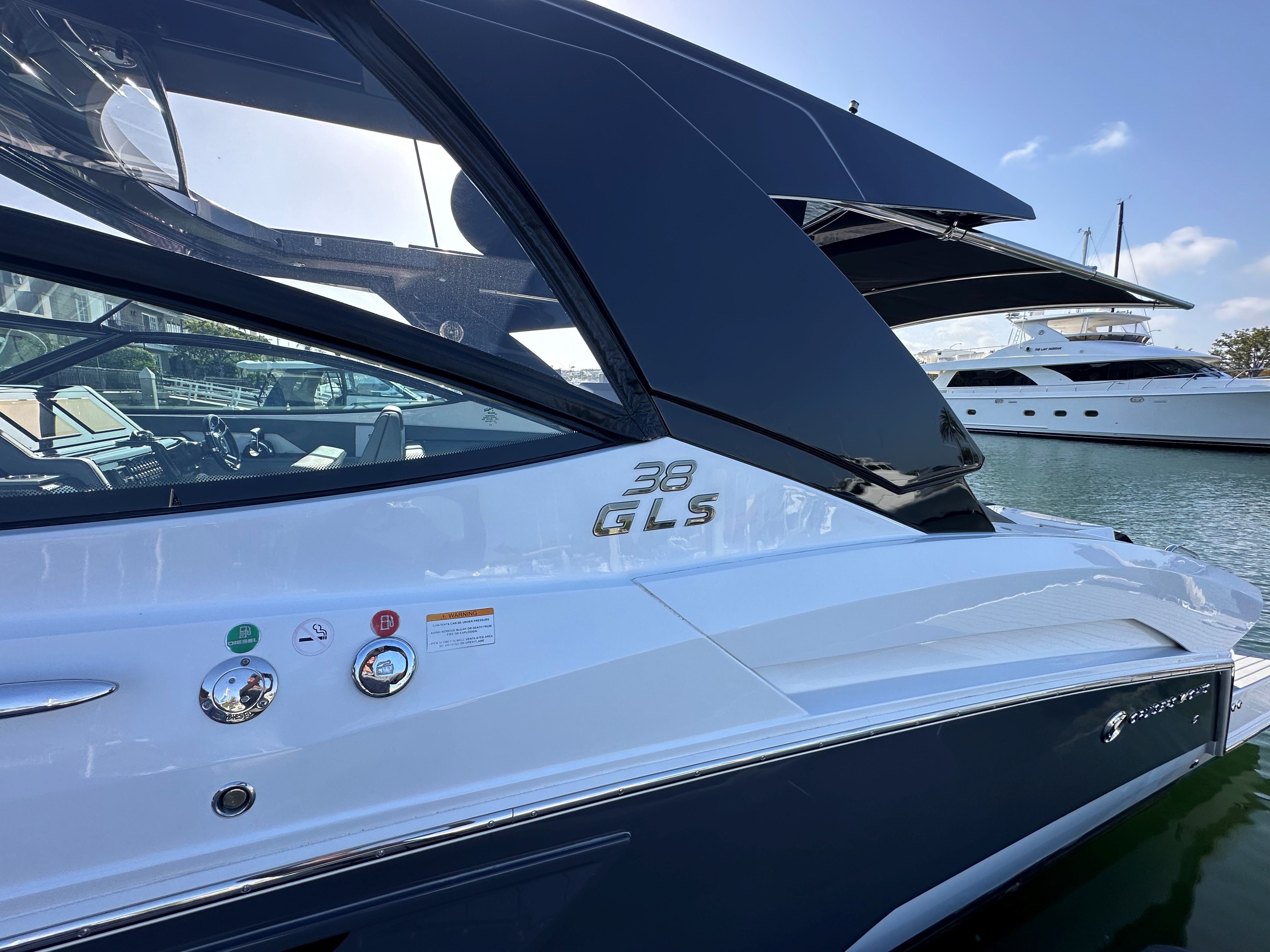 This LLC owned 38 GLS Cruisers Yacht with triple Mercury Verados V8 300 HP motors with low hours in excellent condition! One owner boat bought brand new in May 2021. Transferable factory hull warranty thru May 2026. Sure shade electric transom shade black, forward manual shade in gray over bowrider area. AGM batteries upgrade, 5kw diesel generator with sound shield and own fuel tank, premium electronics with radar and GPS dual screens on dash and VHF radio, underwater lights, Seadek mat gray in cockpit and bowrider area, ice maker under helm seat upgrade, 2TV's. Macerator discharge pump, polished stainless steel anchor, black hard top with sun roof, light gray hull side gelcoat and white hull, black storage covers, Strataglass front and side windows, electric head with holding tank, hot water.