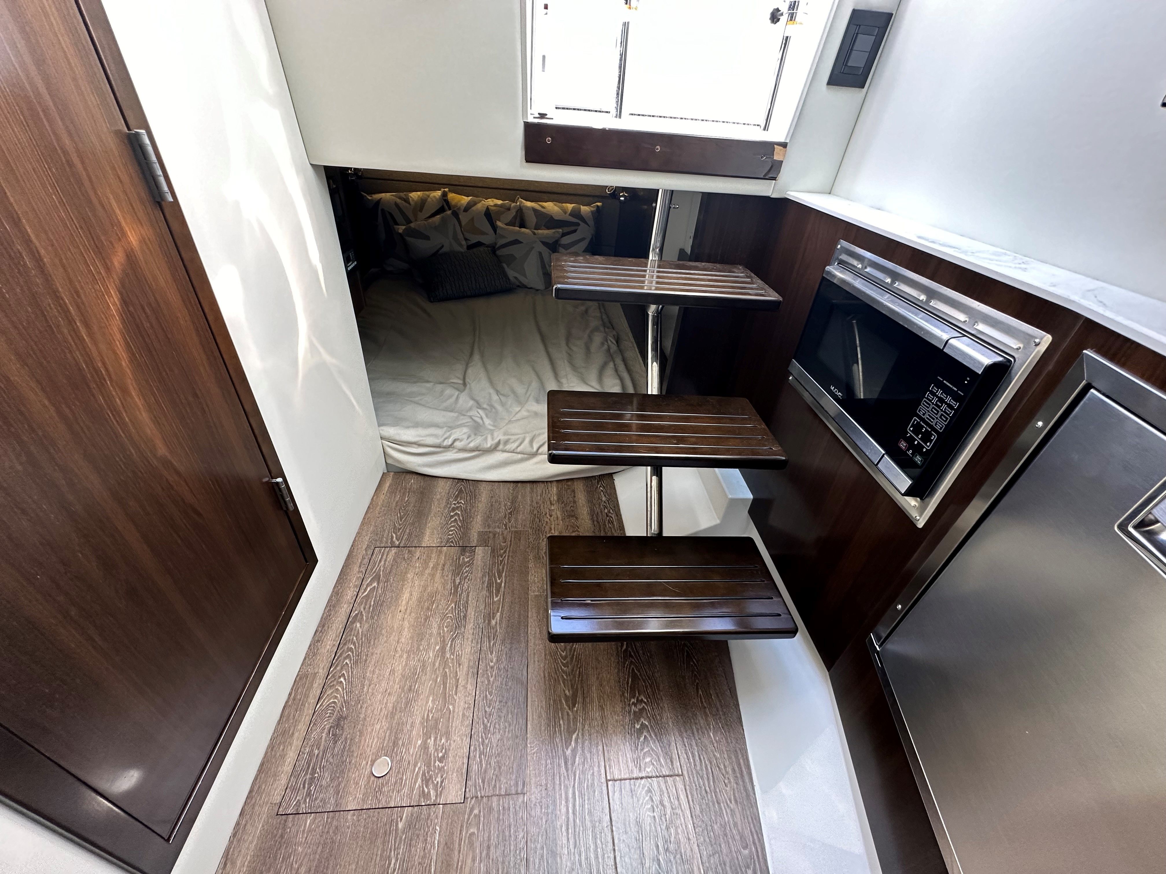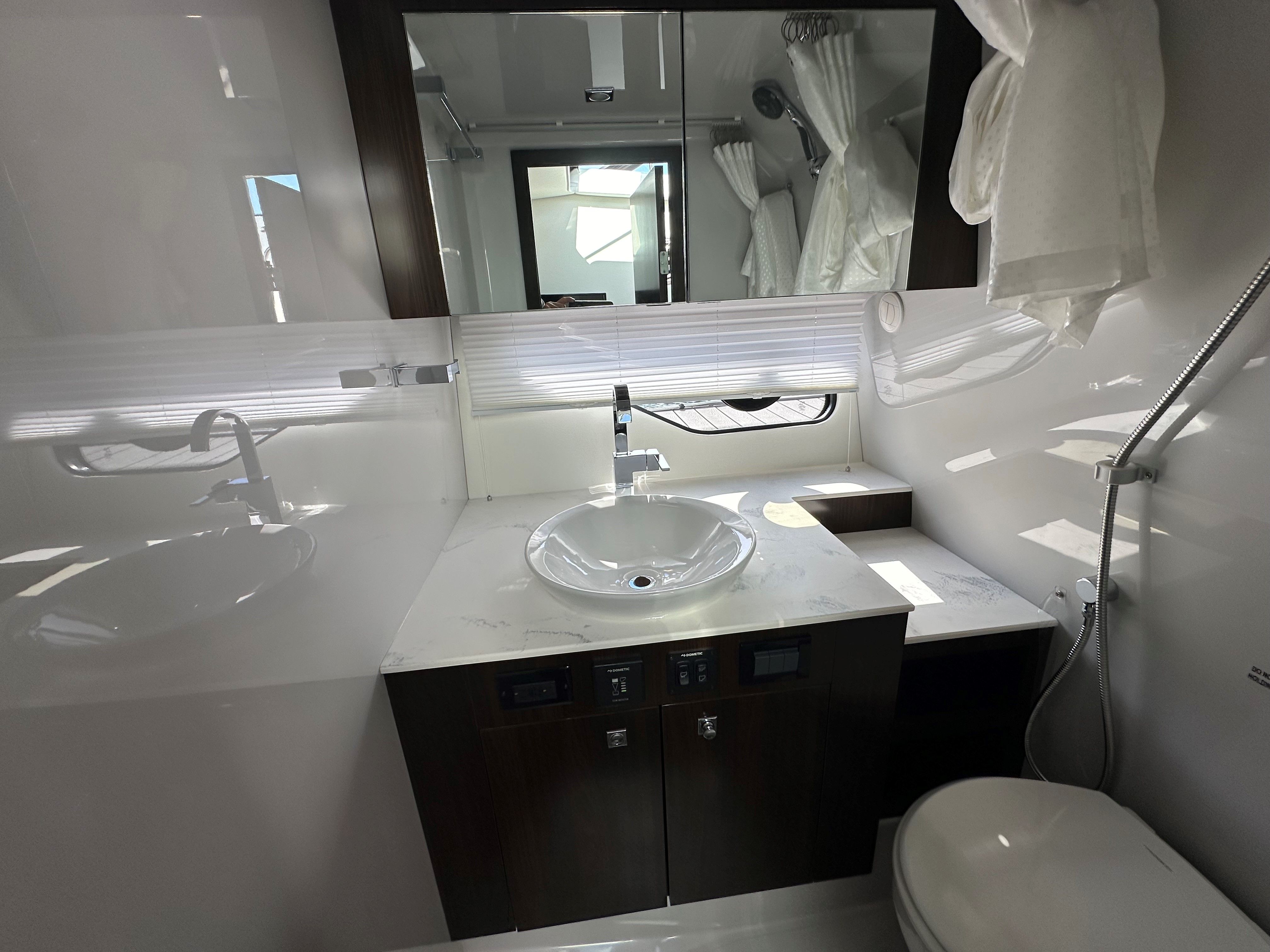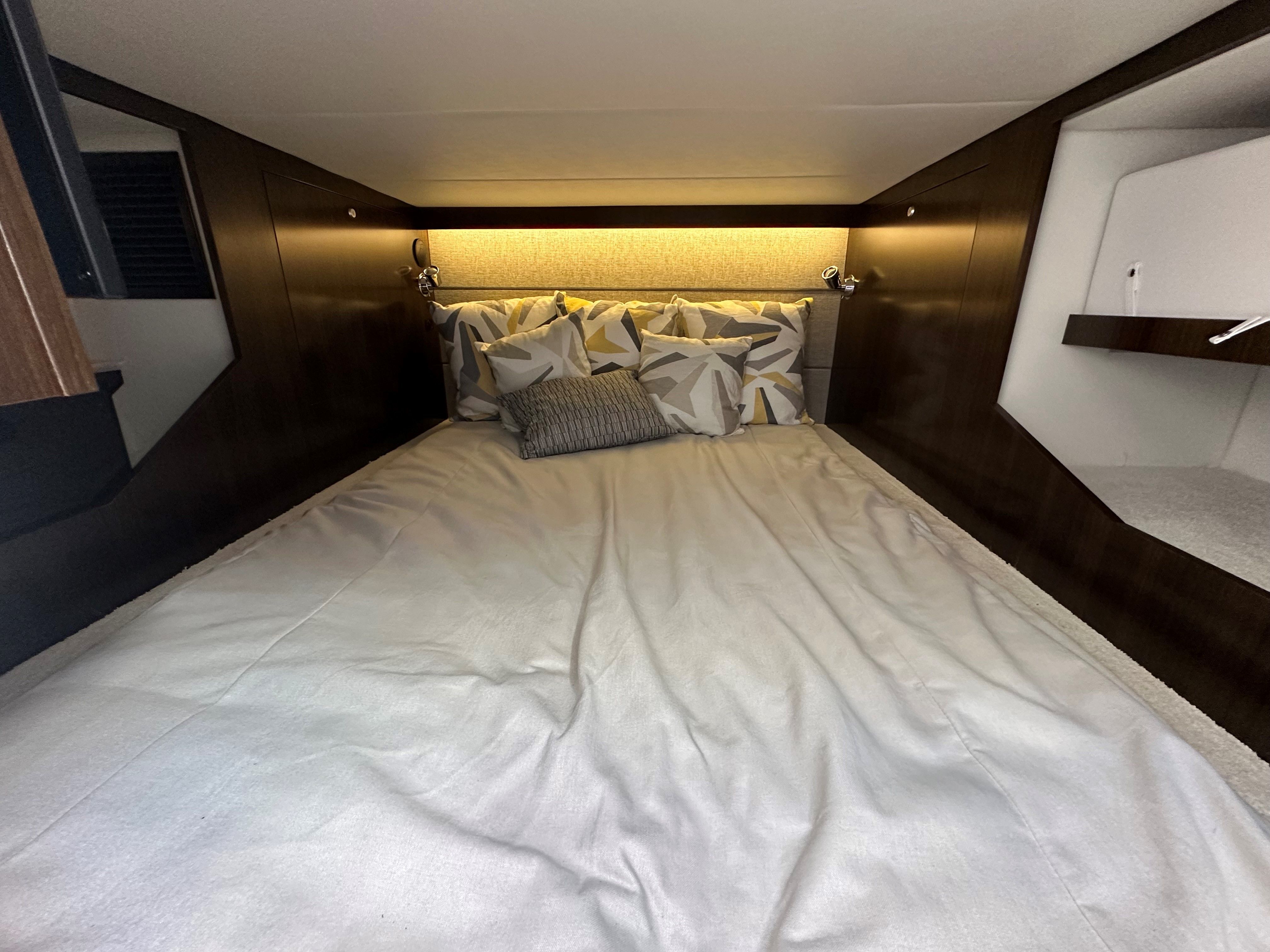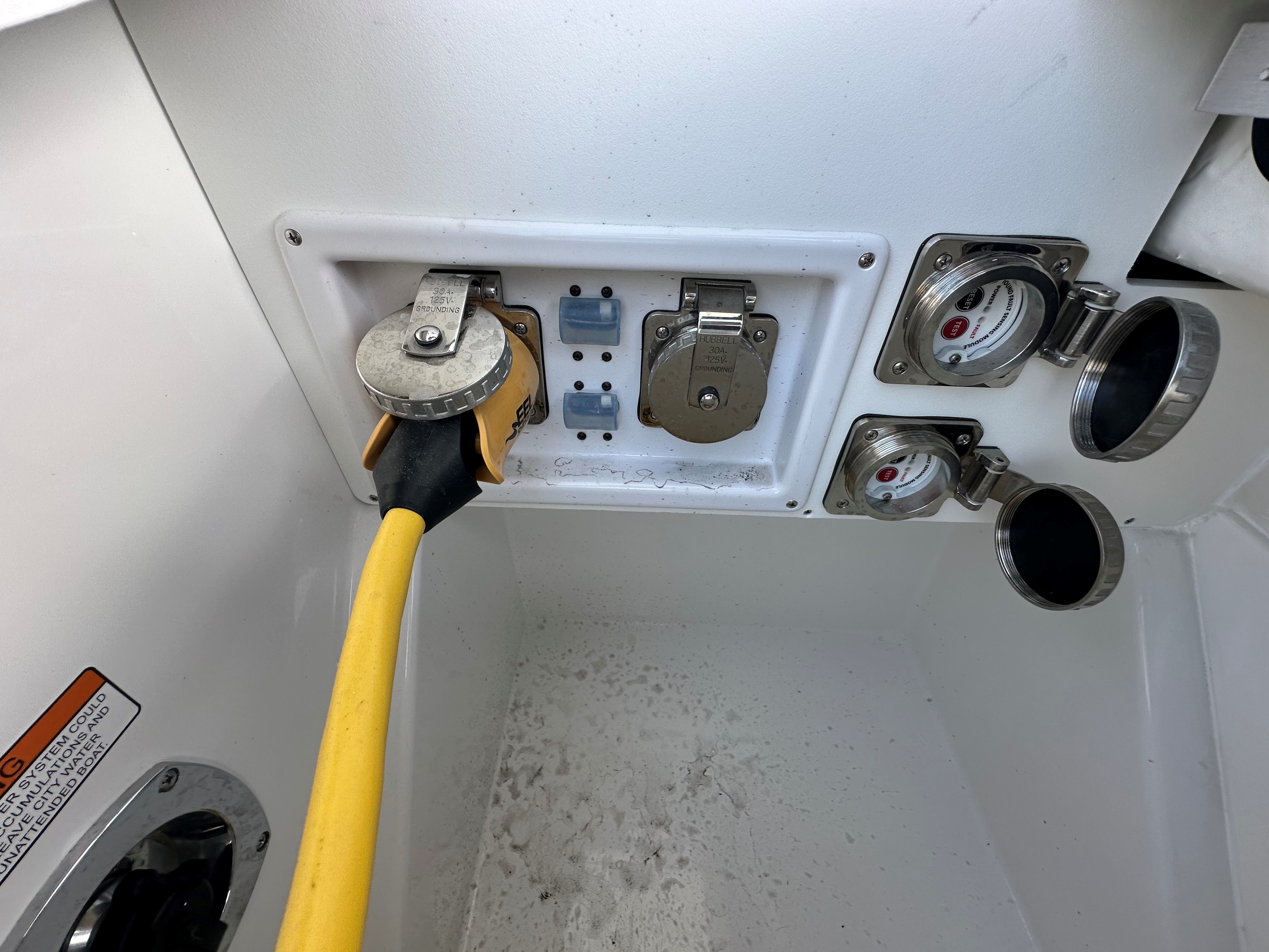 This LLC owned 38 GLS Cruisers Yacht with triple Mercury Verados V8 300 HP motors with low hours in excellent condition! One owner boat bought brand new in May 2021. Transferable factory hull warranty thru May 2026. Sure shade electric transom shade black, forward manual shade in gray over bowrider area. AGM batteries upgrade, 5kw diesel generator with sound shield and own fuel tank, premium electronics with radar and GPS dual screens on dash and VHF radio, underwater lights, Seadek mat gray in cockpit and bowrider area, ice maker under helm seat upgrade, 2TV's. Macerator discharge pump, polished stainless steel anchor, black hard top with sun roof, light gray hull side gelcoat and white hull, black storage covers, Strataglass front and side windows, electric head with holding tank, hot water.