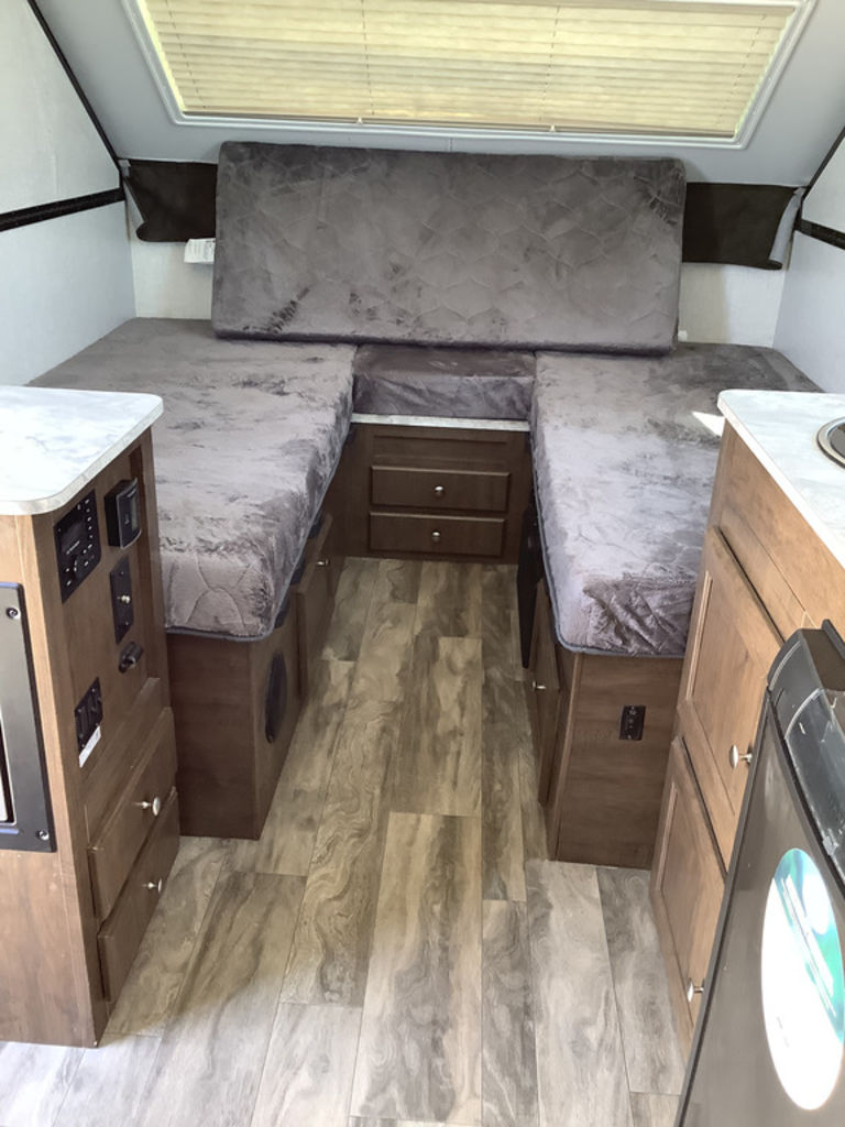 The pop up design allows for a spacious feel once set up, giving you more room to relax without the bulk of a traditional travel trailer. Large windows provide natural light and ventilation, making it a great choice for lake trips, campgrounds, and outdoor adventures.