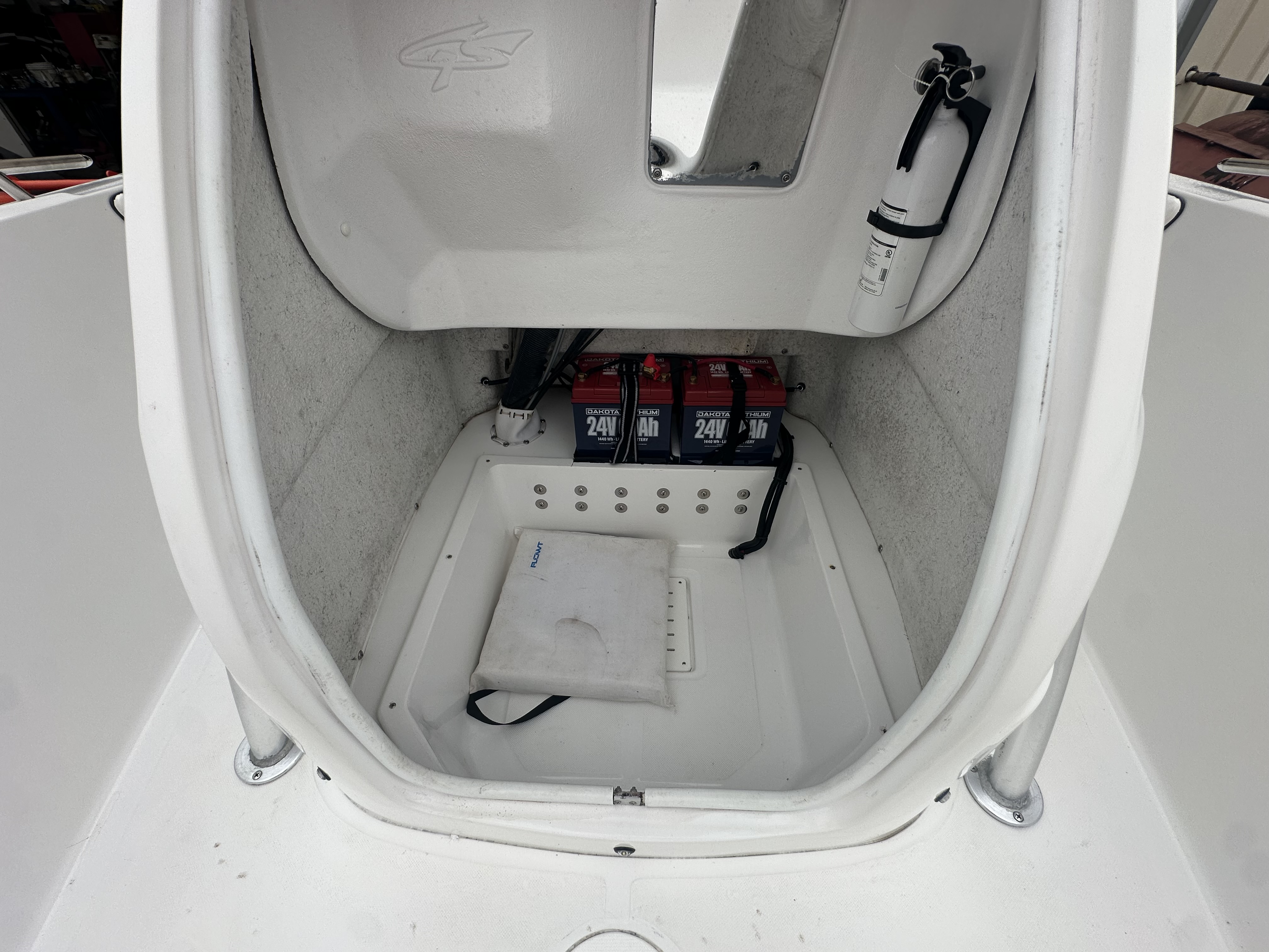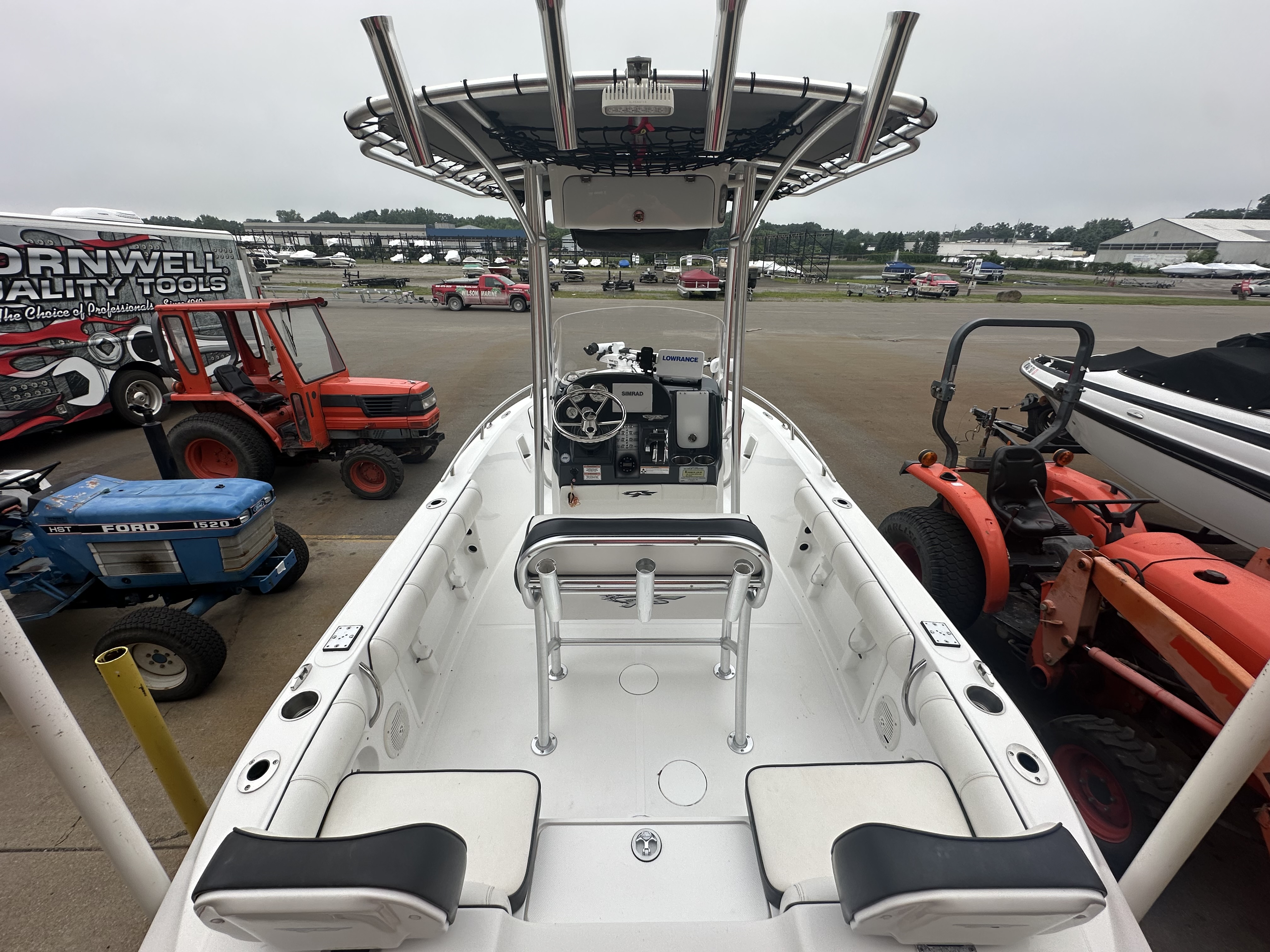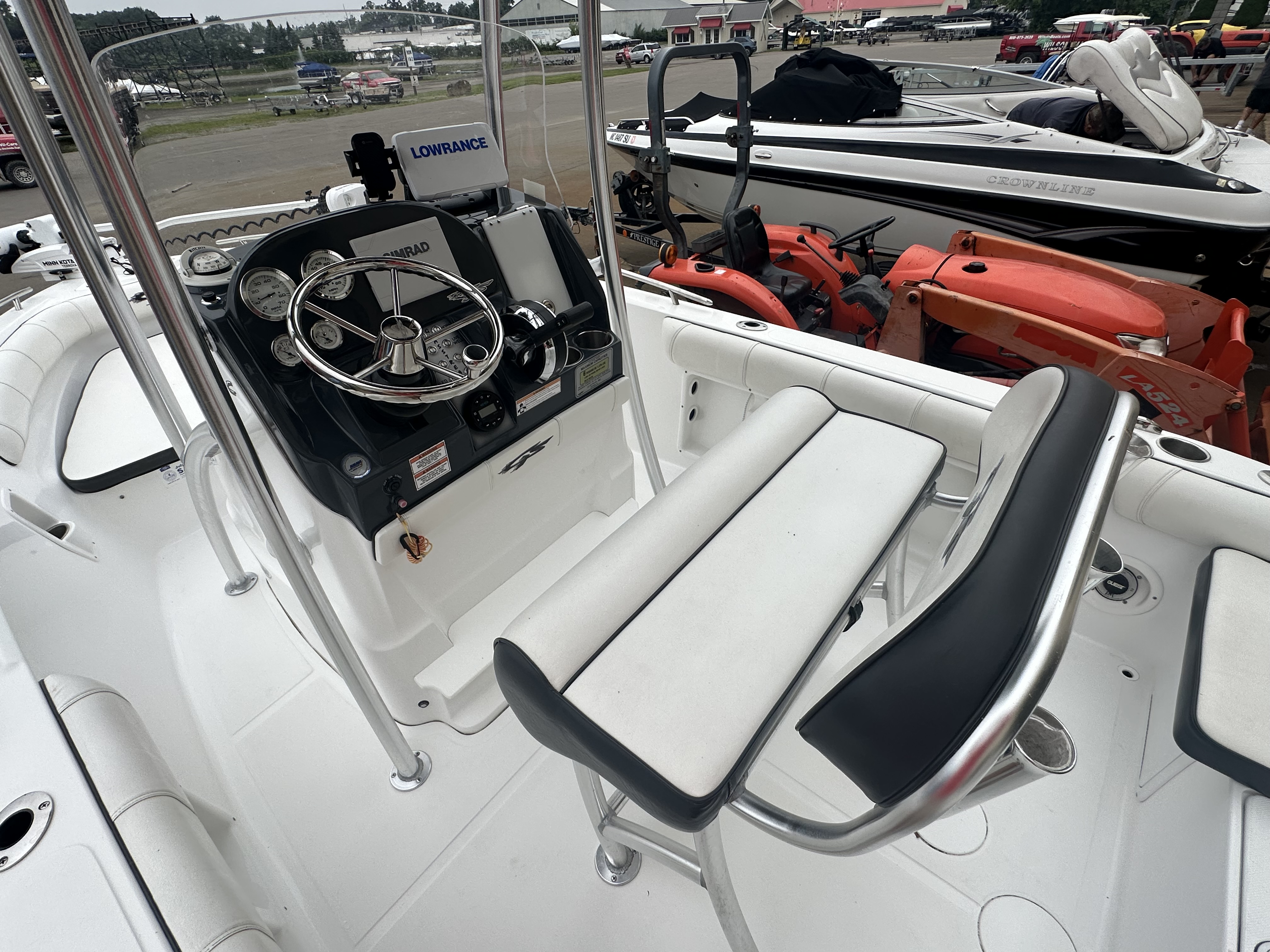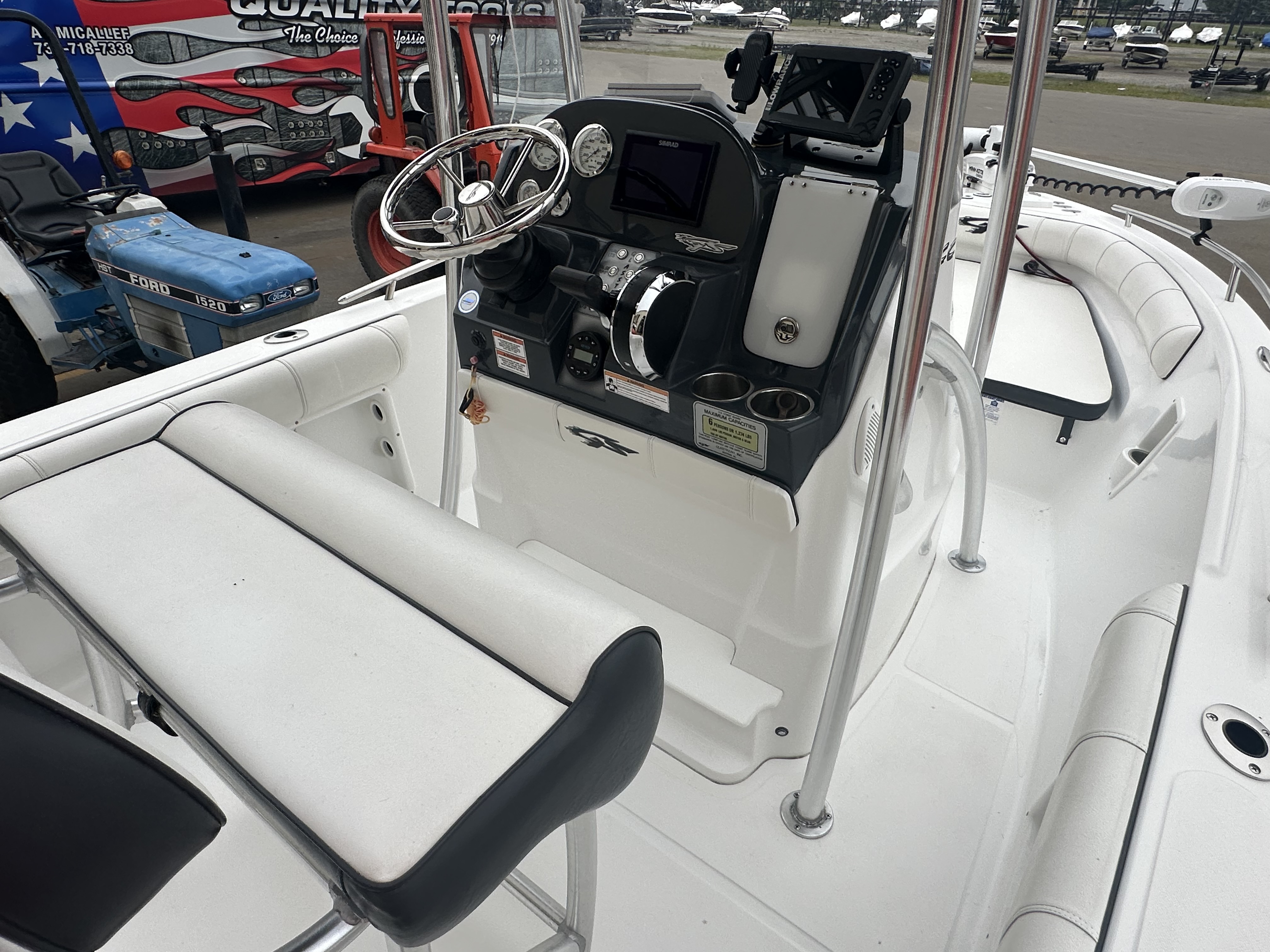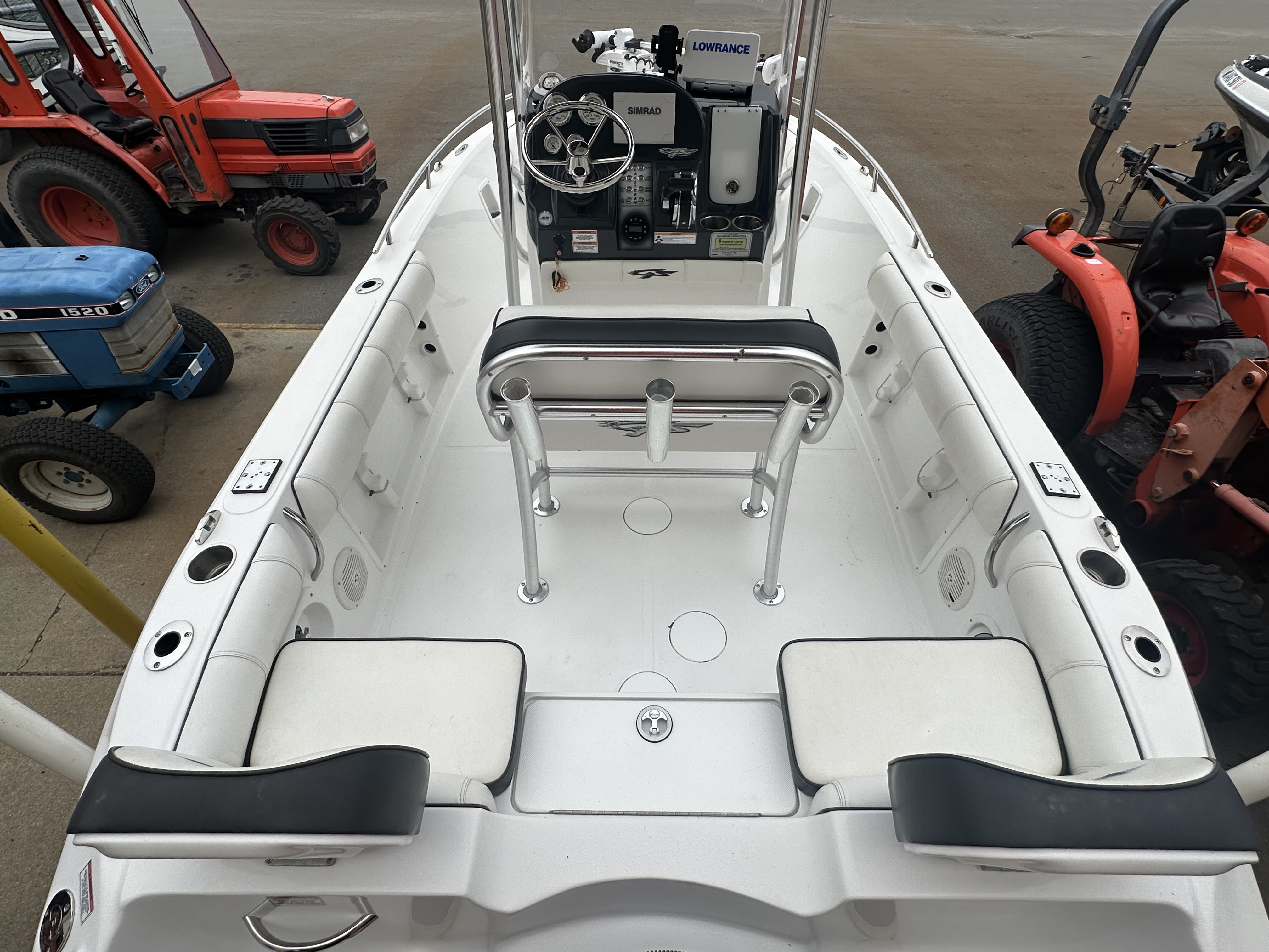 Boat comes with rear boarding ladder, removable aft seats, front removable bow cushion, MinnKota Riptide 80lb I-Pilot (hand control) with *Dual 24V Dakota Lithium batteries, 12V Dakota Lithium main crank battery, Simrad and Lowrance fish finders at console, compass, T-Top (rear light, speakers, storage compartment, lights), wash down system with fresh water and raw water option, battery selector switch, front and rear livewells and much more!