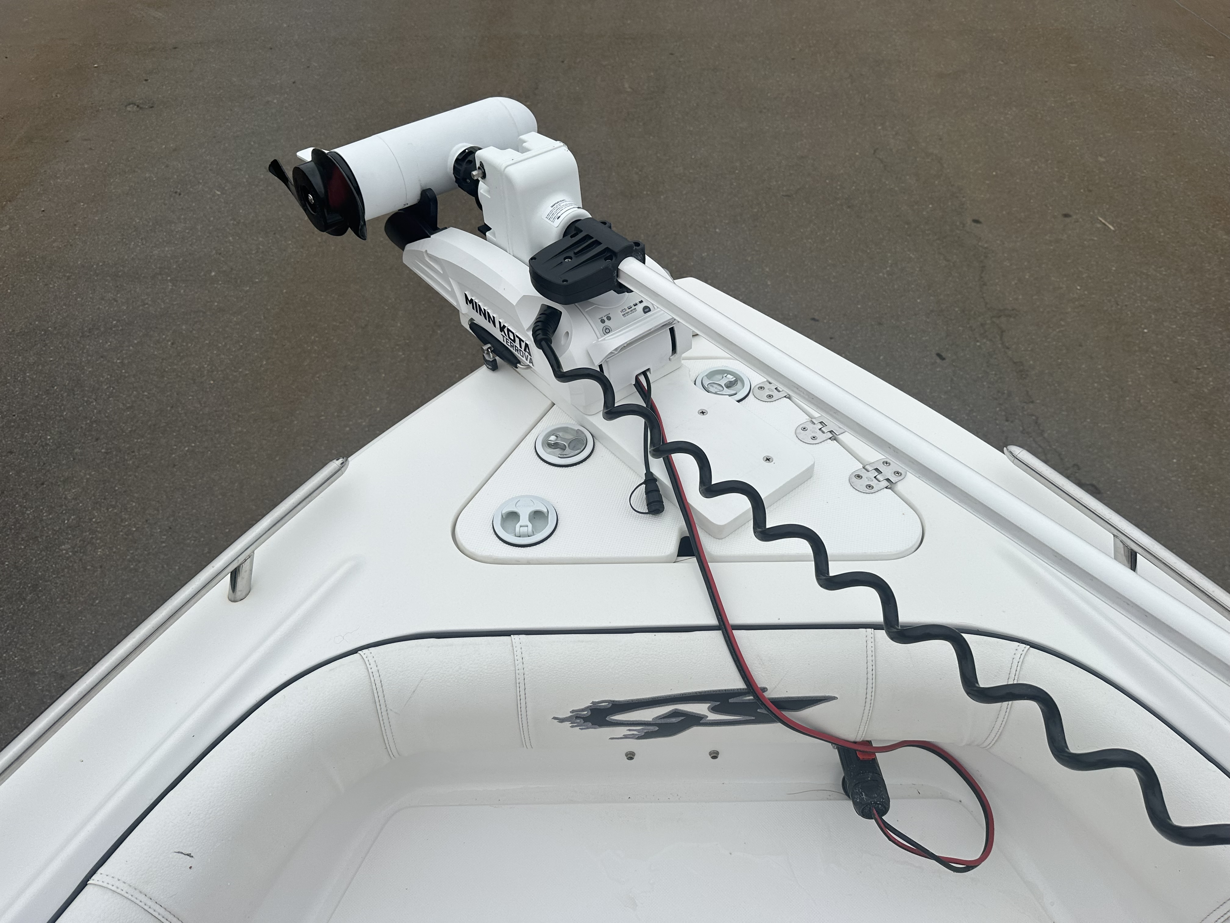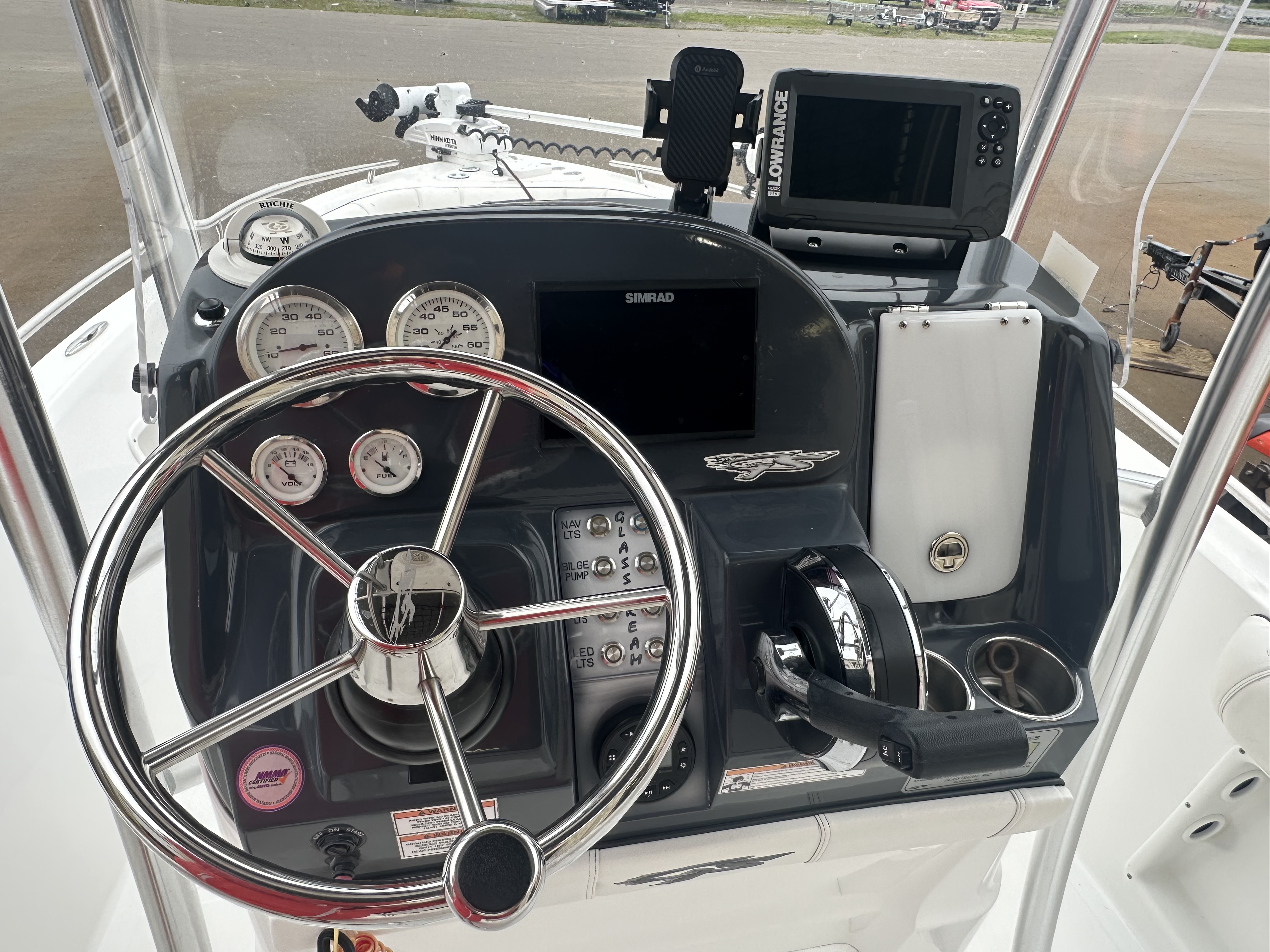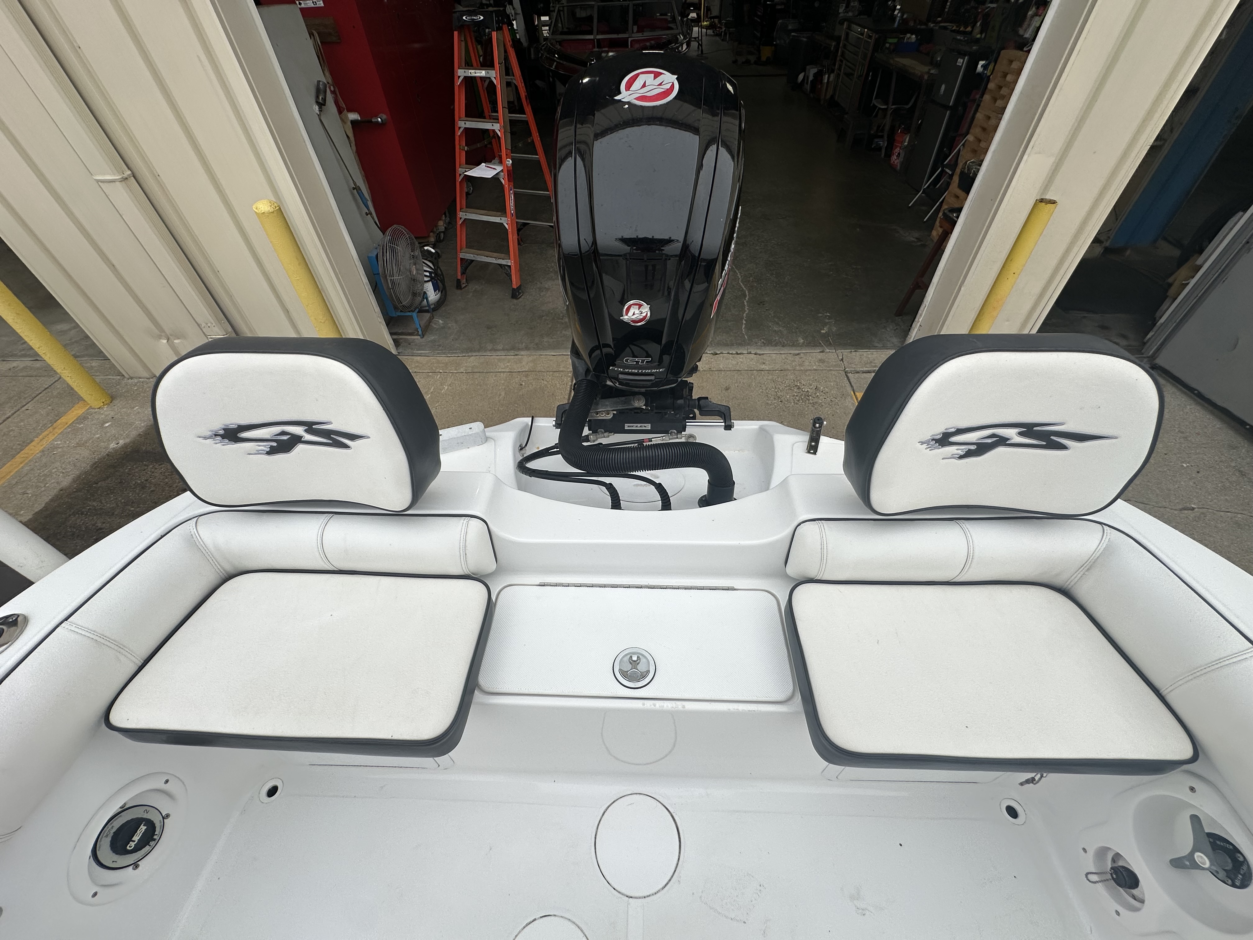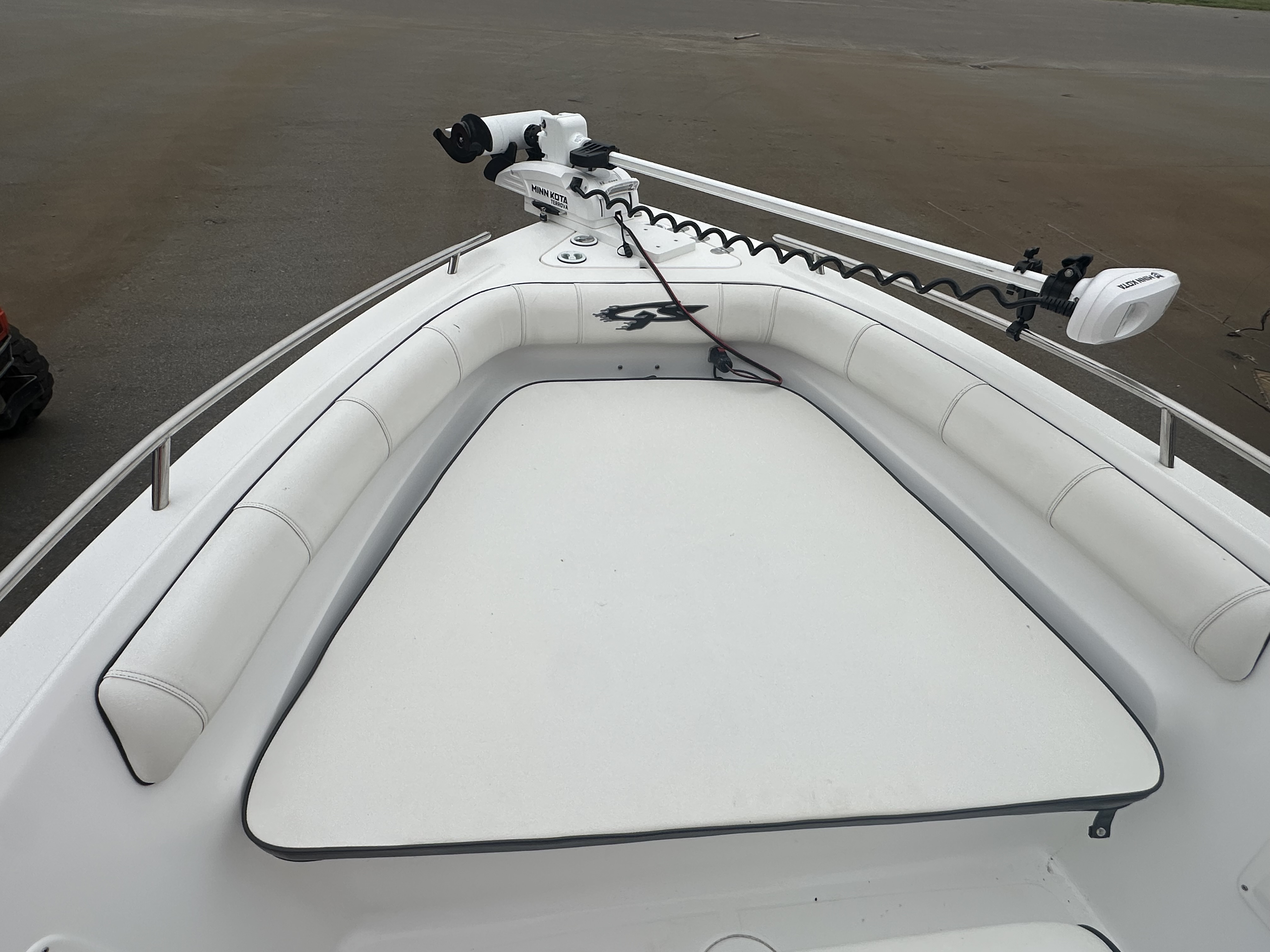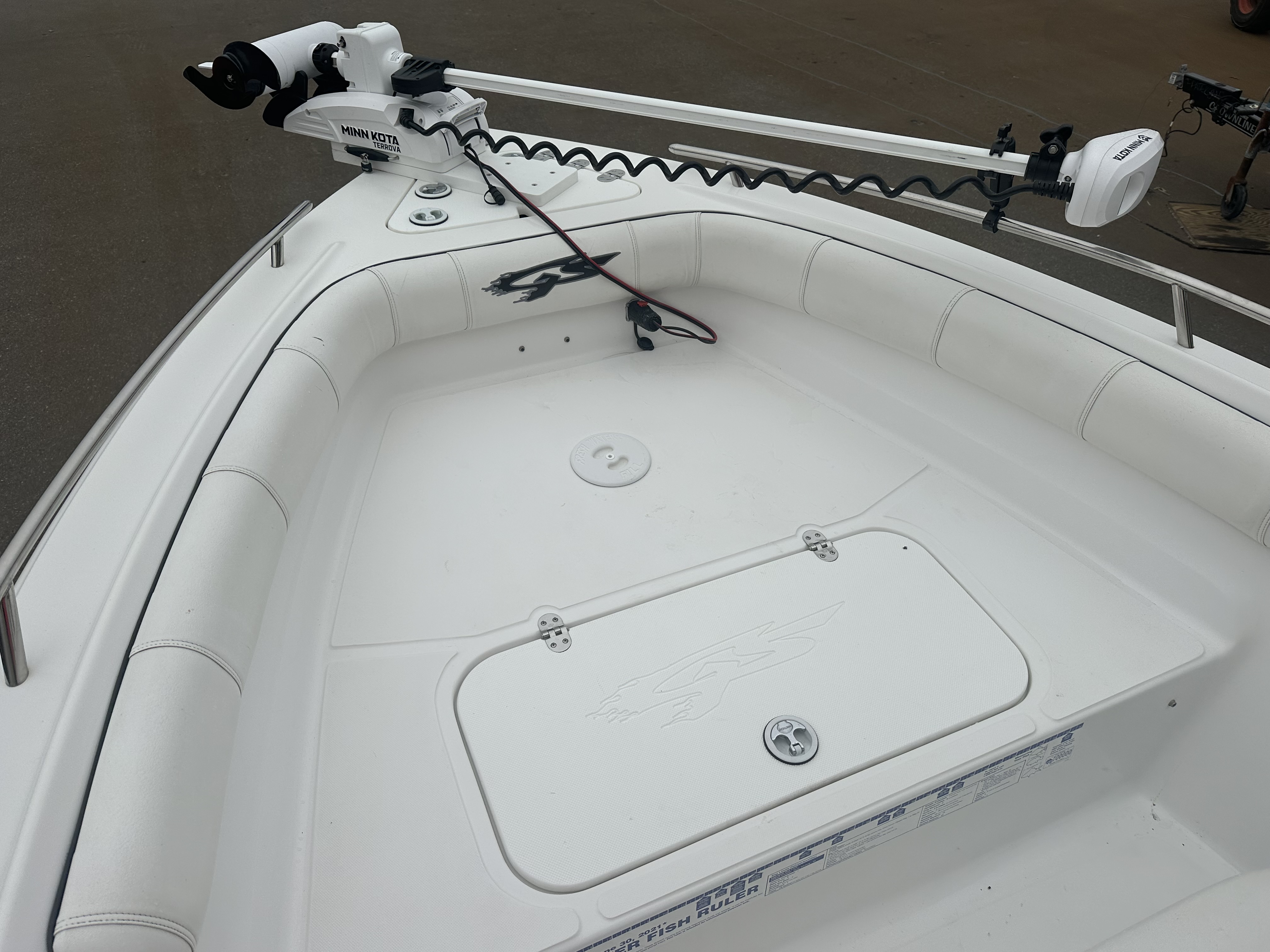 Boat comes with rear boarding ladder, removable aft seats, front removable bow cushion, MinnKota Riptide 80lb I-Pilot (hand control) with *Dual 24V Dakota Lithium batteries, 12V Dakota Lithium main crank battery, Simrad and Lowrance fish finders at console, compass, T-Top (rear light, speakers, storage compartment, lights), wash down system with fresh water and raw water option, battery selector switch, front and rear livewells and much more!