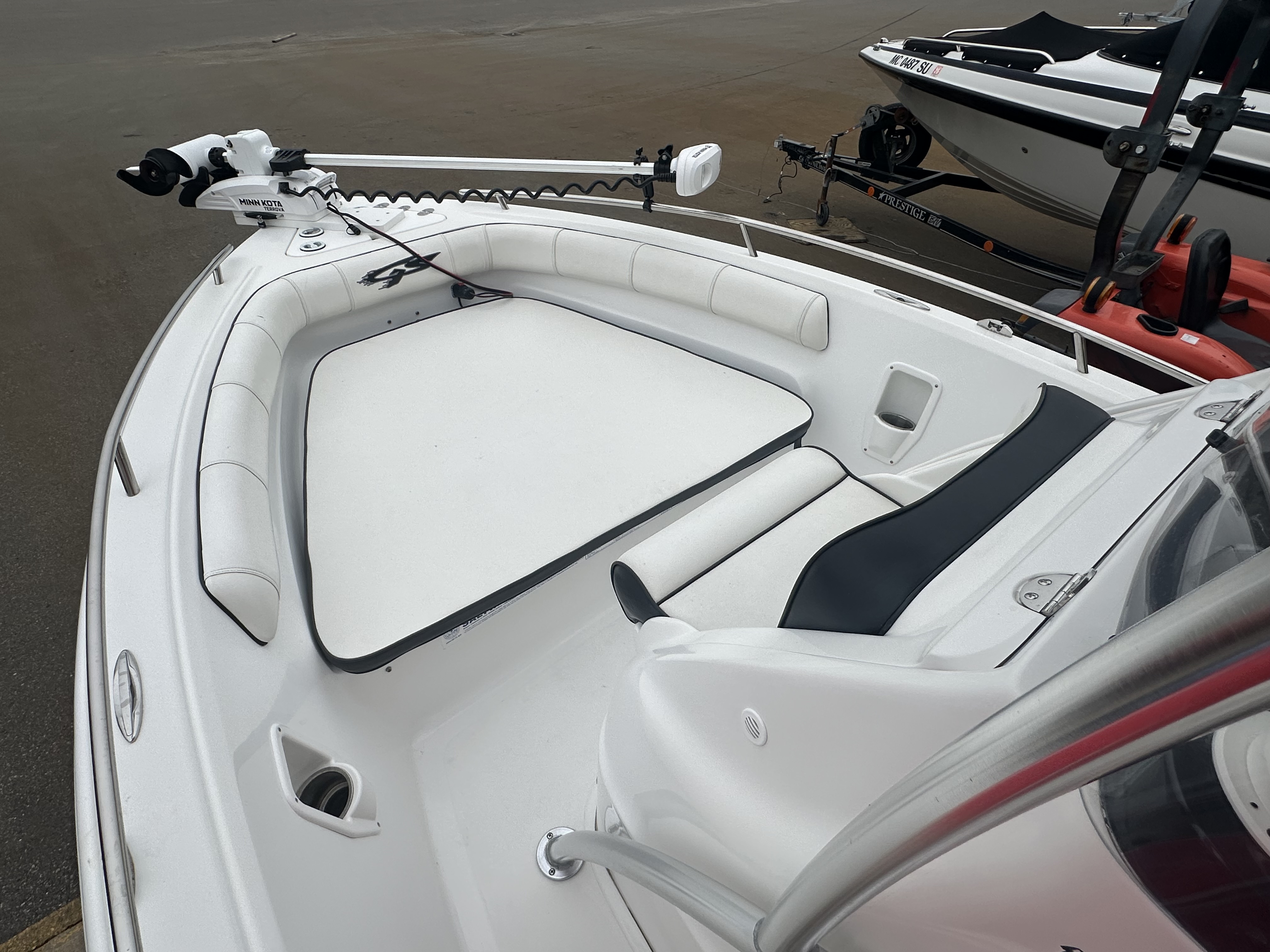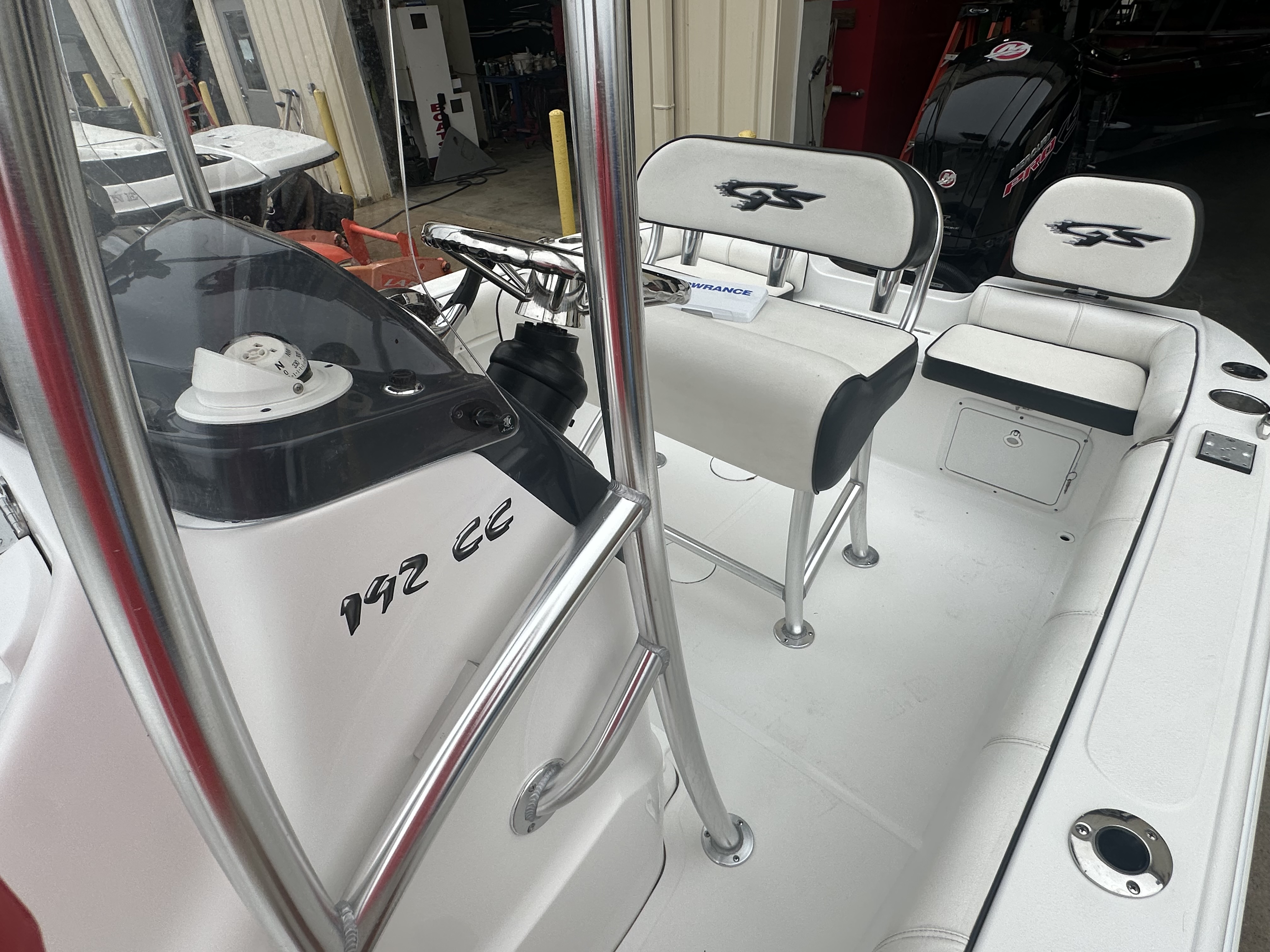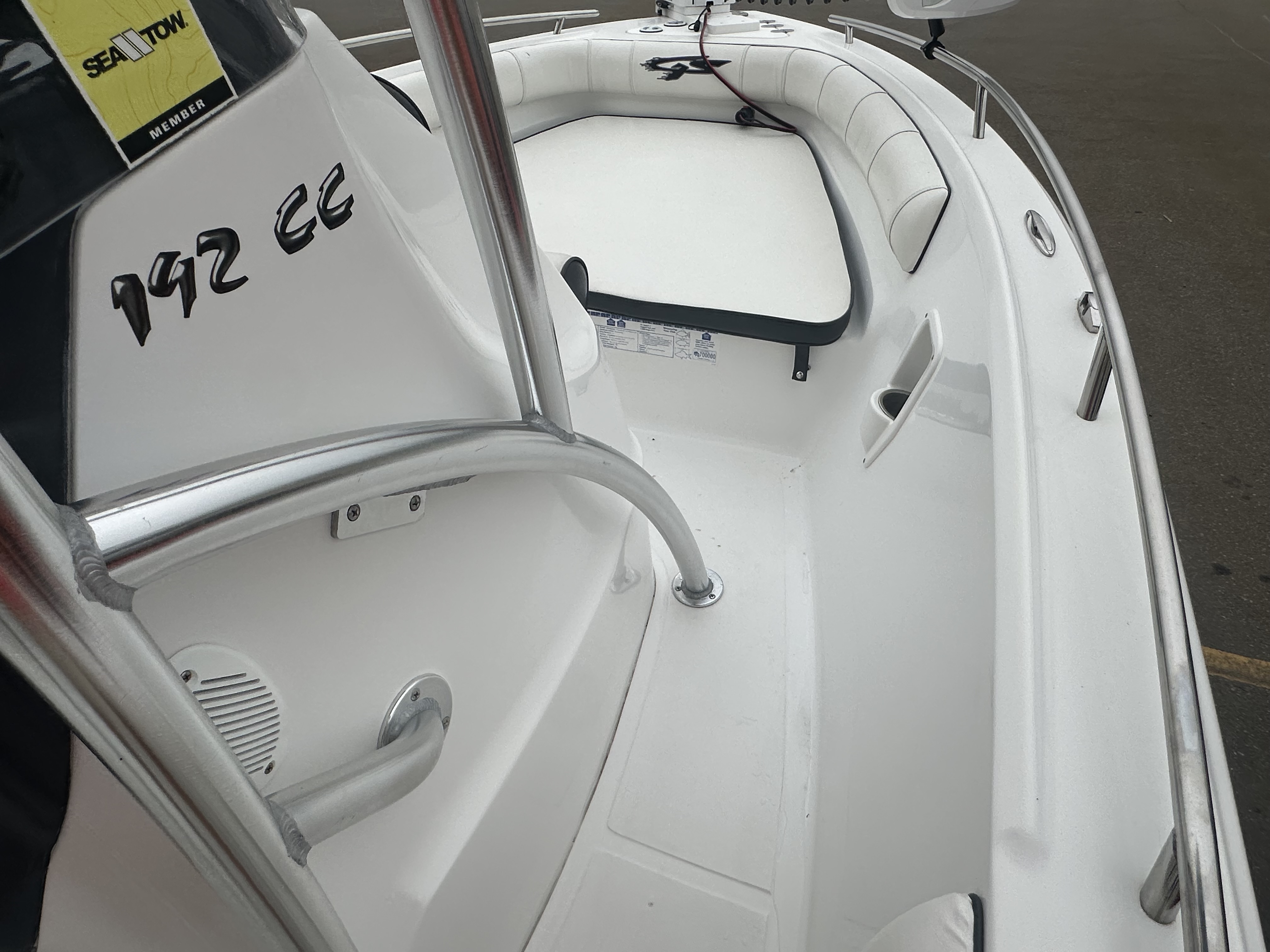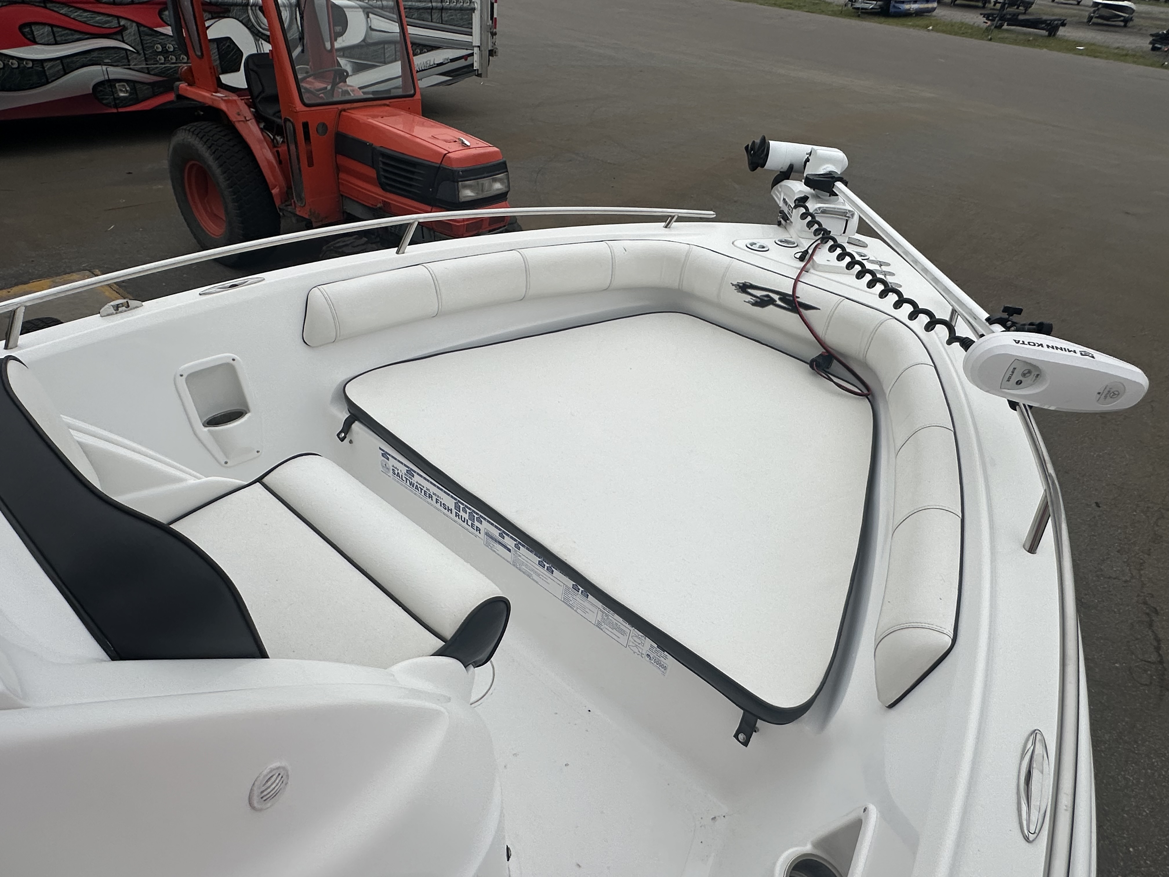 Boat comes with rear boarding ladder, removable aft seats, front removable bow cushion, MinnKota Riptide 80lb I-Pilot (hand control) with *Dual 24V Dakota Lithium batteries, 12V Dakota Lithium main crank battery, Simrad and Lowrance fish finders at console, compass, T-Top (rear light, speakers, storage compartment, lights), wash down system with fresh water and raw water option, battery selector switch, front and rear livewells and much more!