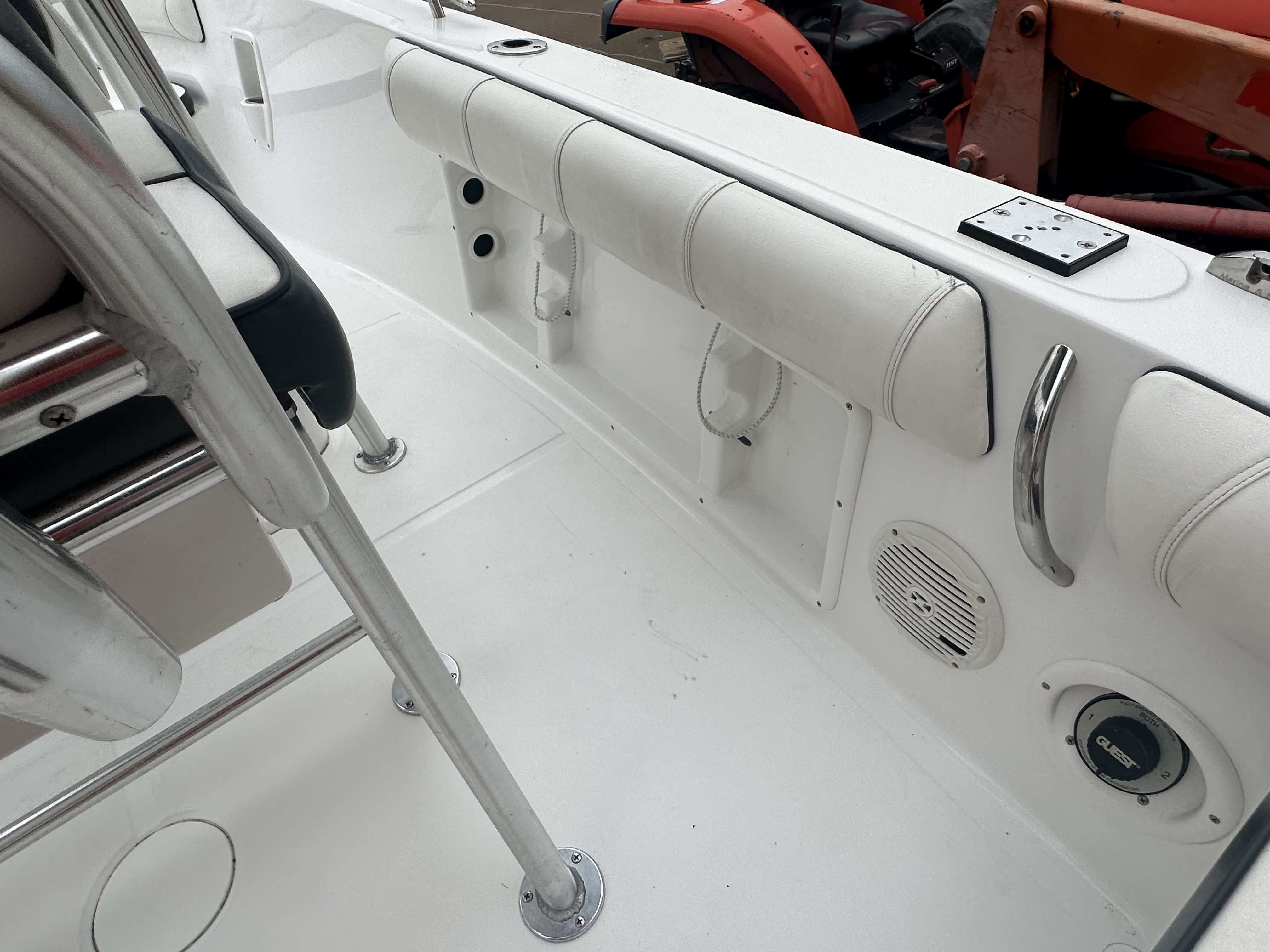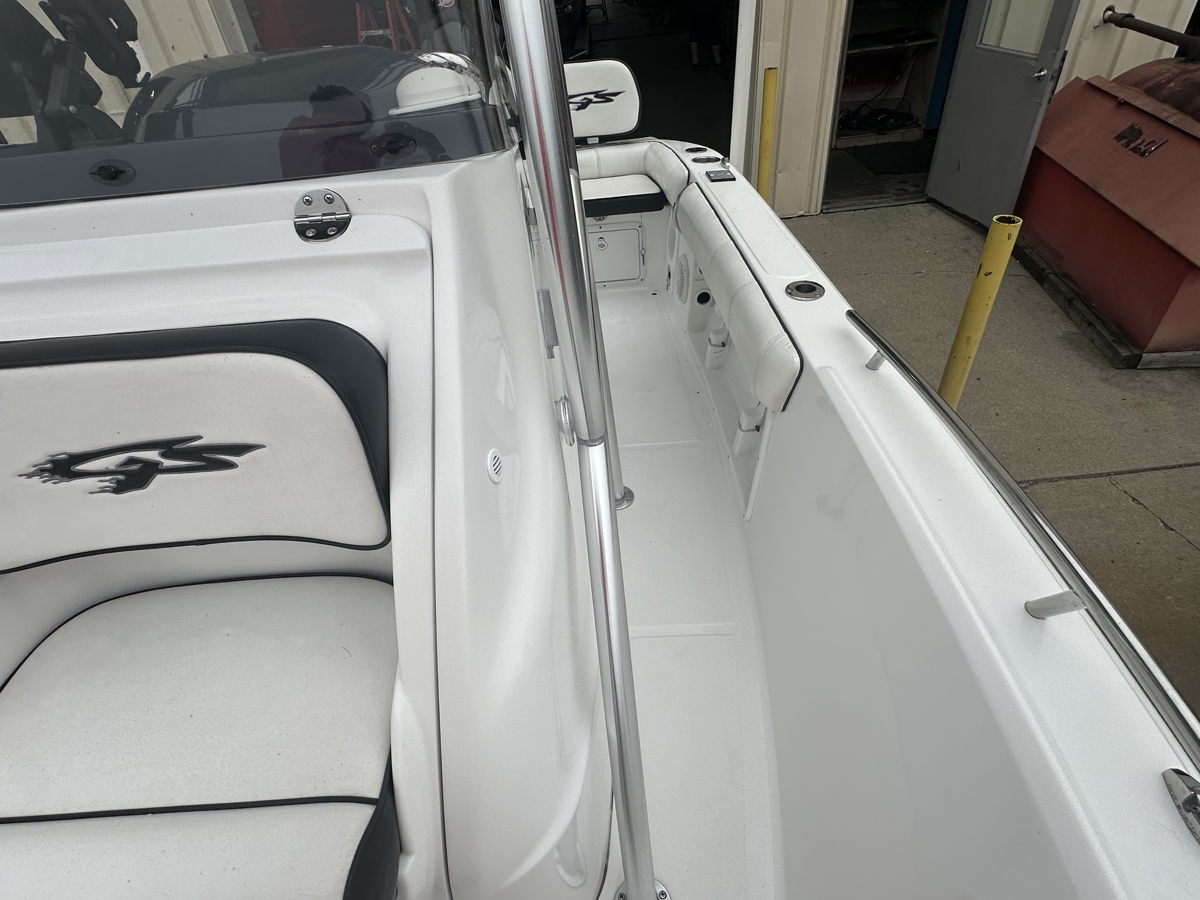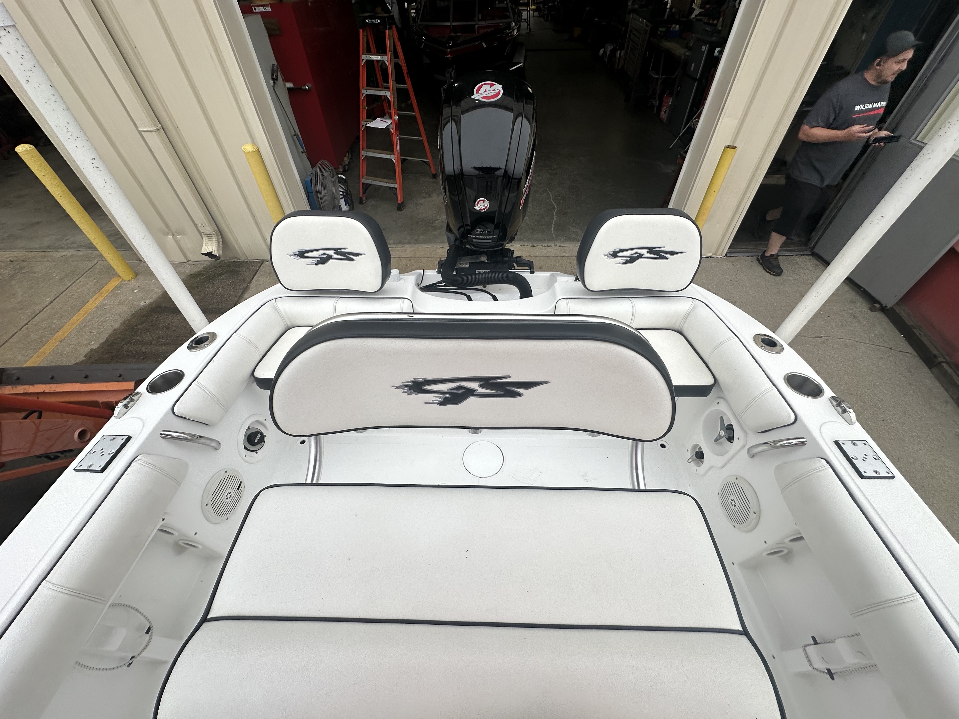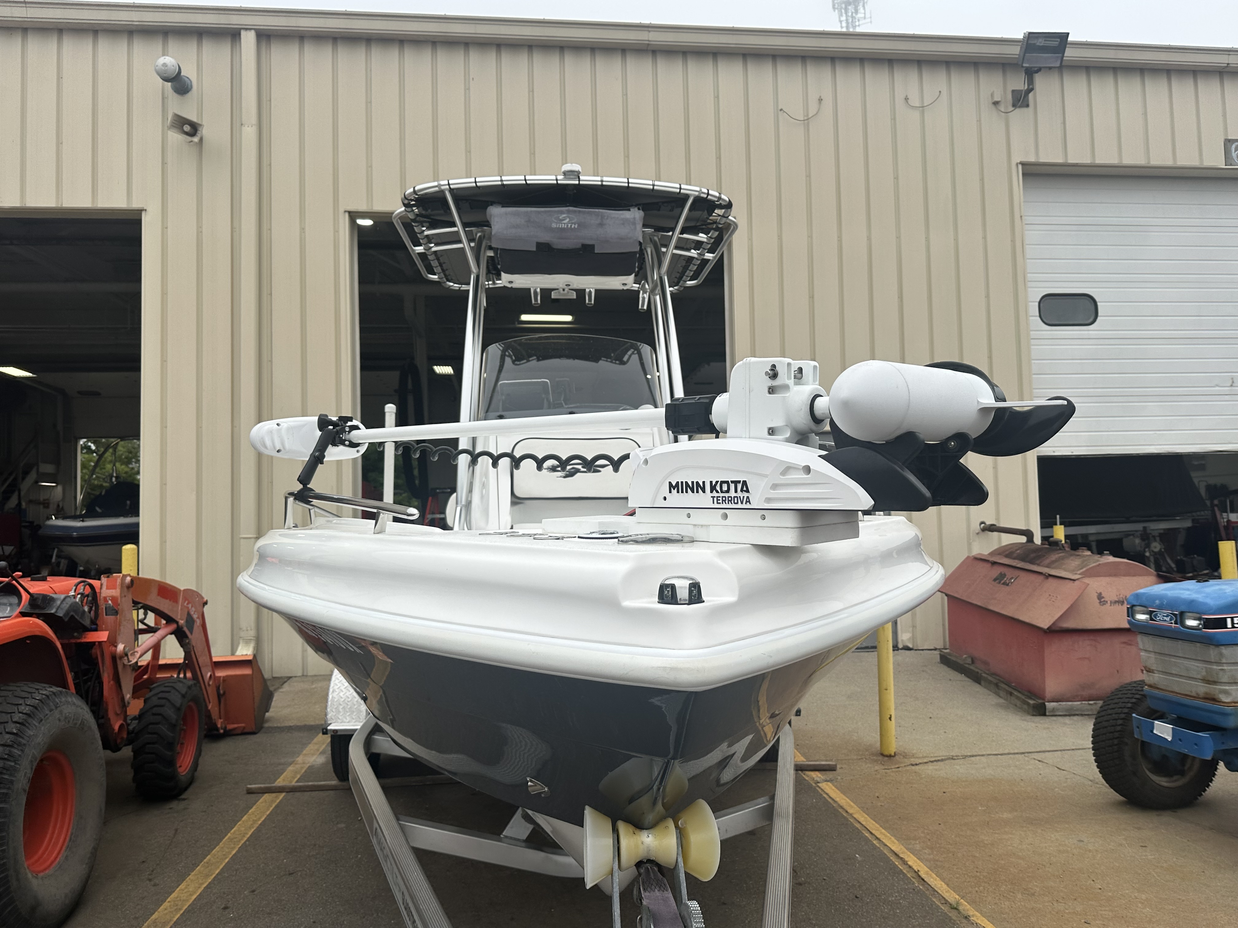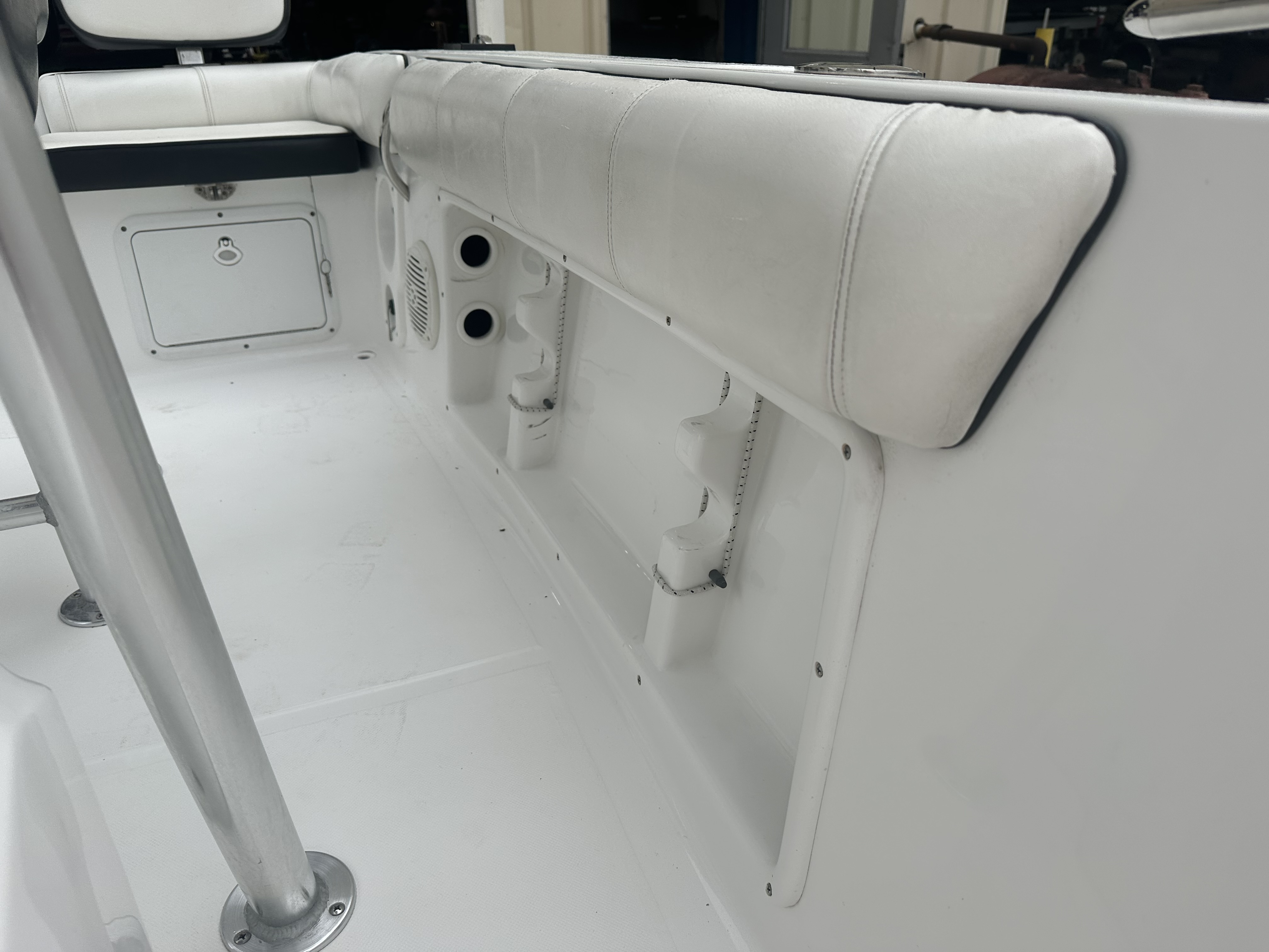 Boat comes with rear boarding ladder, removable aft seats, front removable bow cushion, MinnKota Riptide 80lb I-Pilot (hand control) with *Dual 24V Dakota Lithium batteries, 12V Dakota Lithium main crank battery, Simrad and Lowrance fish finders at console, compass, T-Top (rear light, speakers, storage compartment, lights), wash down system with fresh water and raw water option, battery selector switch, front and rear livewells and much more!