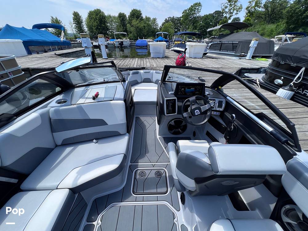 With an incredibly flexible layout, this one is at home as a relaxing pleasure boat or a very serious watersports machine. She has seating for 14 people and a kicking stereo that even has a remote control for the wakeboarder out back!