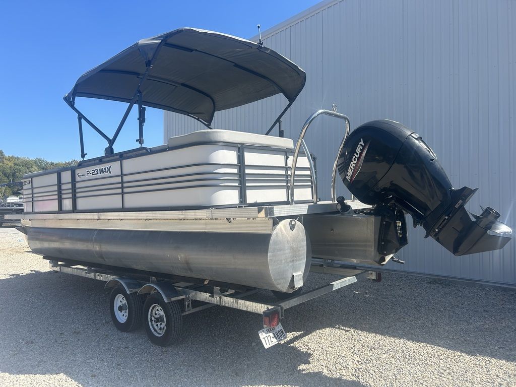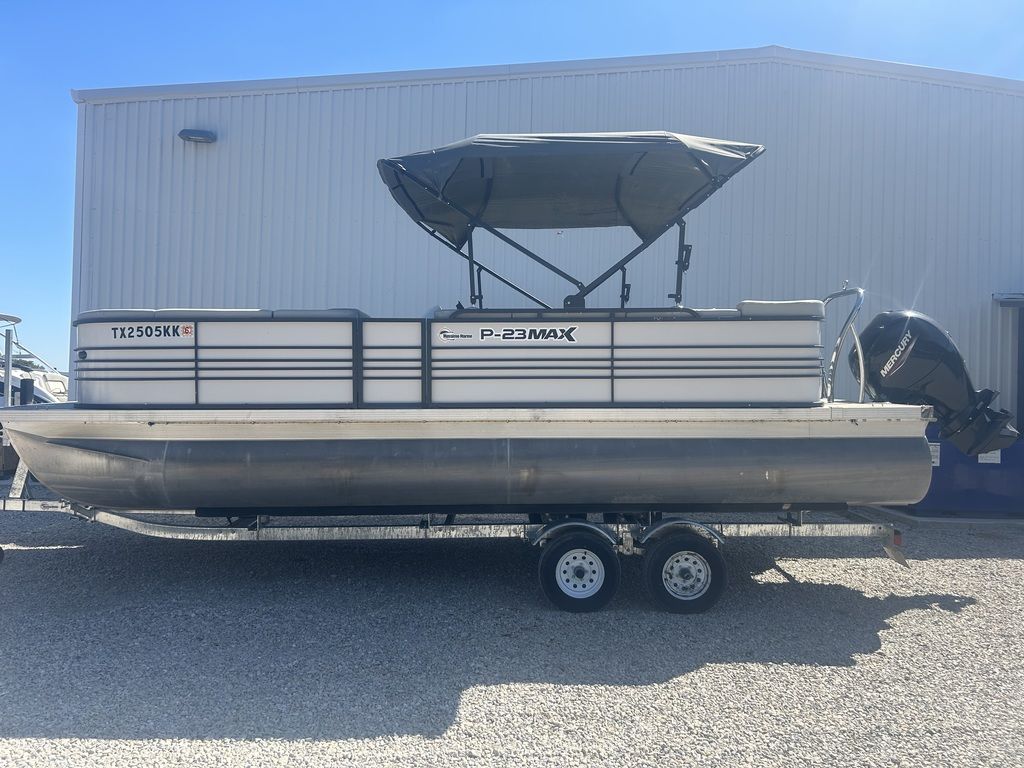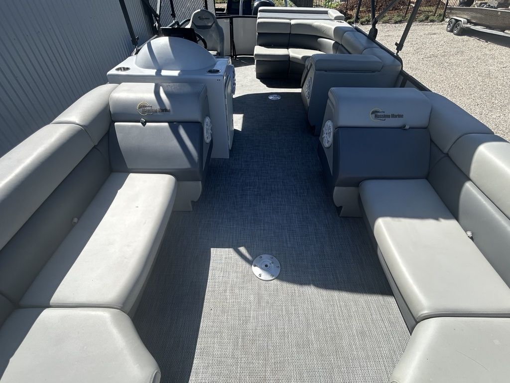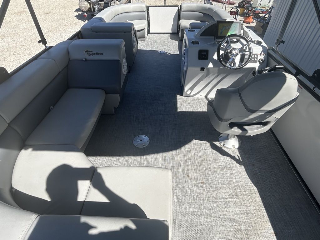 The 2021 Massimo P23 MAX is a 23-foot luxury pontoon boat manufactured in Garland, Texas, designed for day-cruising and watersports, featuring a Mercury Marine outboard engine, BOSS Audio sound system, ample seating for up to 11 people, and a shallow draft suitable for freshwater use. Specific configurations, like the P23-MAX Limited Edition, include features such as a pop-up changing station, RGB lighting, and a full boat cover.