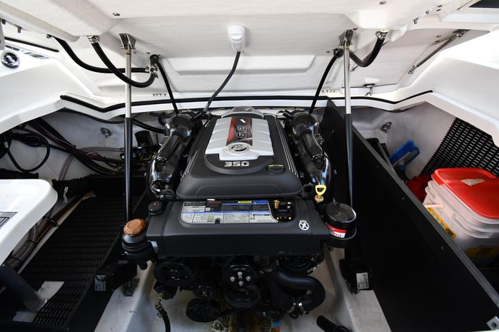 Freshwater / Great Lakes boat since new this vessel features a Single MerCruiser 6.2-litre 350-hp Gas Engine with Bravo II Sterndrive and less than 100 original hours. Notable features include but are not limited to the following: Venture Tandem Axle Trailer, Head w/Sink, Windlass Anchor, Raymarine AX7 GPS/Chartplotter, Raymarine EV1 Autopilot, Premium Sound System, Cockpit Wet Bar w/Norcold Refrigerator, Electric Wake-Tower (Radar Arch) w/Bimini (Note Cockpit / Bow Canvas Mooring Covers, and MUCH more!