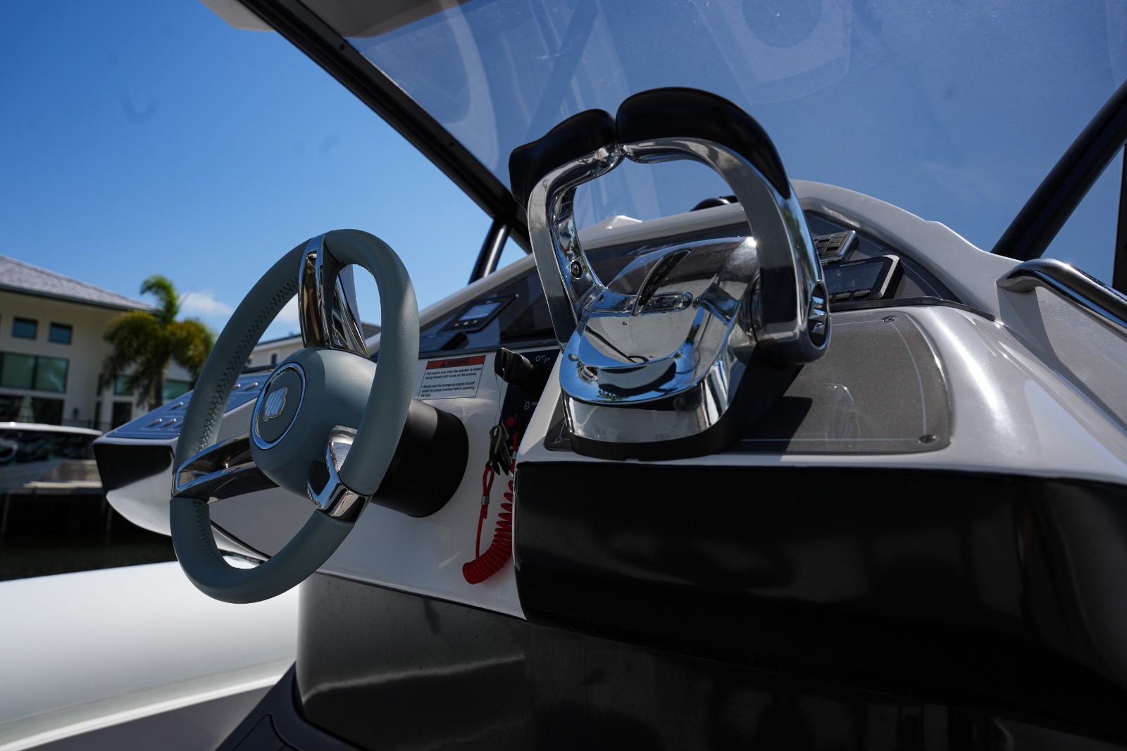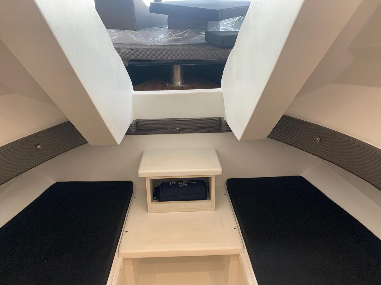 The boat also boasts a number of practical features, including an automatic cabin door, an automatic table on the bow that can be converted into a sunbed, and aft sunbeds. For even more convenience, you can add a deck ice maker, cooler, and grill. The T-top provides shade and protection from the elements.