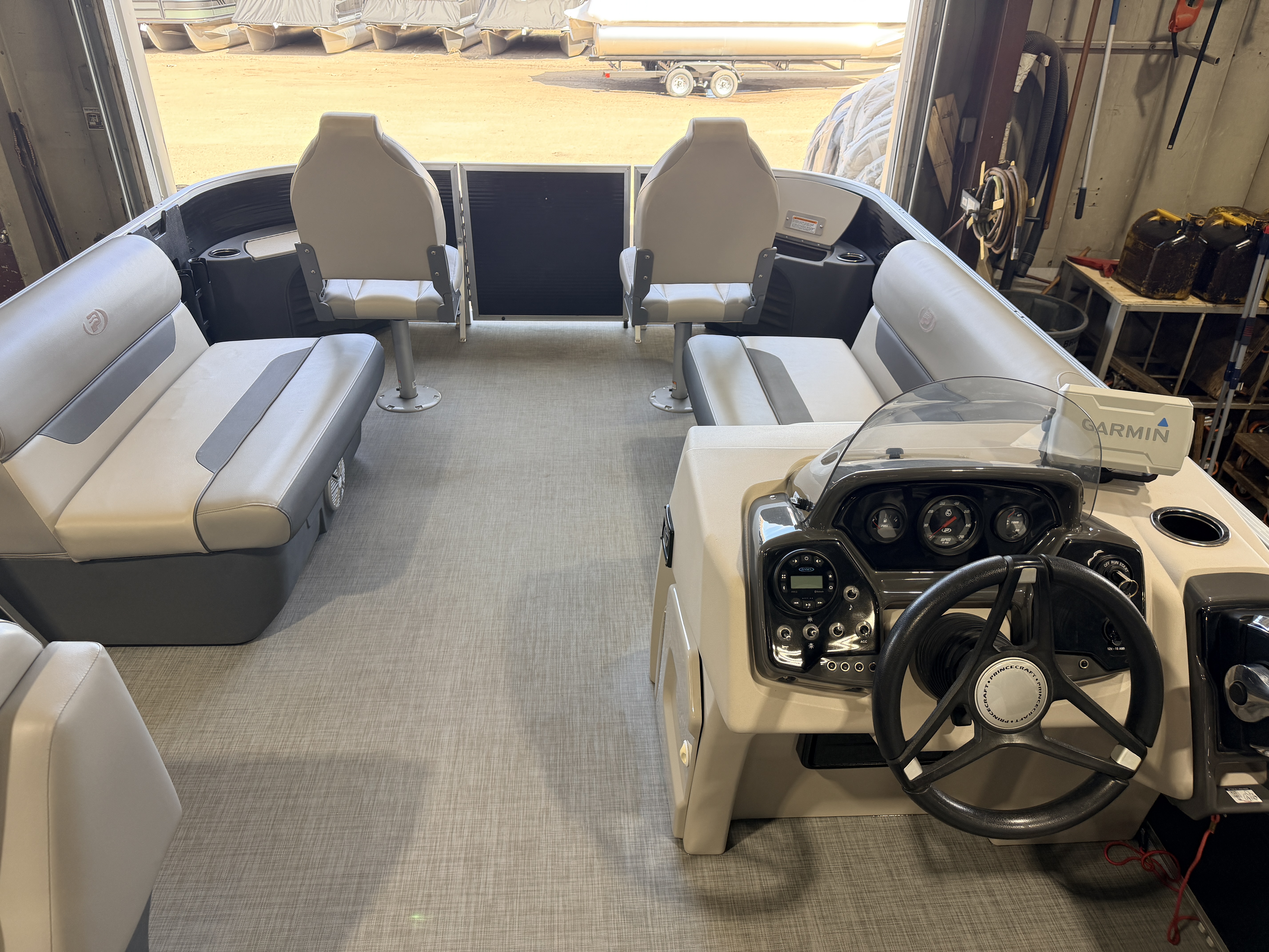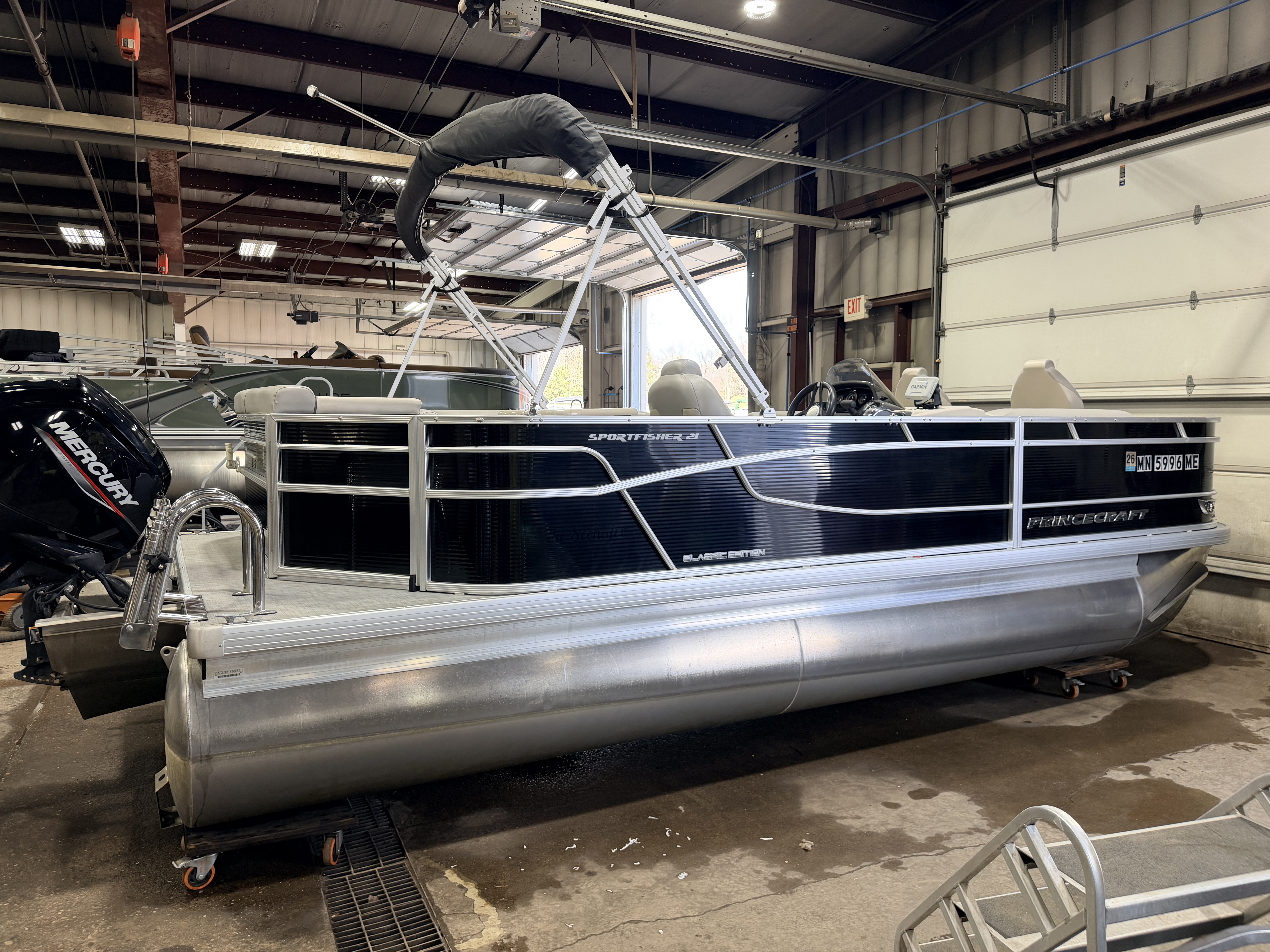 2021 Princecraft 21 Sportfisher 2-S Pontoon & 90HP Mercury Fourstroke EFI. Seating includes 2 Bow Fishing Seats, 2 Bench Seats, an L-Shaped Couch and an aft Sun Deck. Features include Vertical Storage rack, Livewell, Courtesy Light, Tachometer, Fuel and Trim Gauges, Jensen Bluetooth Stereo, Bimini Top, Table, In-Seat Storage, and Stainless Steel Swim Ladder. Additional features include Garmin GPS Depth/Fish Finder.