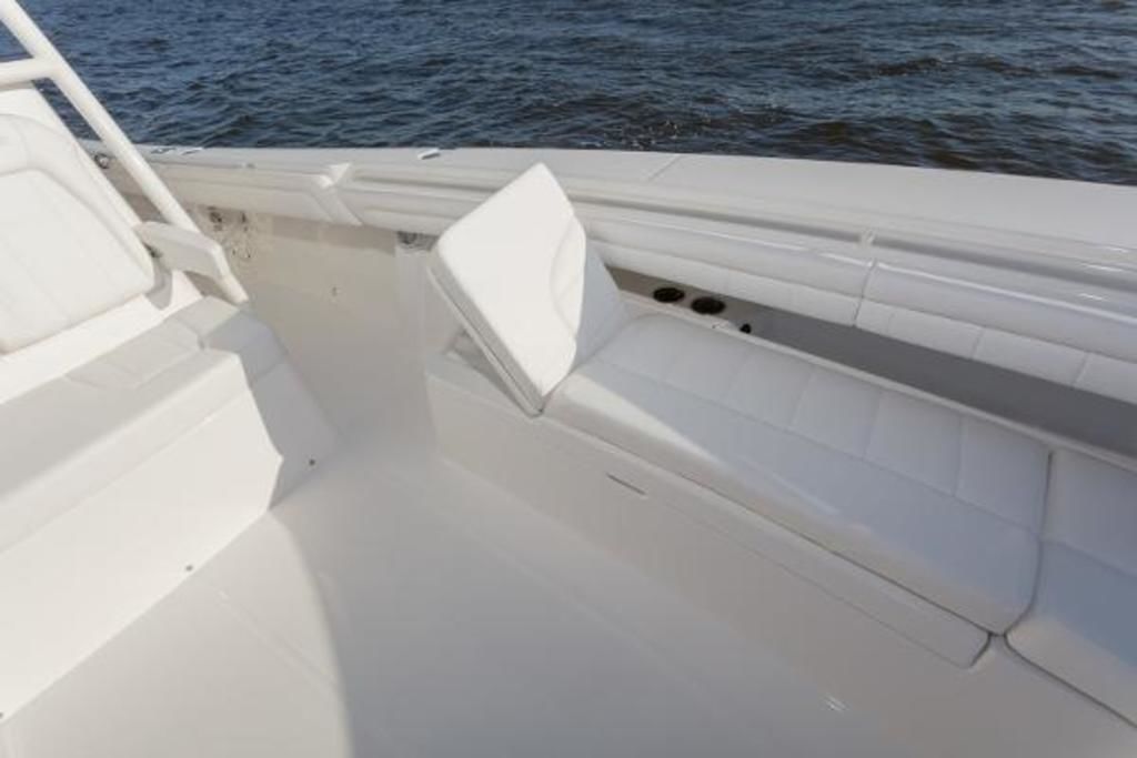 Powered by Triple White Yamaha 300's with only 825 Hours, Helm Master EX joystick system, SEA KEEPER 2 , AIR CONDITIONING, Custom "Pastel Green " Hull with Navy blue boot stripe, Rear Sunshade, Forward Sun Shade, New style T-Top with integrated windshield, Optimus Power steering, Garmin Offshore Package w/ auto pilot, Garmin Fantom 124 radar Upgrade, LED multi colored under water lights, NEW STARLINK 2025 and much more !!