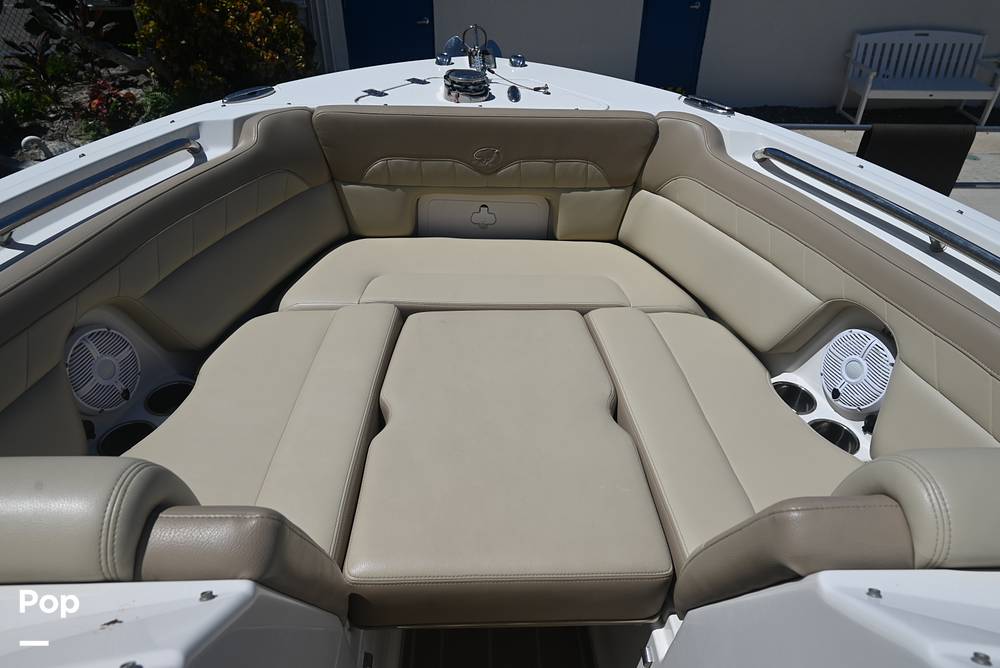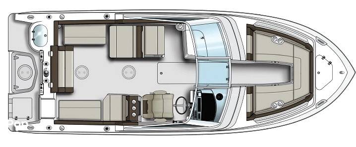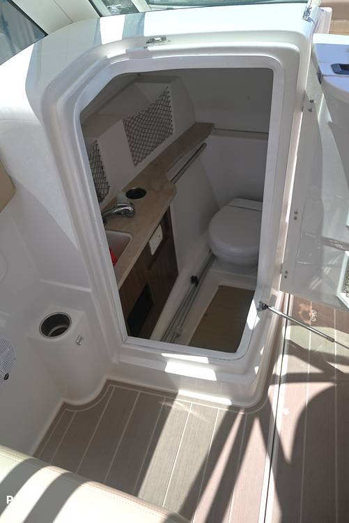 This is a great crossover boat! There is plenty of room and tons of storage for the whole crew with cushioned bow and cockpit seating for up to 12. Family-friendly features include a fully enclosed head compartment with toilet, sink, vanity, handheld shower, and port light. Also, a convertible port side seat with a reversible backrest that folds flat to convert into a lounge. For entertaining, the boat is equipped with a Fusion sound system and a cockpit wet-bar with a mini fridge. In the rear, there is a large convertible sun-pad lounge at the transom with access to the integral swim platform with freshwater shower.