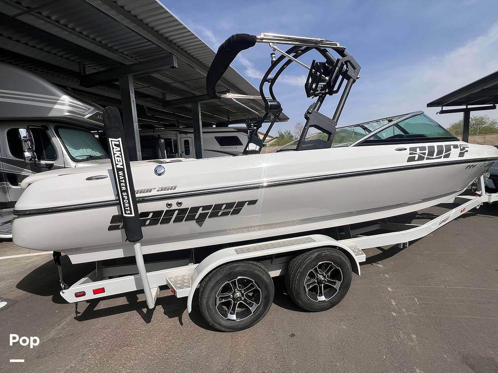 This 2021 Sanger V237 Surf boat is designed to be an all around family style boat. Whether you like to cruise, pull tubes, ski, wakeboard or surf, the Sanger is equipped to please all.