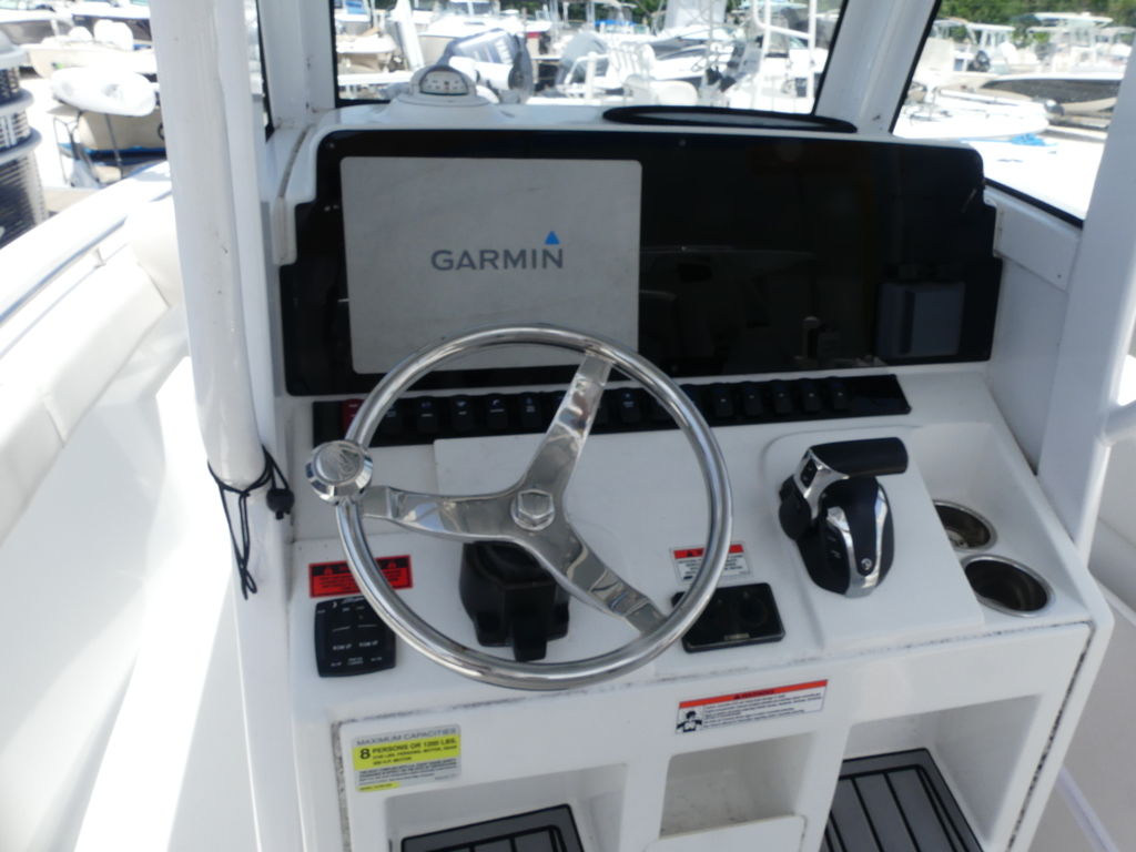 Integrated Fiberglass T-Top with Tempered Glass Enclosure- Our integrated tempered glass enclosure protects you from the elements while providing excellent air flow. At the touch of a button, an electric actuator opens the front window and air flows freely at the helm to keep you cool. Our oversized fiberglass T-Top comes complete w/ LED Lights, a vapor mist cooling system, (2) 6'' JL Audio Speakers, (4) Rod Holders, outrigger plates, spreader lights, an anchor light, and an electronics box. The integrated D-Tubing design on the legs allow the top to sit snug against the console giving you even more cockpit room.