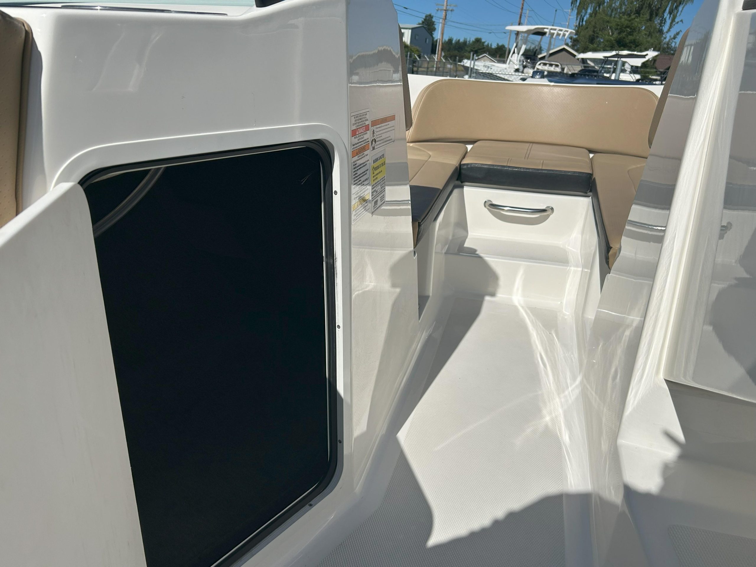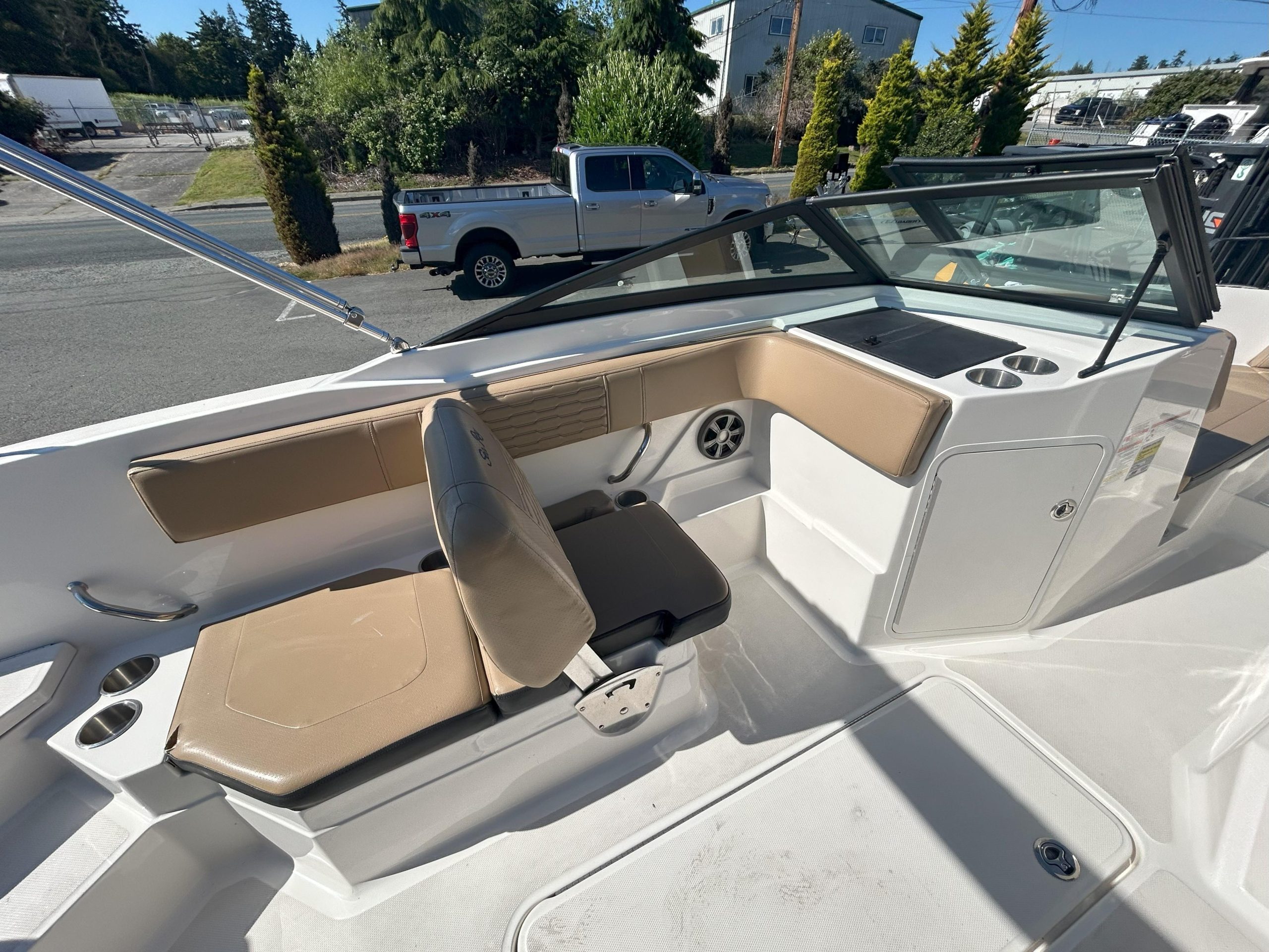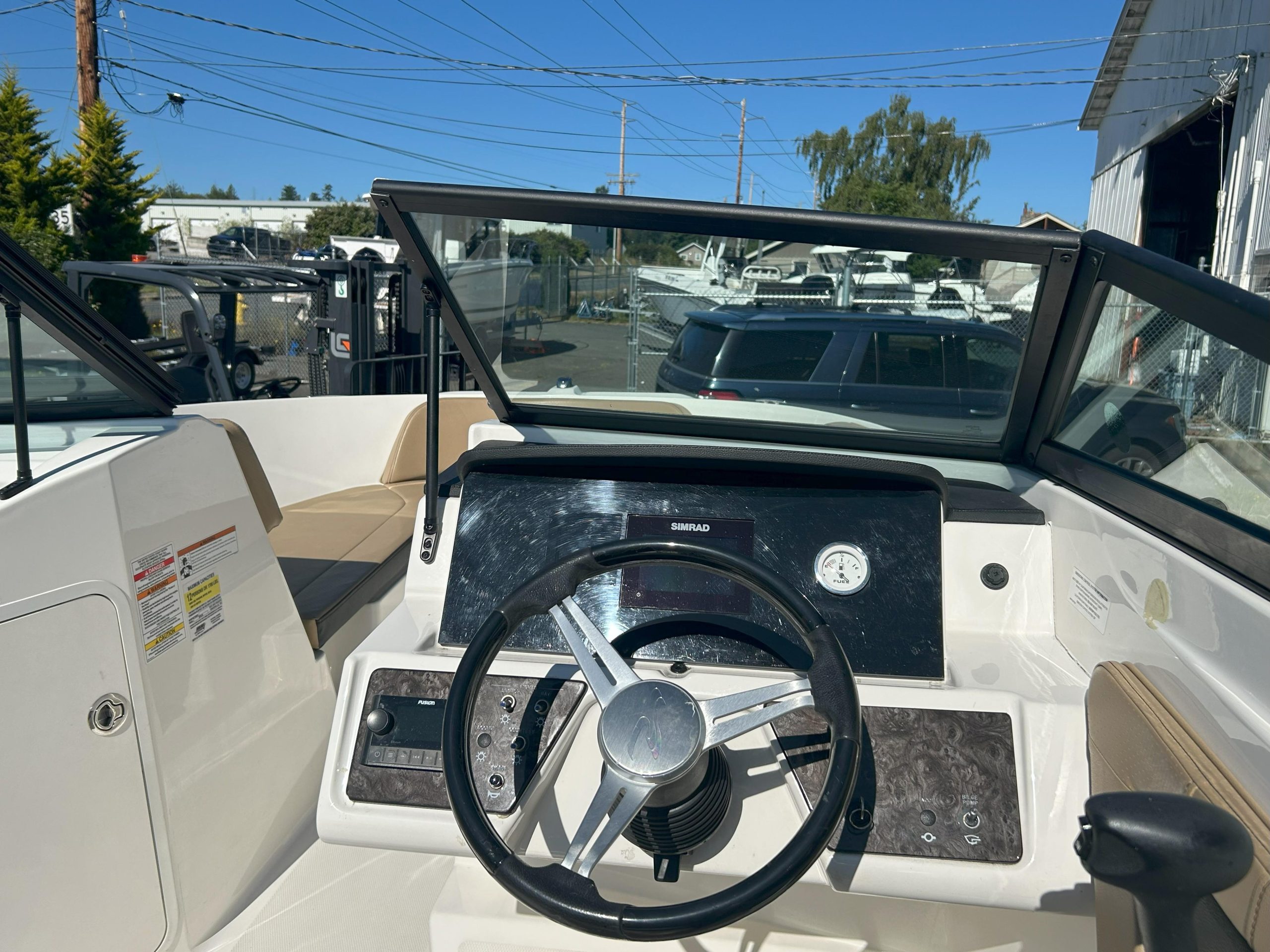 Electronics & Entertainment: Navigate easily with the 7" Simrad Digital Dash, which provides essential vessel information. Keep the good times rolling with the integrated Fusion stereo system, perfect for enjoying your favorite tunes on the water.