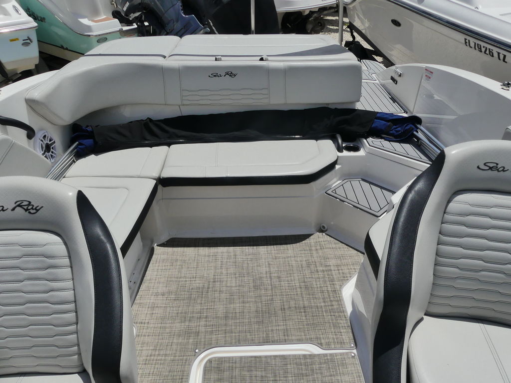 This 2021 Sea Ray SPX 210 comes equipped with a variety of features that enhance comfort, performance, and usability. The wide swim platform with an integrated ladder makes boarding and water activities effortless, while the spacious cockpit and bow seating provide plenty of room for guests. The helm is designed with user-friendly controls and clear instrumentation, ensuring confident navigation. Additional highlights include ample in-floor storage for gear, premium seating throughout, and a Bimini top for shade on sunny Florida days. The boat’s versatile layout supports everything from cruising and entertaining to watersports, making it an excellent option for family boating enthusiastsr.