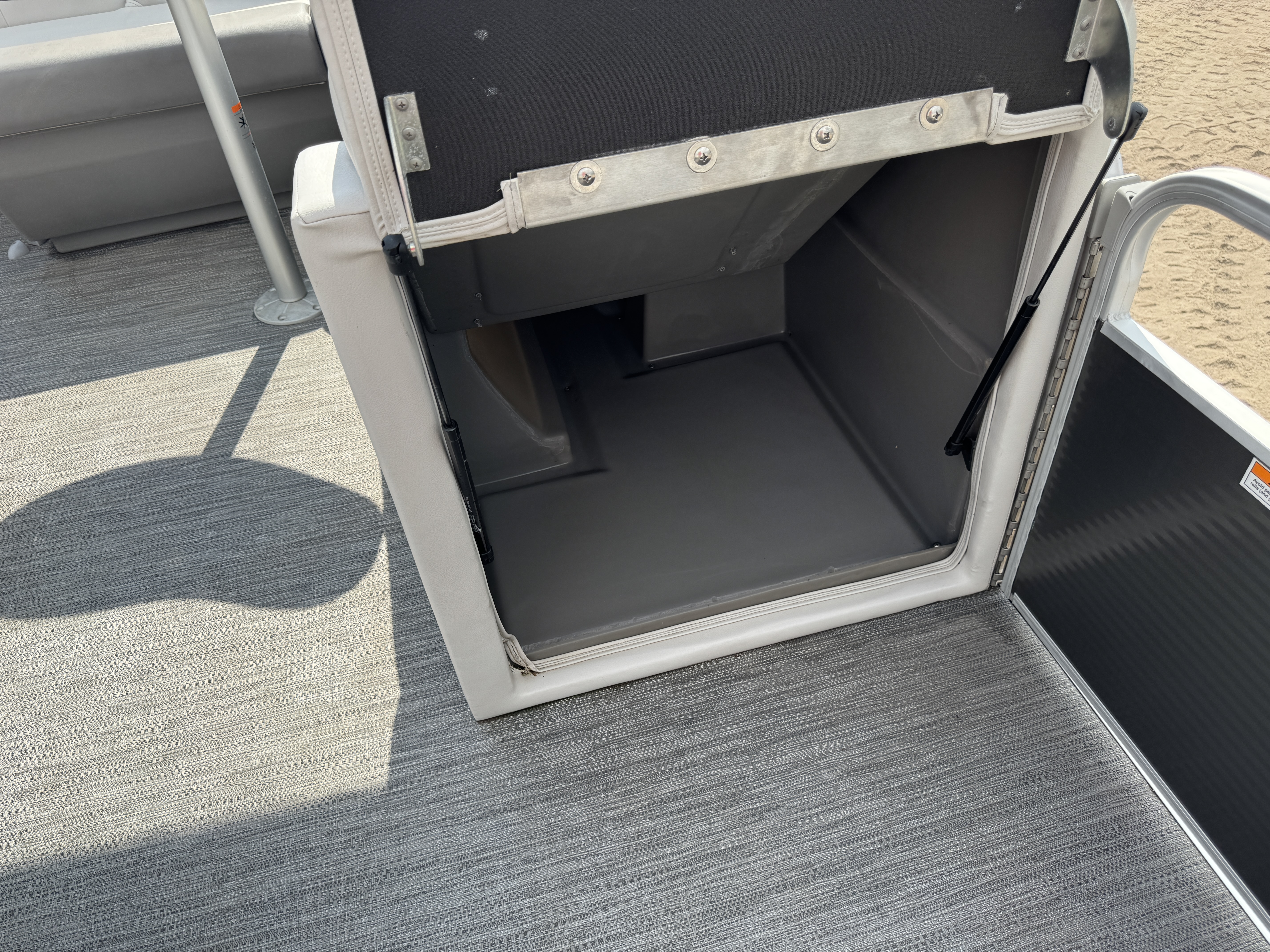 the couch has a large storage area. The helm features a Tachometer, Fuel and
