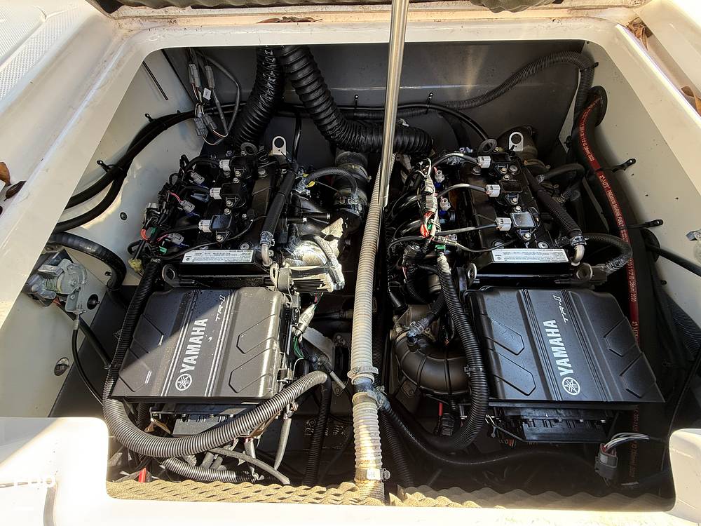 Power comes from twin Yamaha TR-1 1049cc jet drives, delivering strong performance, shallow-water capability, and 360-degree fishability without outboard engines in the way. The helm is well laid out and features a large Simrad GO XSE chartplotter along with Yamaha's Connext touchscreen control system, providing intuitive access to navigation, engine data, and onboard systems. A quality marine stereo rounds out the helm electronics.