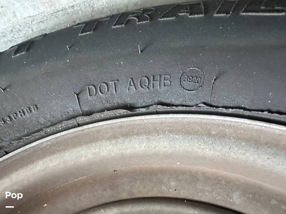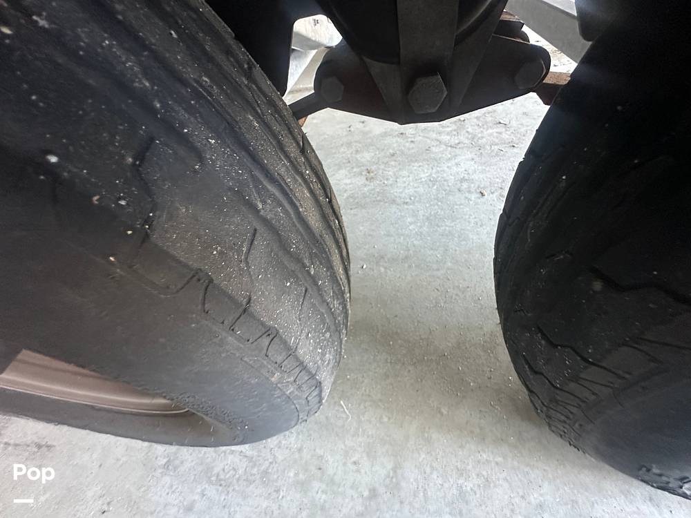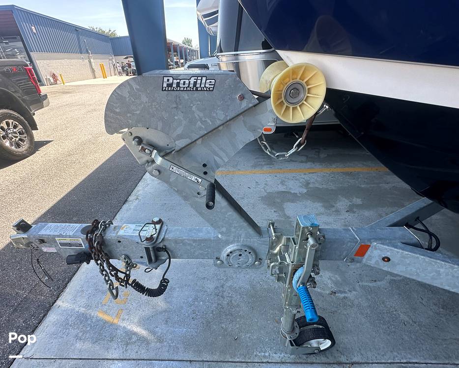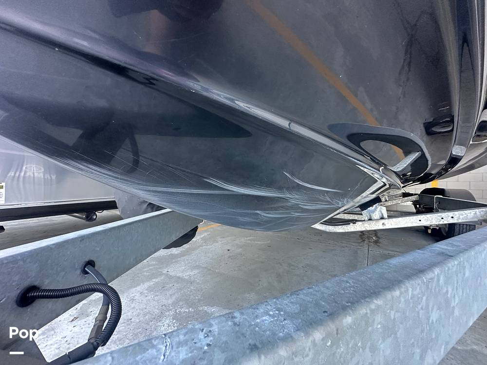 This 2021 Yamaha 252SD is powered by twin high-output Yamaha 1.8-liter engines. The vessel can comfortably accommodate 12 passengers. It is sitting on a dual axle trailer with 2 brakes, a swing tongue, and a spare tire.