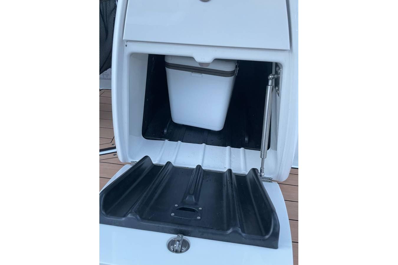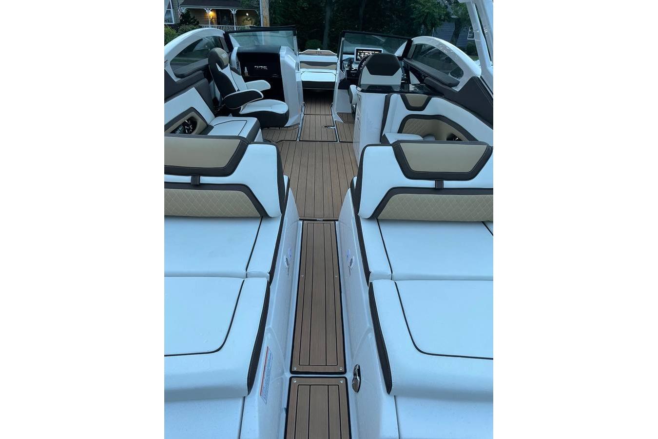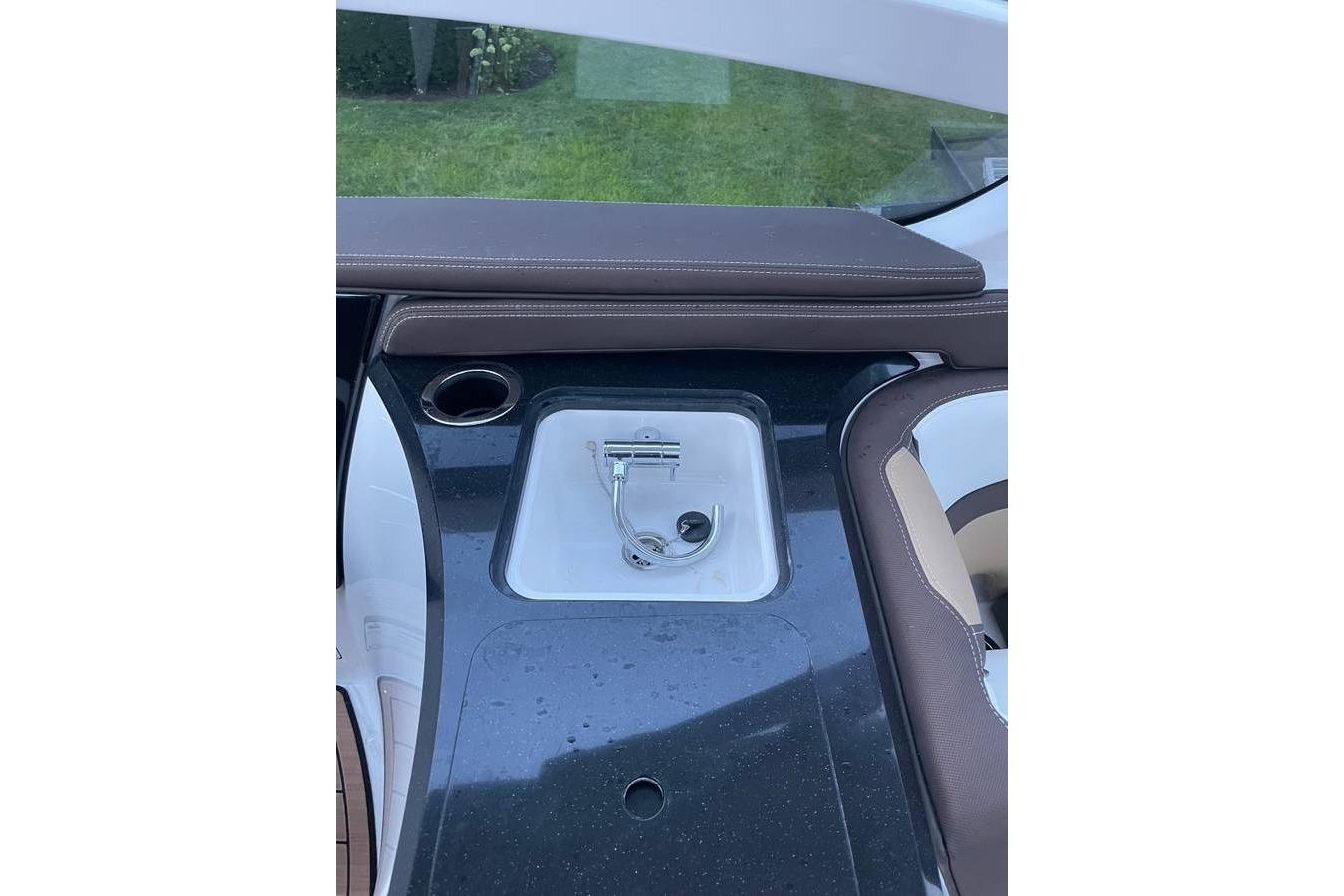 Single-owner, like-new condition · factory warranty to 2026 · premium snap-in woven flooring · removable bow/stern dinette tables · bow filler cushions (multiple layouts) · hinged seat cushions · chrome drink holders · tilt helm · adjustable captain’s chairs w/ flip-up bolsters (helm & companion) · lockable glove box · retractable windscreen · integrated removable cooler · enclosed, lockable head compartment w/ portable head & counter · galley w/ sink, extended counter & lockable stowage · dedicated anchor & rope locker · upgraded aluminum handles/accents · cockpit drainage system (CDS) · removable transom gate