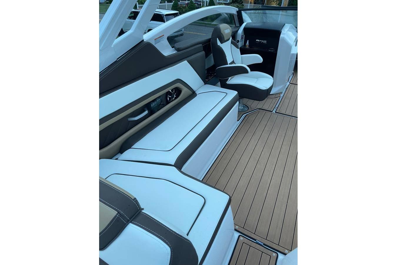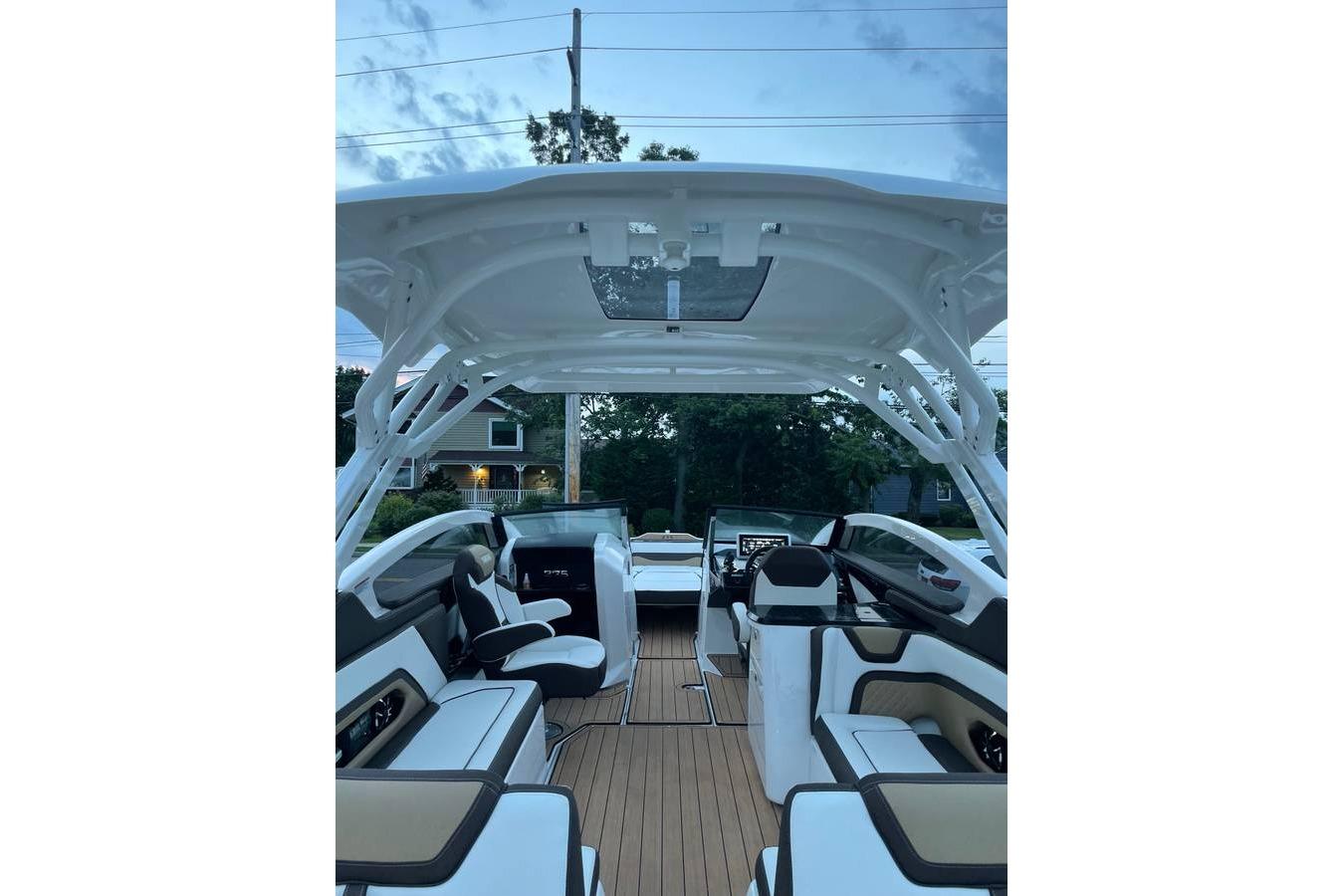 On deck, the layout flexes from family cruise to sandbar session in seconds: snap-in woven flooring underfoot, convertible bow and stern dinettes, abundant hinged seating, and a proper galley with sink and lockable stowage. A lockable enclosed head boosts comfort for full days aboard, and the signature swim platform, with upholstered backrests, marine-mat, freshwater shower and a telescoping ladder, keeps you right at the water’s edge.
