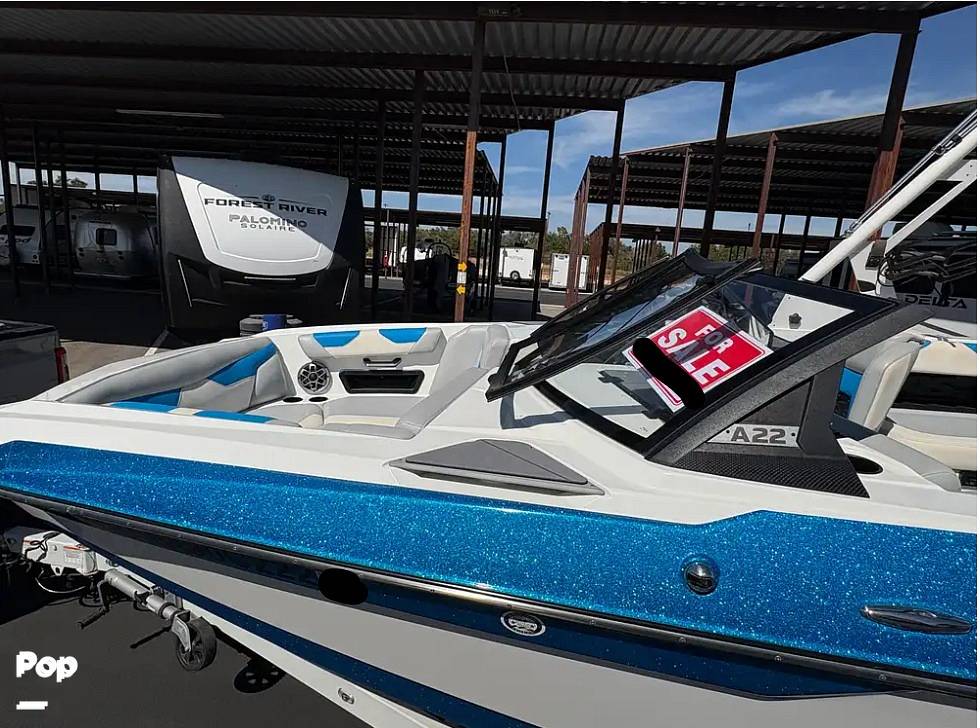 For wake customization, the A22 offers advanced features like the Surf Gate, which hydraulically shifts ballast for adjustable wave side, and the Power Wedge III, which fine-tunes the stern profile for surfing.