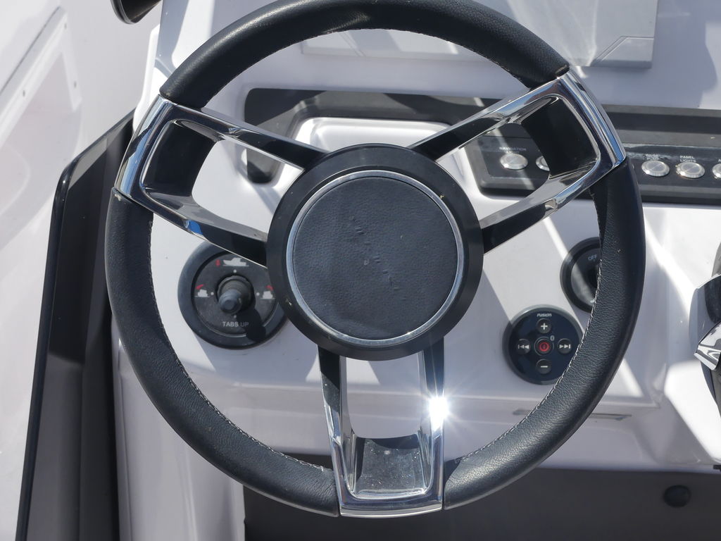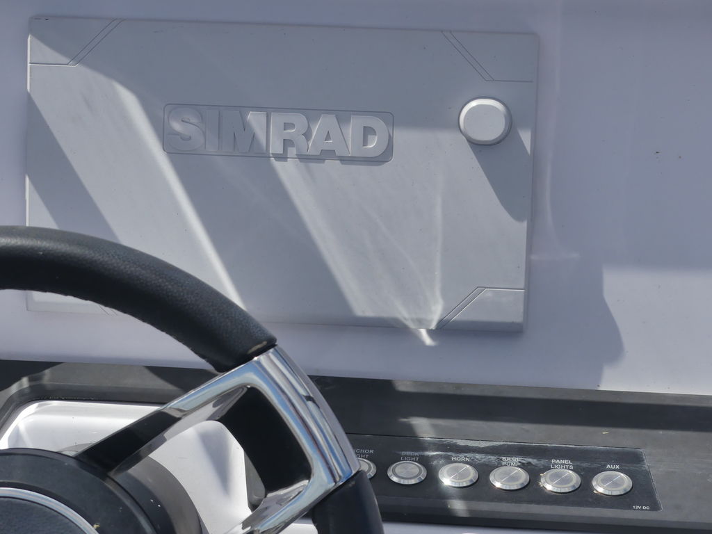 Helm: Ergonomically designed with a clean layout, illuminated push-button controls, a leather steering wheel, and premium electronics such as a Simrad Chartplotter and echo sounder.