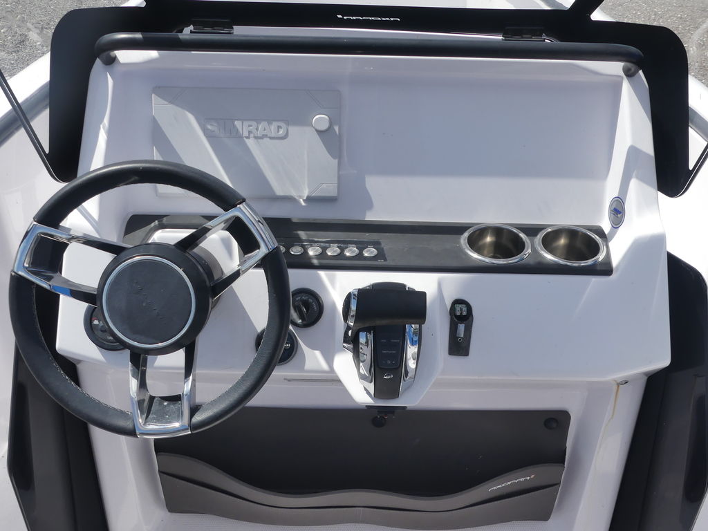 Helm: Ergonomically designed with a clean layout, illuminated push-button controls, a leather steering wheel, and premium electronics such as a Simrad Chartplotter and echo sounder.