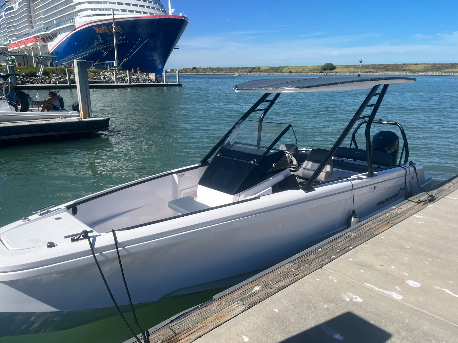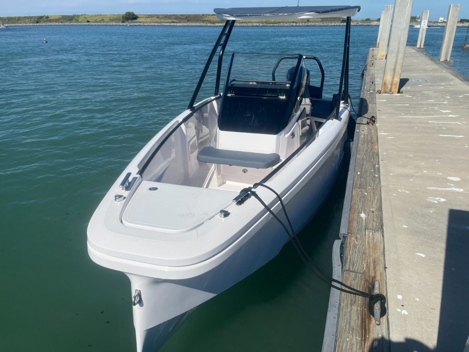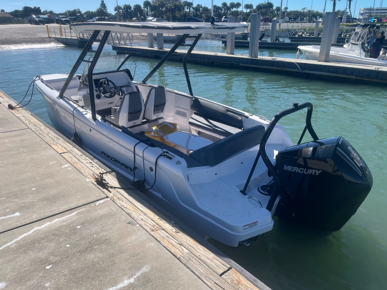 The Axopar 22 T-Top adds a new dimension of functionality to the Axopar 22 range. The cool-looking Axopar 22 T-Top offers some of the best-in-class handling and performance on the market, combined with solid, competitive pricing. Designed so that it takes nothing away from the thrill and sheer enjoyment of the open Axopar 22 T-Top takes the ownership experience further. The all-weather T-Top roof consists of a fixed canvas top within a GRP surround, mounted to a raked-back, cool-looking, black painted aluminium targa-frame. This boat is powered by a brand new 200HP Mercury motor and includes a 3-year warranty with Mercury Marine!