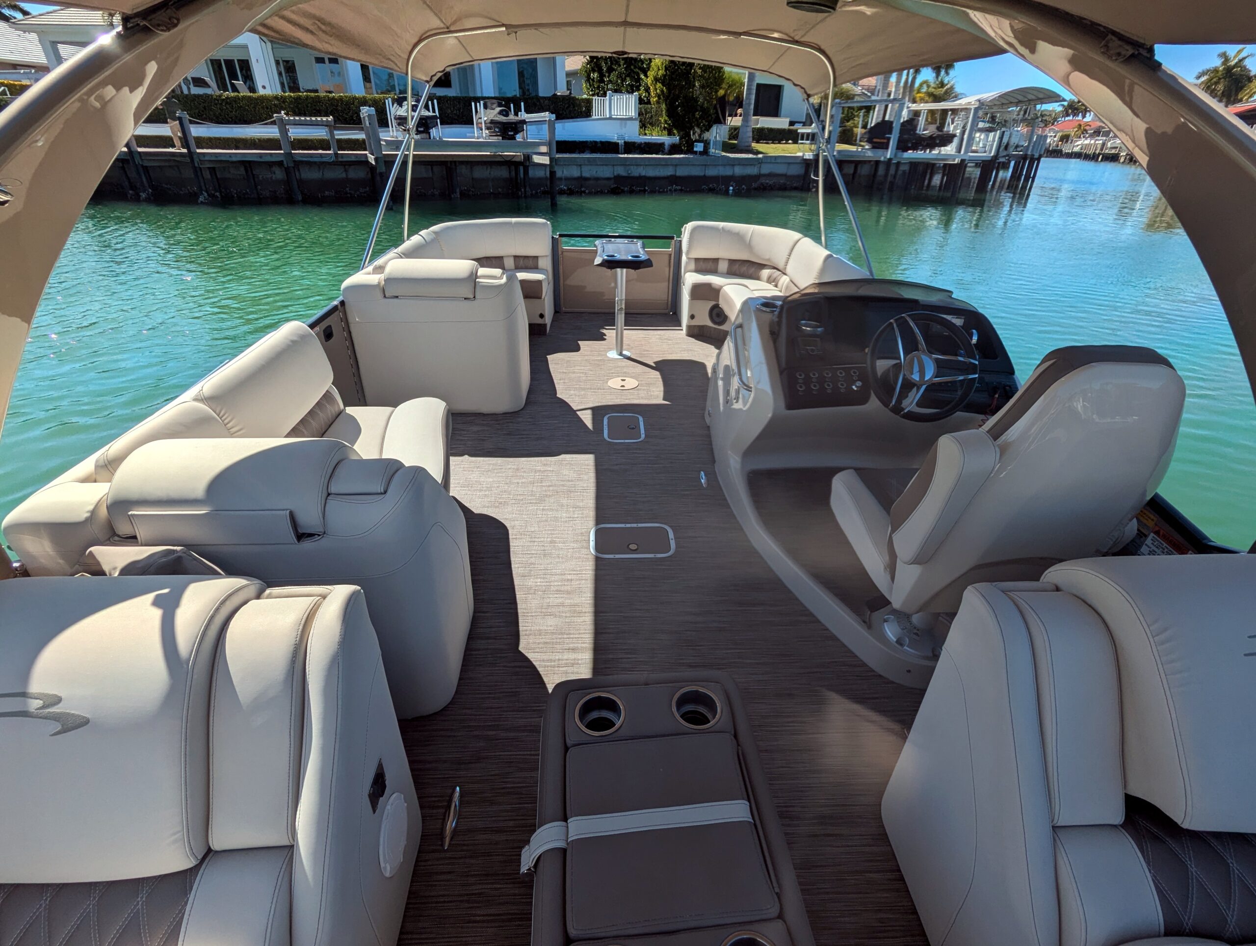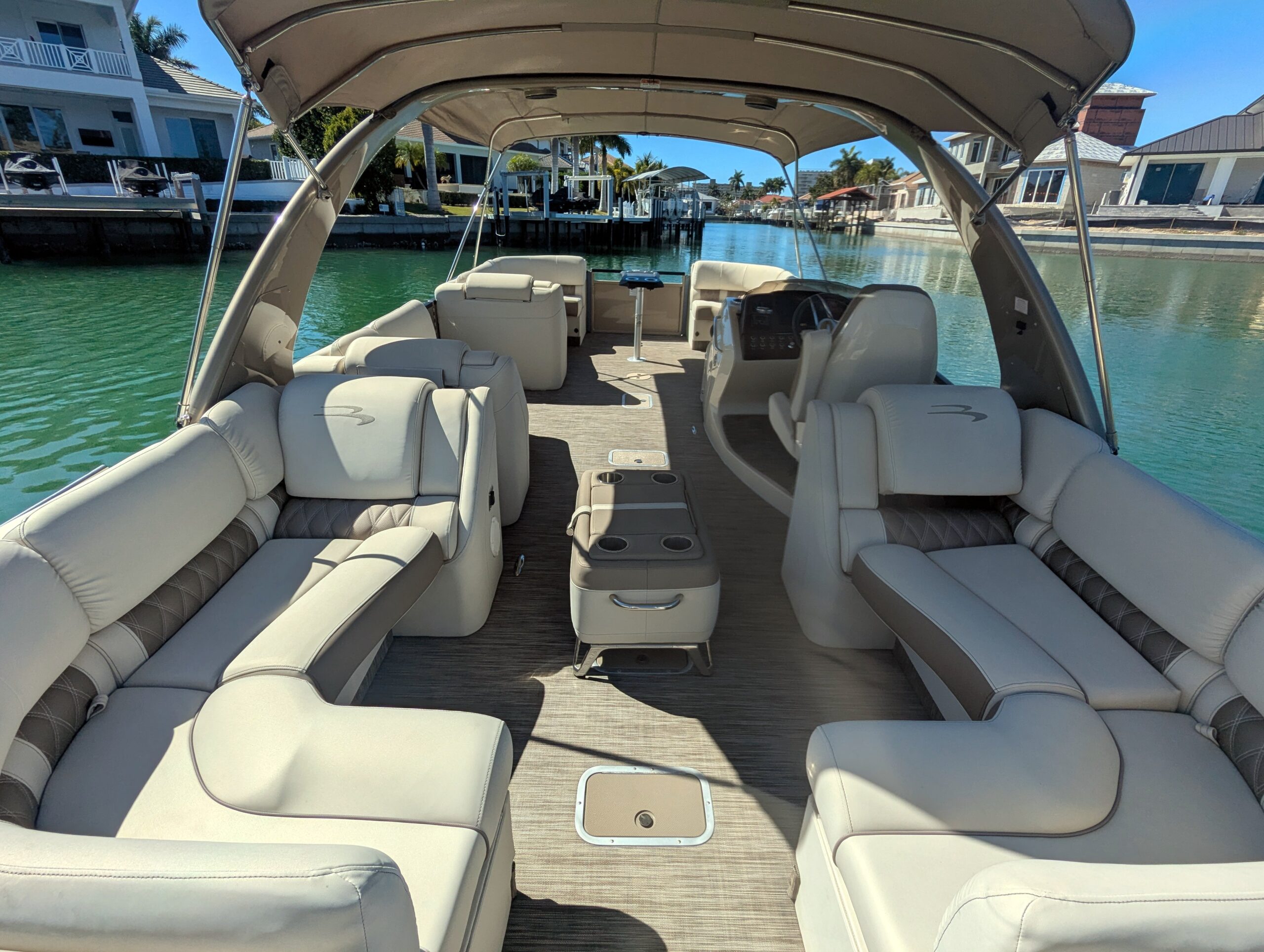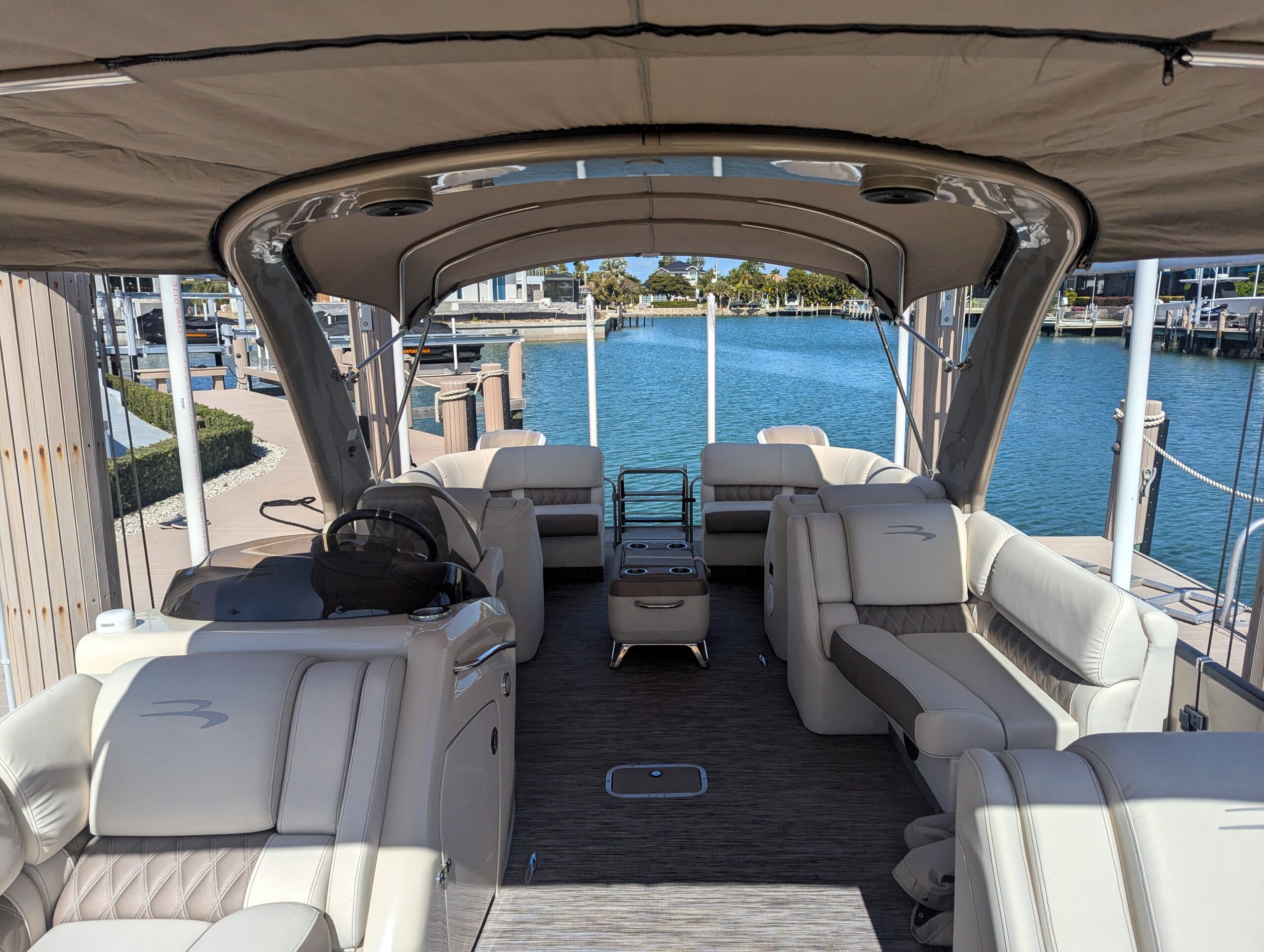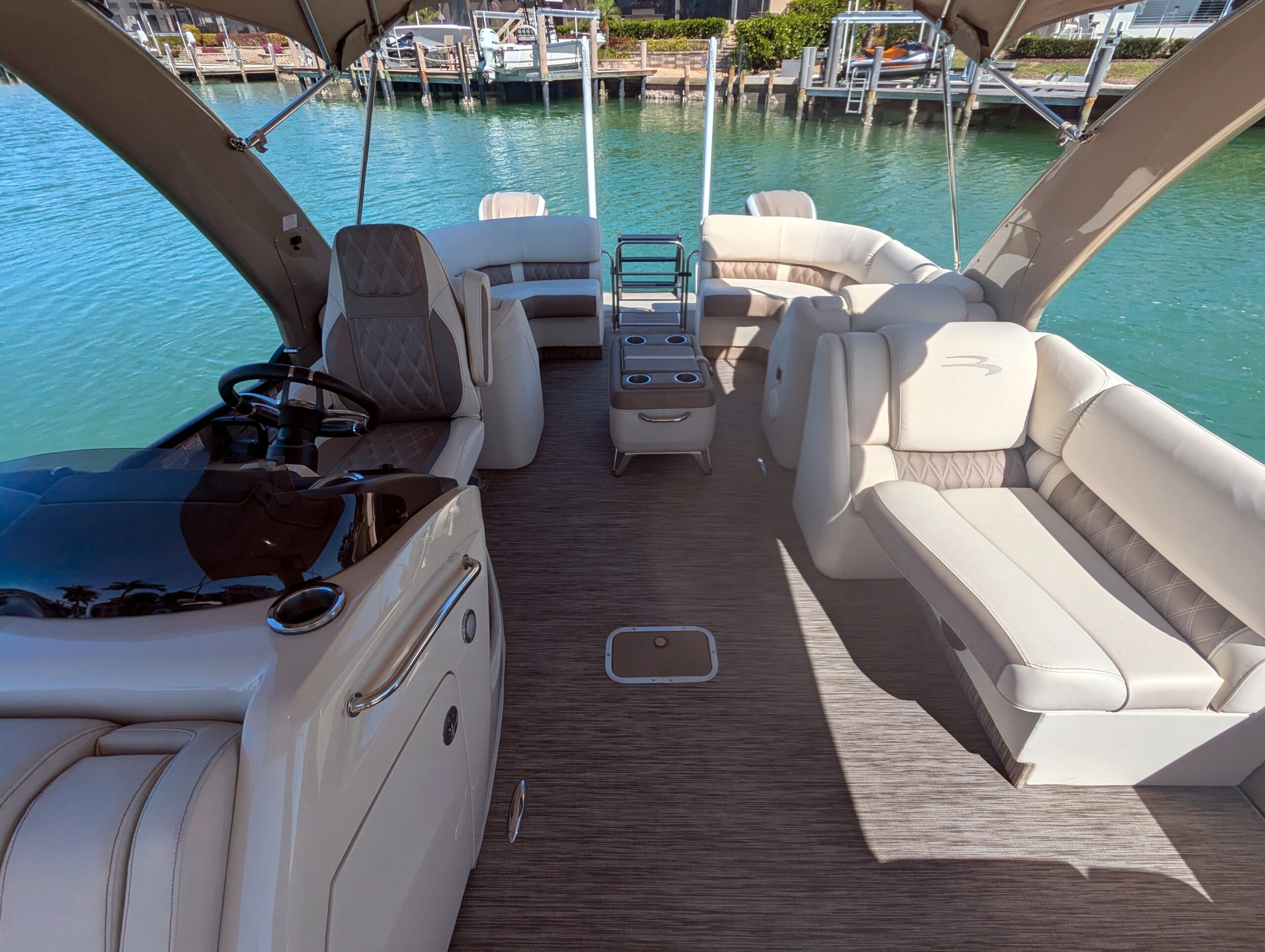 A double bimini arch provides excellent shade and completes the sleek, upscale profile of this boat. Every detail reflects Bennington’s top-tier craftsmanship and thoughtful design.
