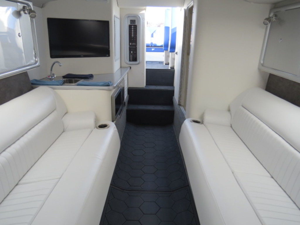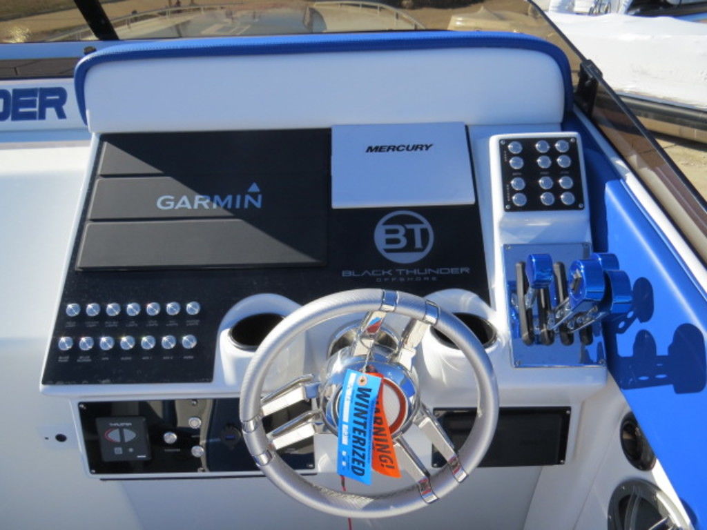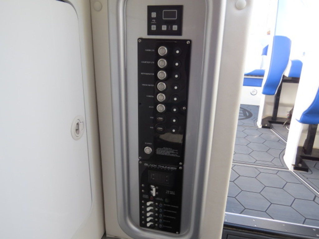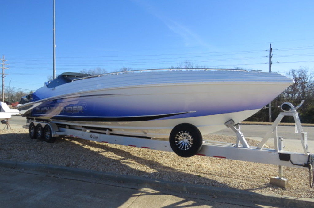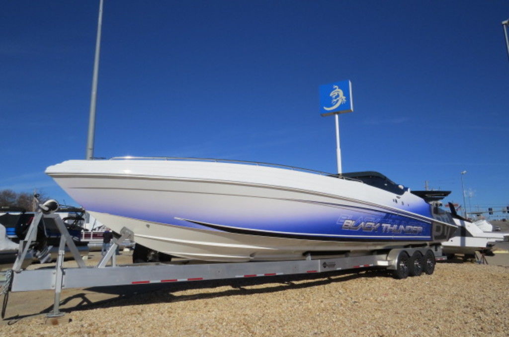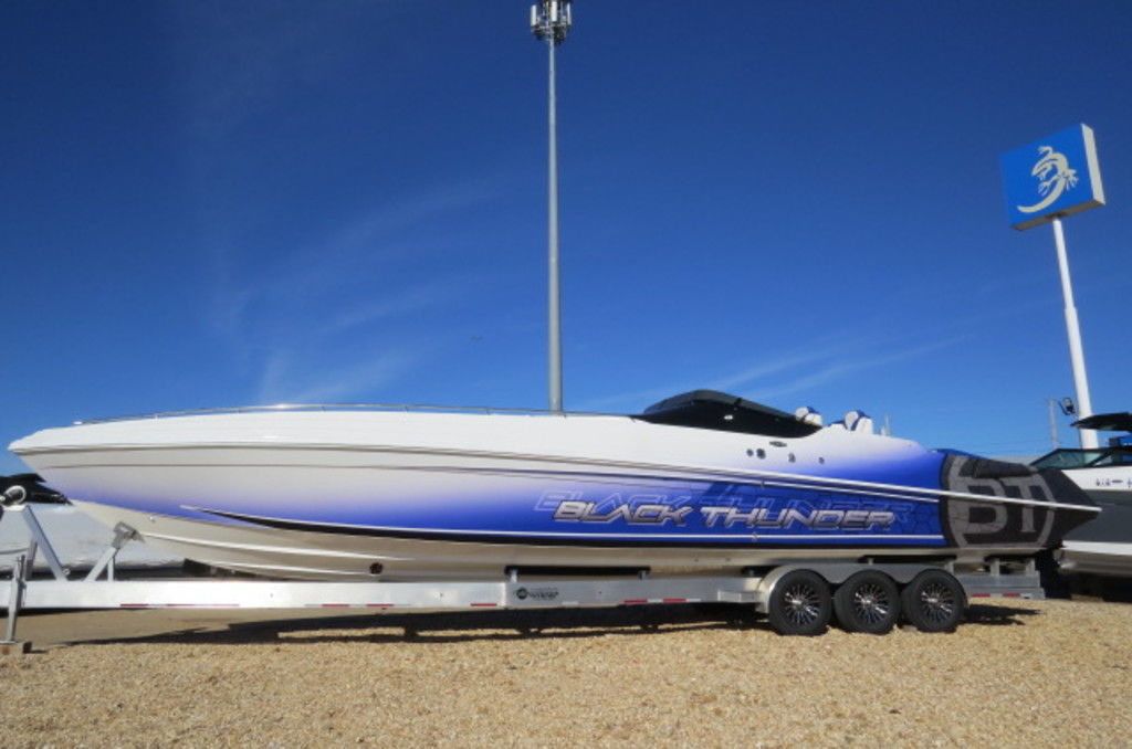 Less that 49 hours on this boat! True to Black thunder this 43 Raised Deck has huge head height in the cabin 6 FT-10 inches. This Price includes the custom Trailer!