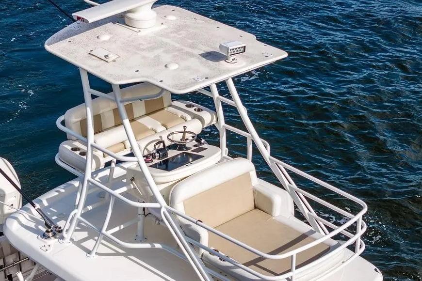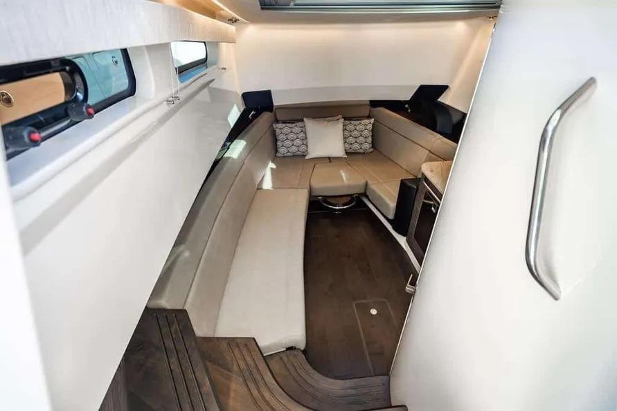 Layout and finish deliver Boston Whaler’s flagship experience, helm seating for six that flips forward or aft, a push-button sunshade, SeaDek underfoot, and a bright cabin with V-berth, enclosed head, and rain-shower. Add the upgraded helm screens, 55″ radar, and half tuna tower, and you’ve got a turn-and-go platform for offshore runs or refined family days.
